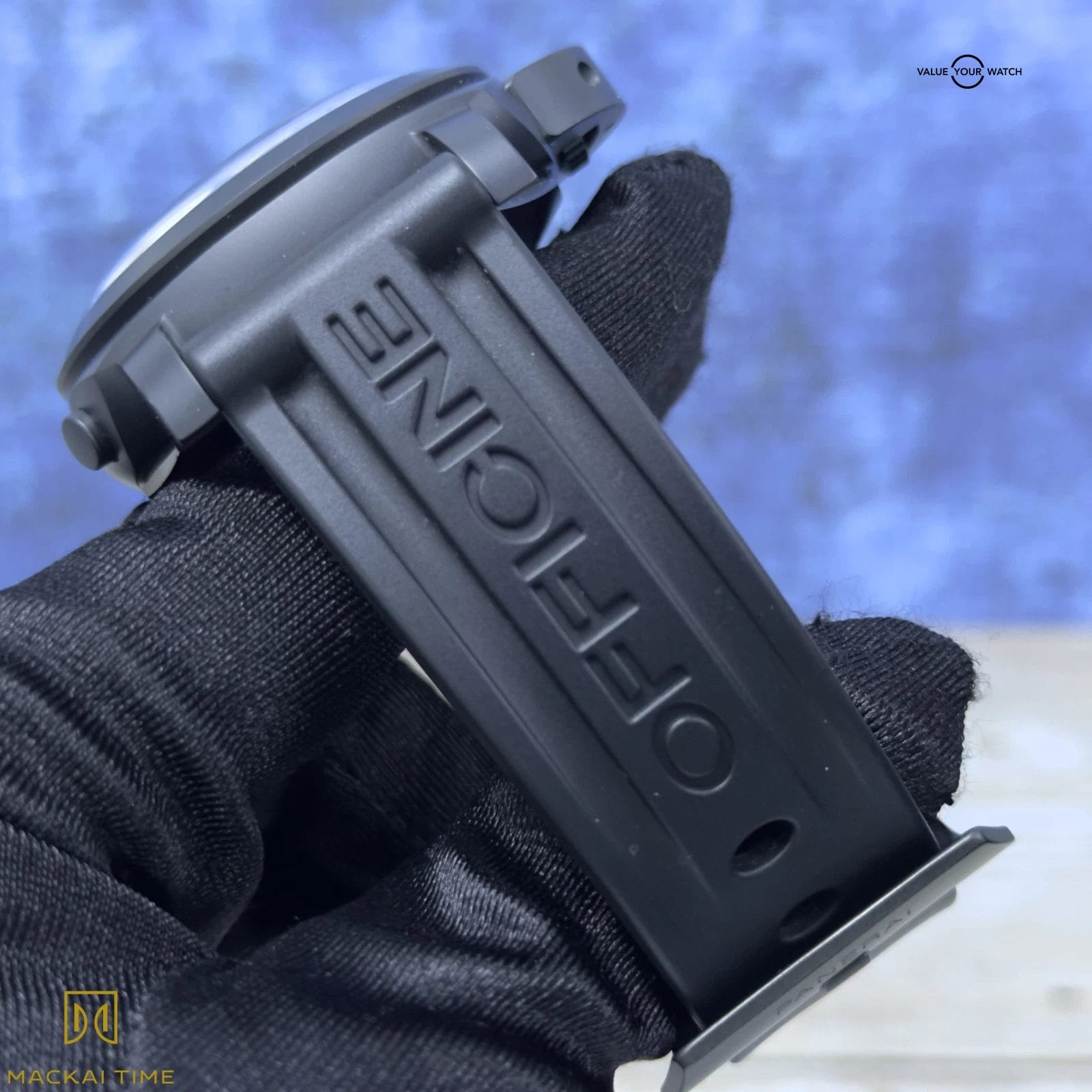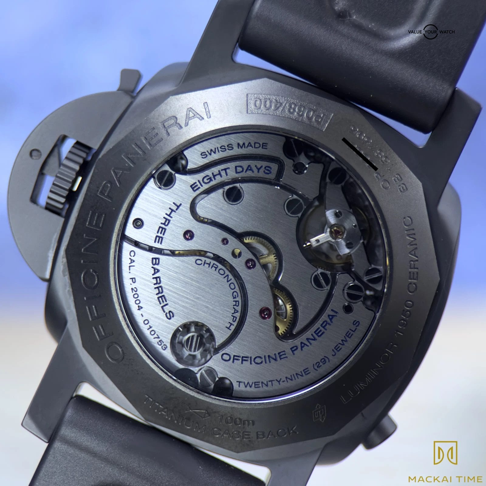 Inside beats Panerai’s in-house P.2004 hand-wound movement, featuring an 8-day power reserve, GMT function, and a monopusher chronograph — controlled through a single pusher integrated into the crown guard system.