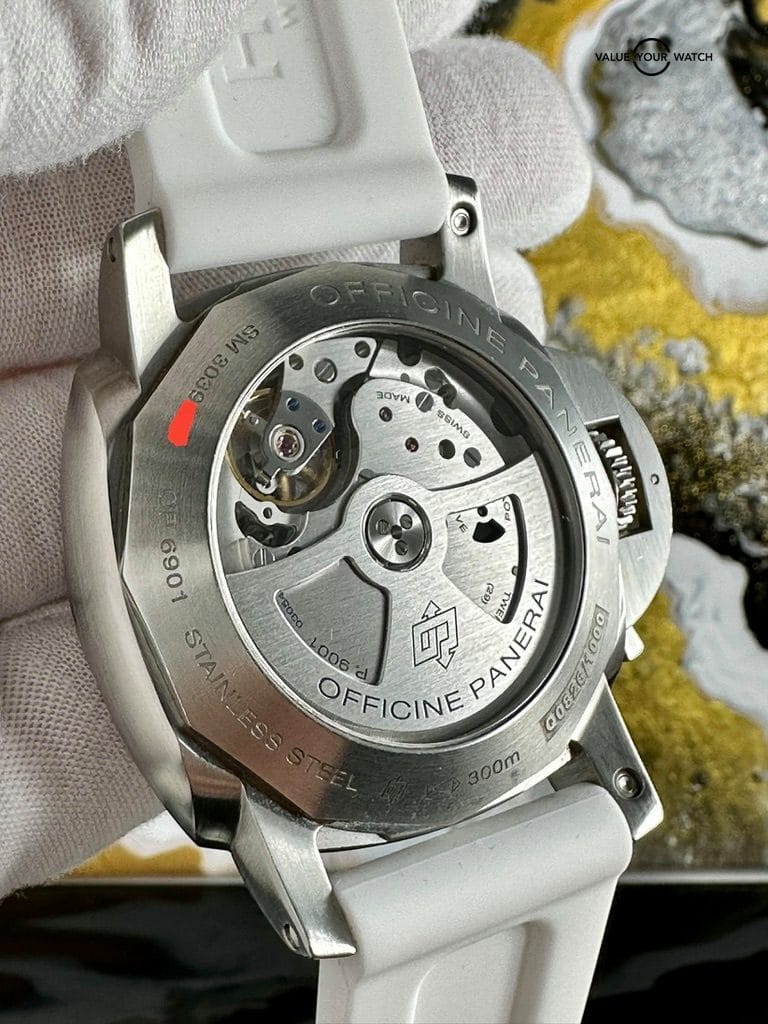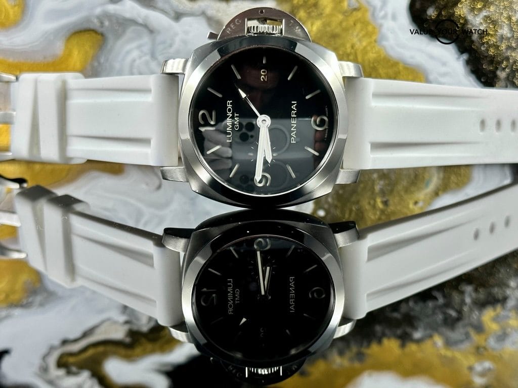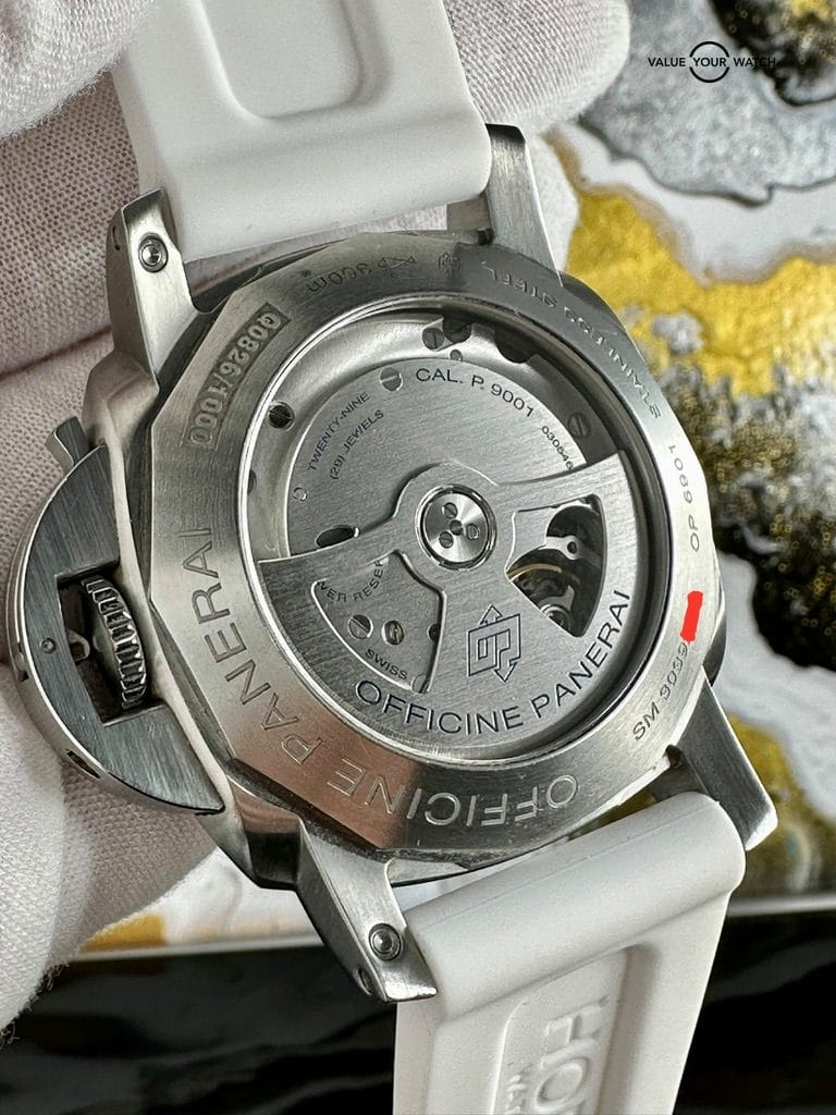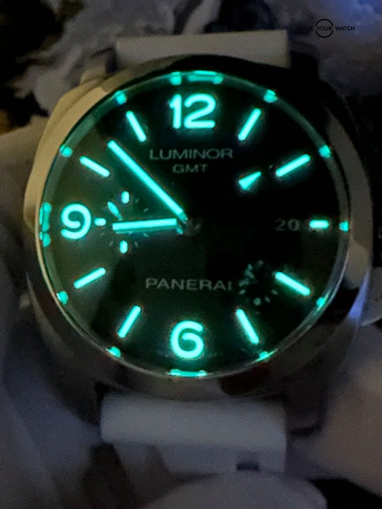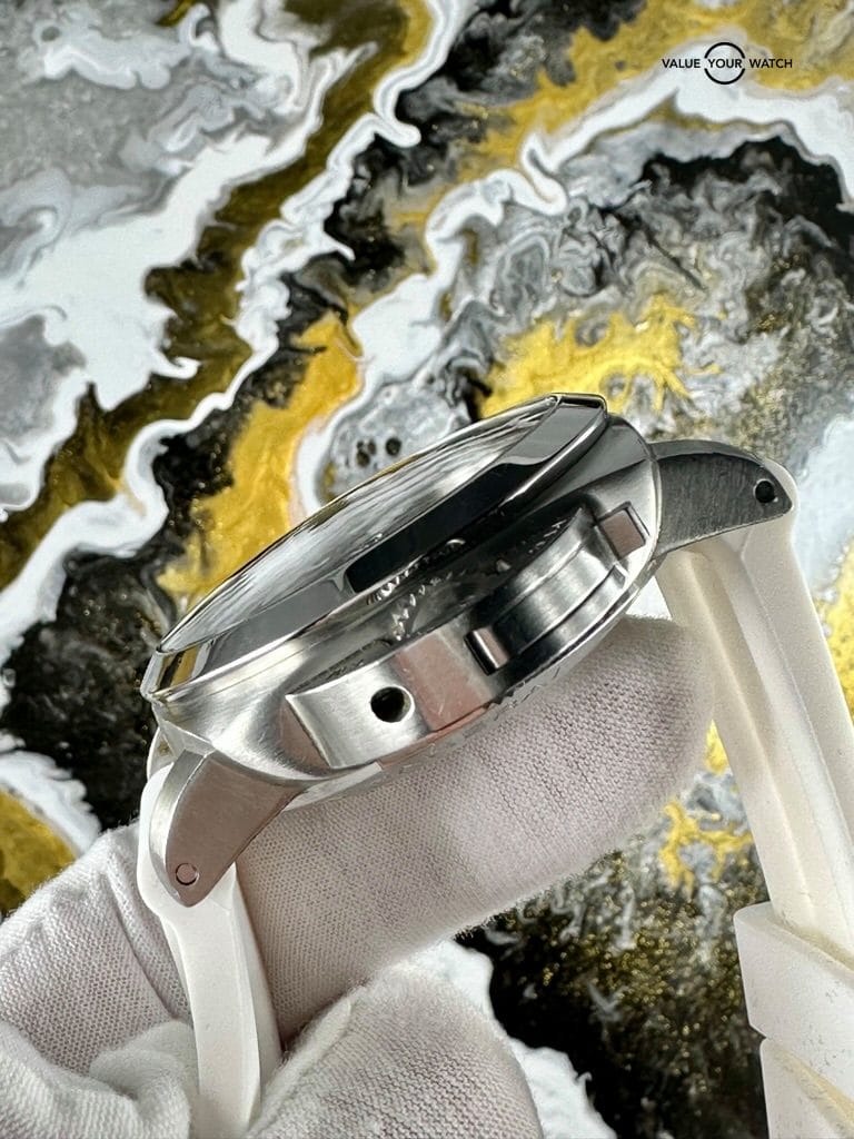 The watch comes complete as shown in the photo – Panerai outer box, display box, booklets with serial/model number, both original straps plus choice of white rubber or brown leather aftermarket strap, and strap changing tools. Shipping is FedEx 2nd day insured.