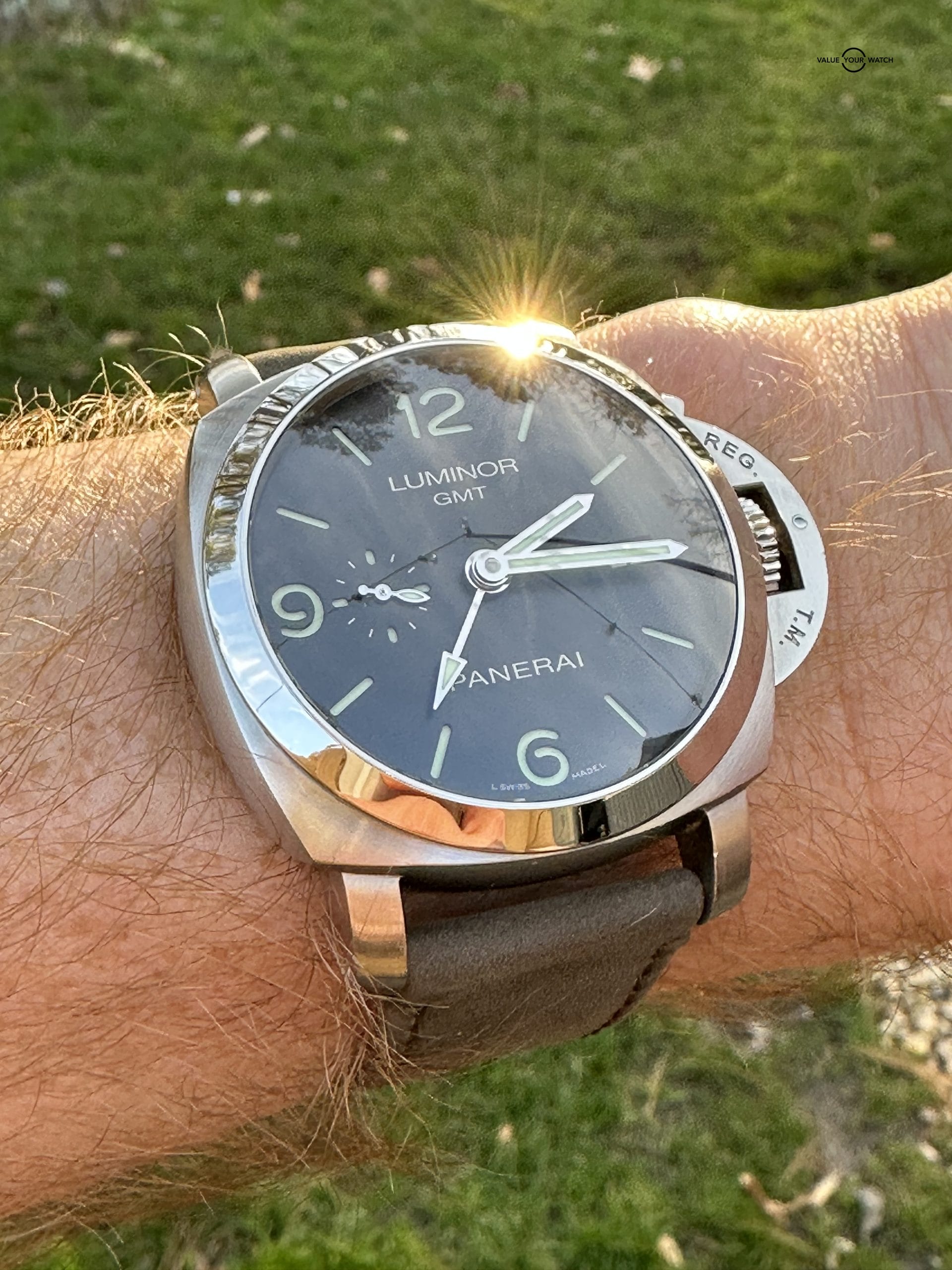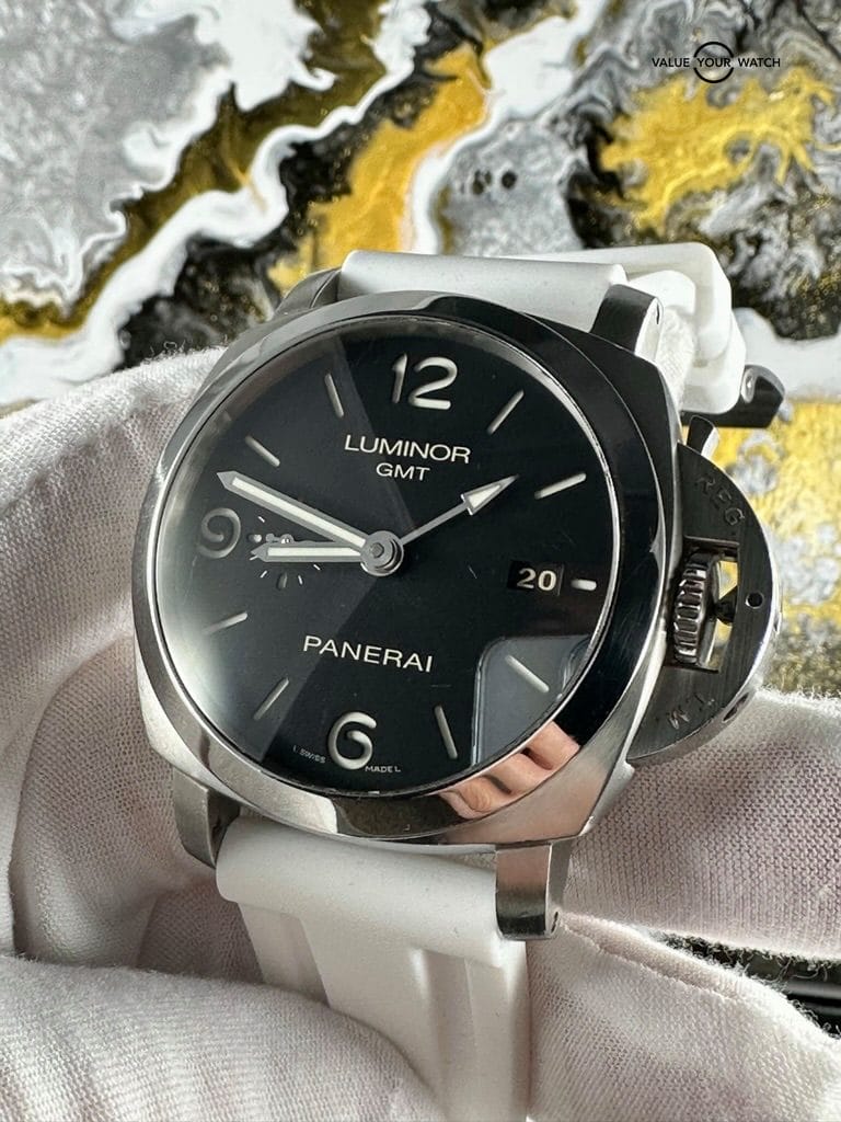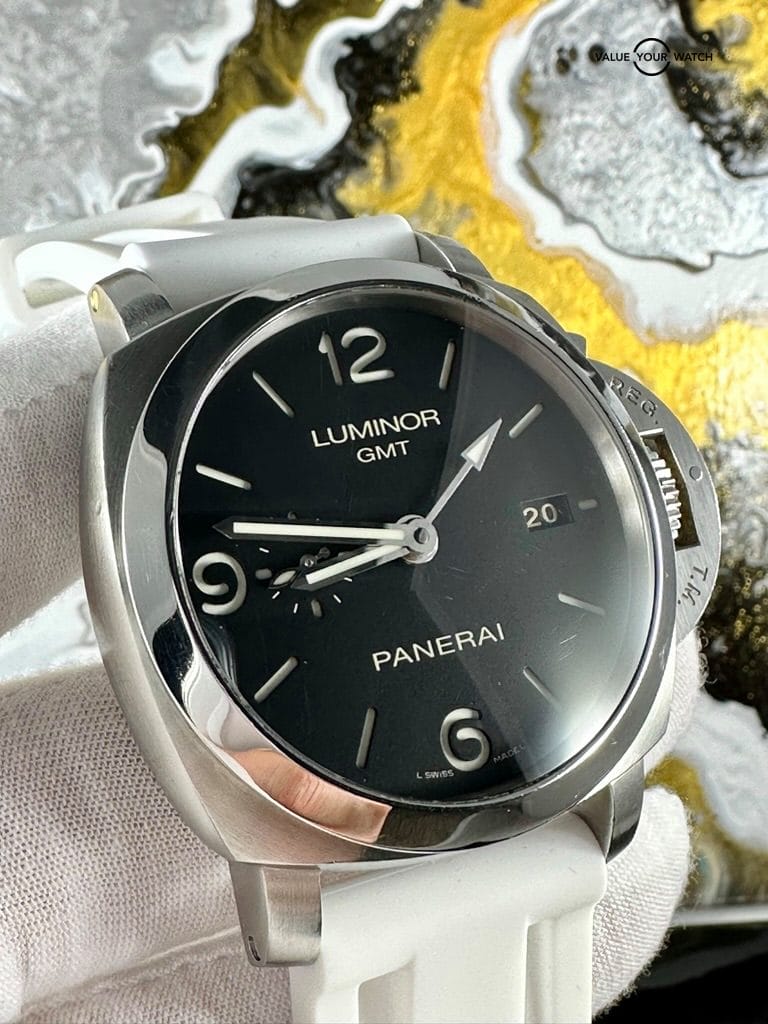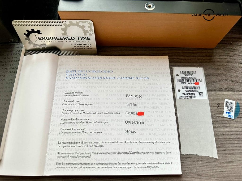 The watch comes complete as shown in the photo – Panerai outer box, display box, booklets with serial/model number, both original straps plus choice of white rubber or brown leather aftermarket strap, and strap changing tools. Shipping is FedEx 2nd day insured.