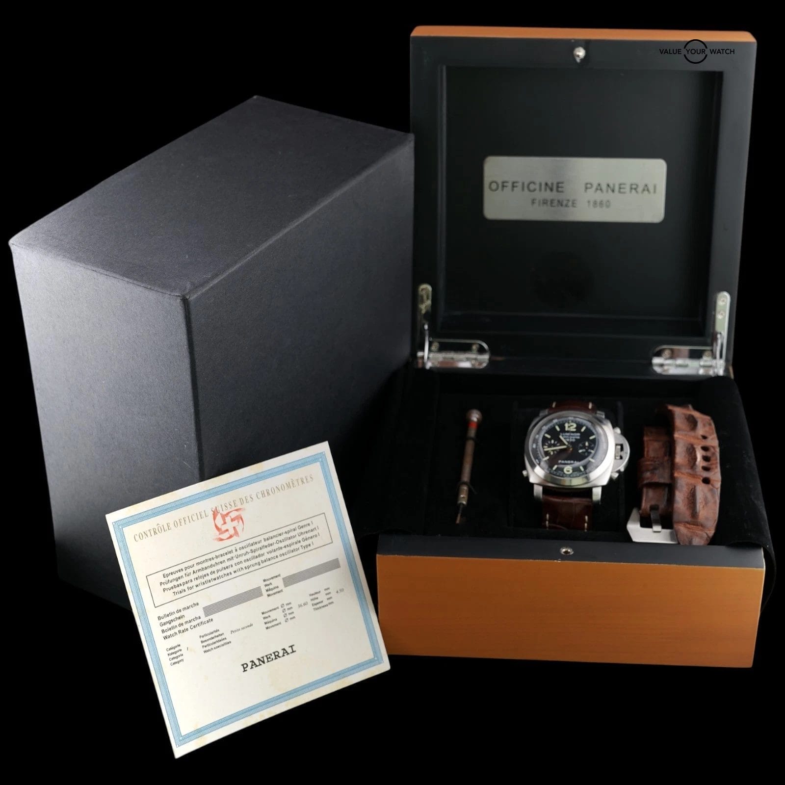 Included Watch, Panerai strap & buckle, extra brown off-brand strap & buckle