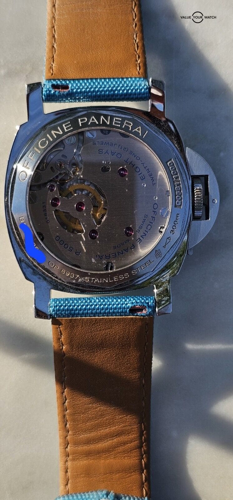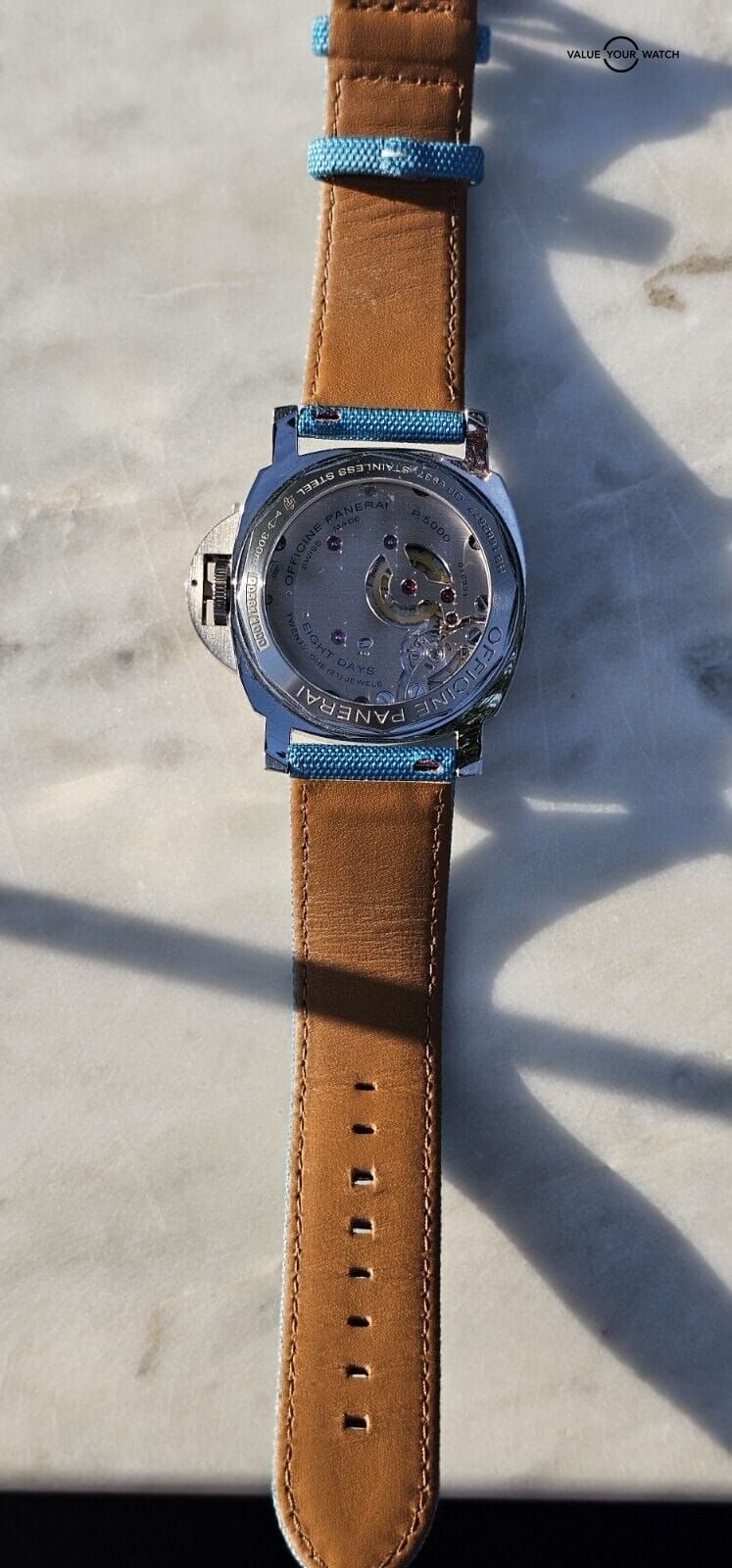 Manual-Wind Movement: Inside the Luminor Base beats the P.5000 caliber, a manual-winding movement developed by Panerai. It offers an impressive power reserve of 8 days, ensuring reliable timekeeping.