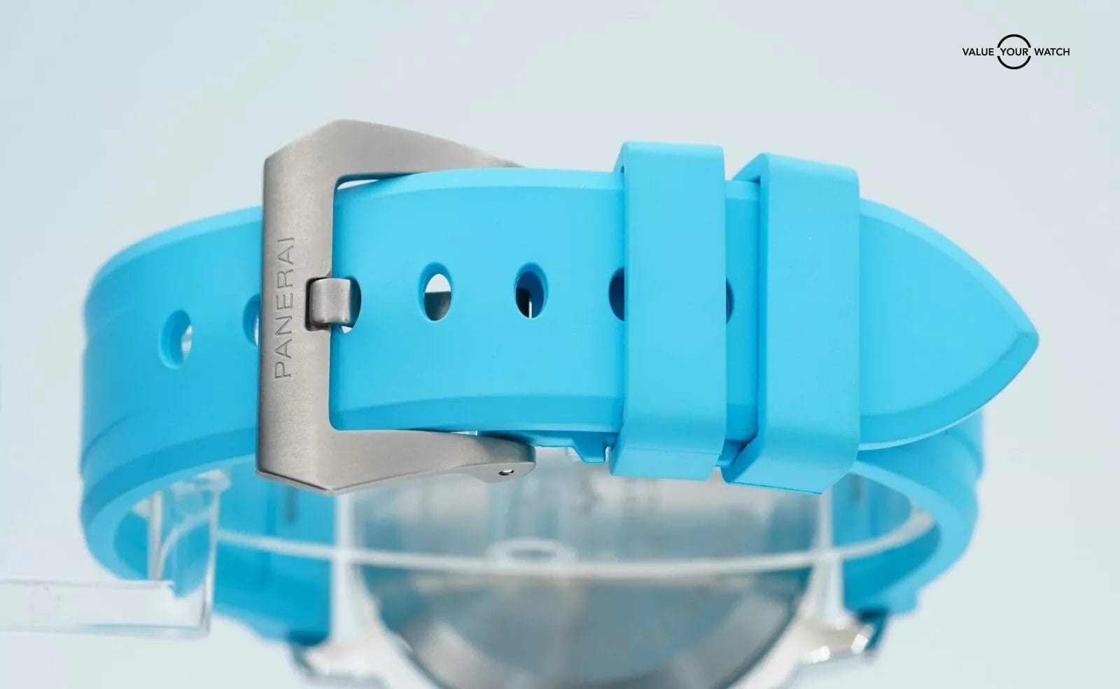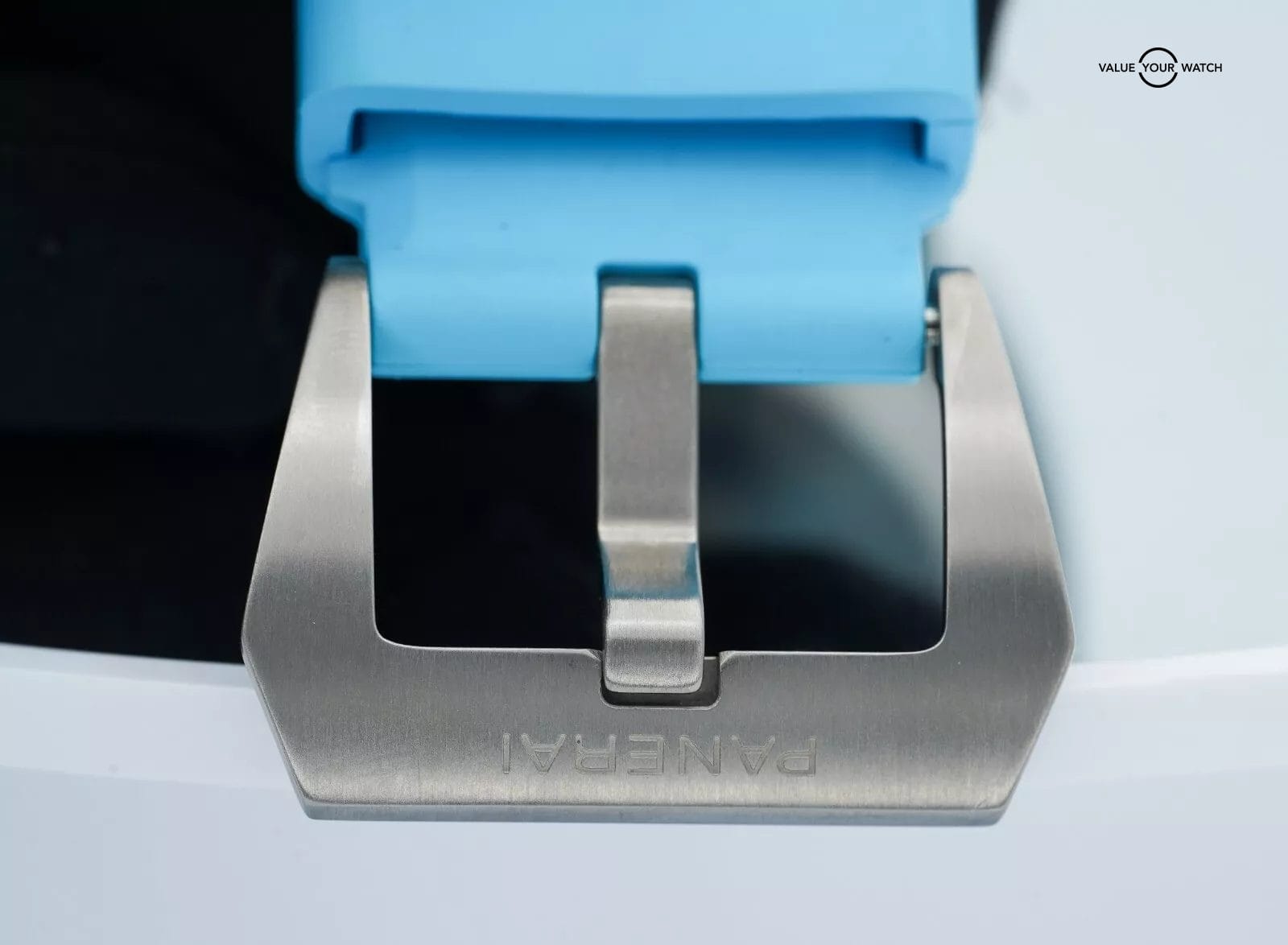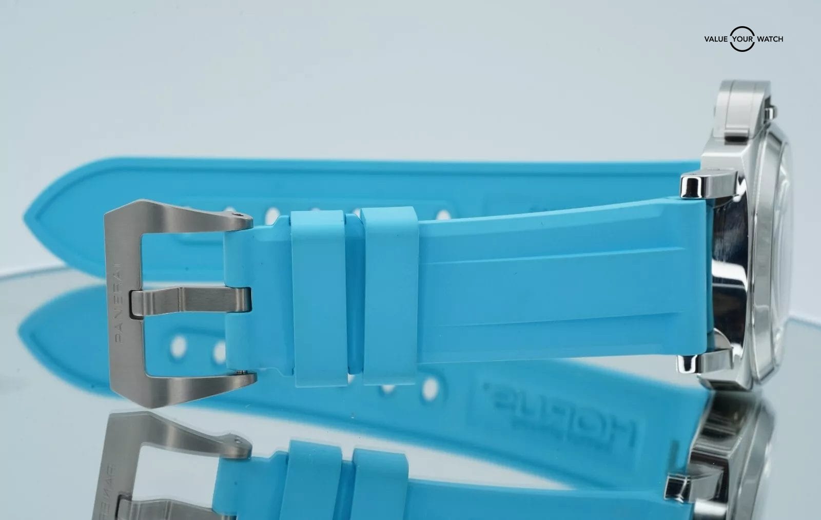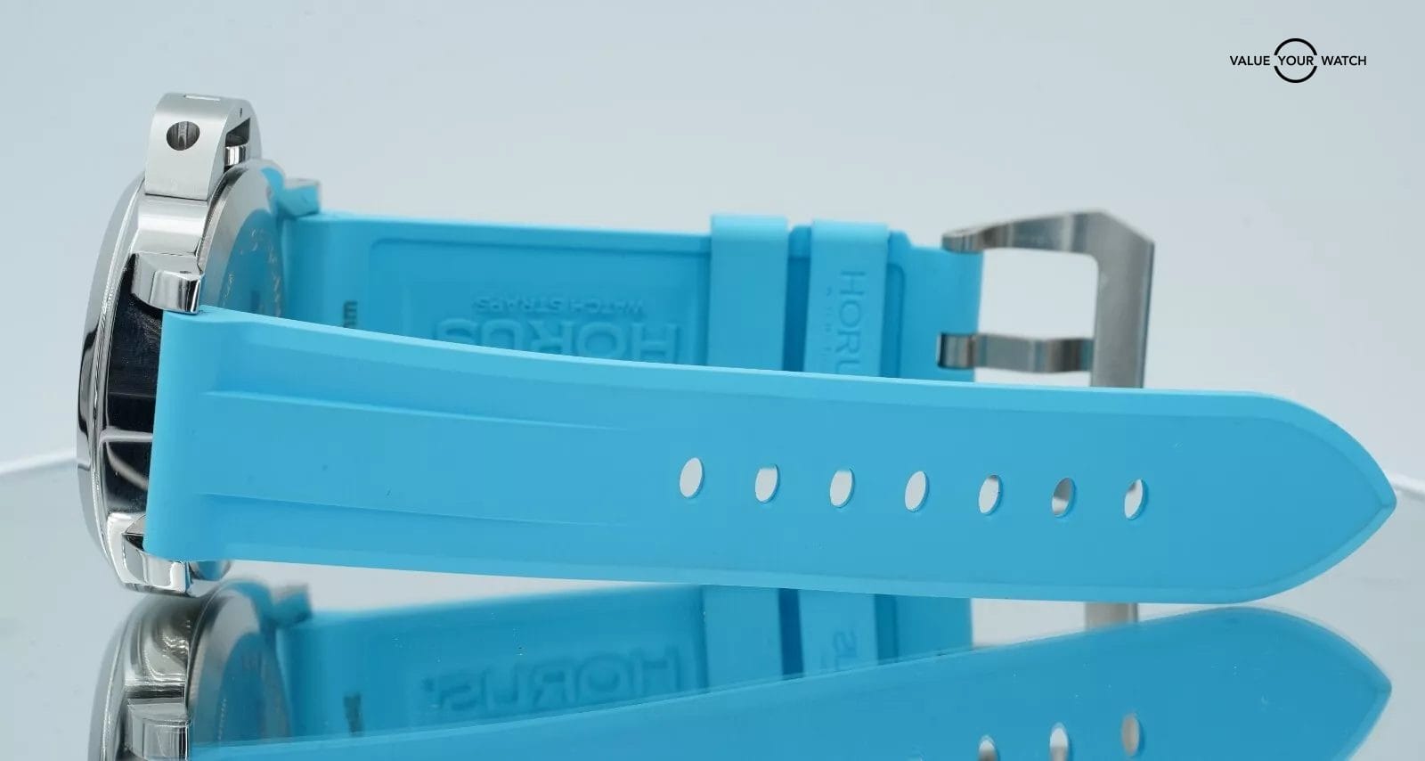 This beautiful timepiece comes as a watch only sale. The watch is in excellent pre-owned condition. It comes fitted on a Horus Miami blue rubber strap with Panerai buckle. The sides of the case have a few light marks but nothing substantial. Pay close attention to the pictures as they accurately describe the condition. Mechanically the watch is functioning as it should. Serial numbers and names are blurred in photos only for privacy reasons.