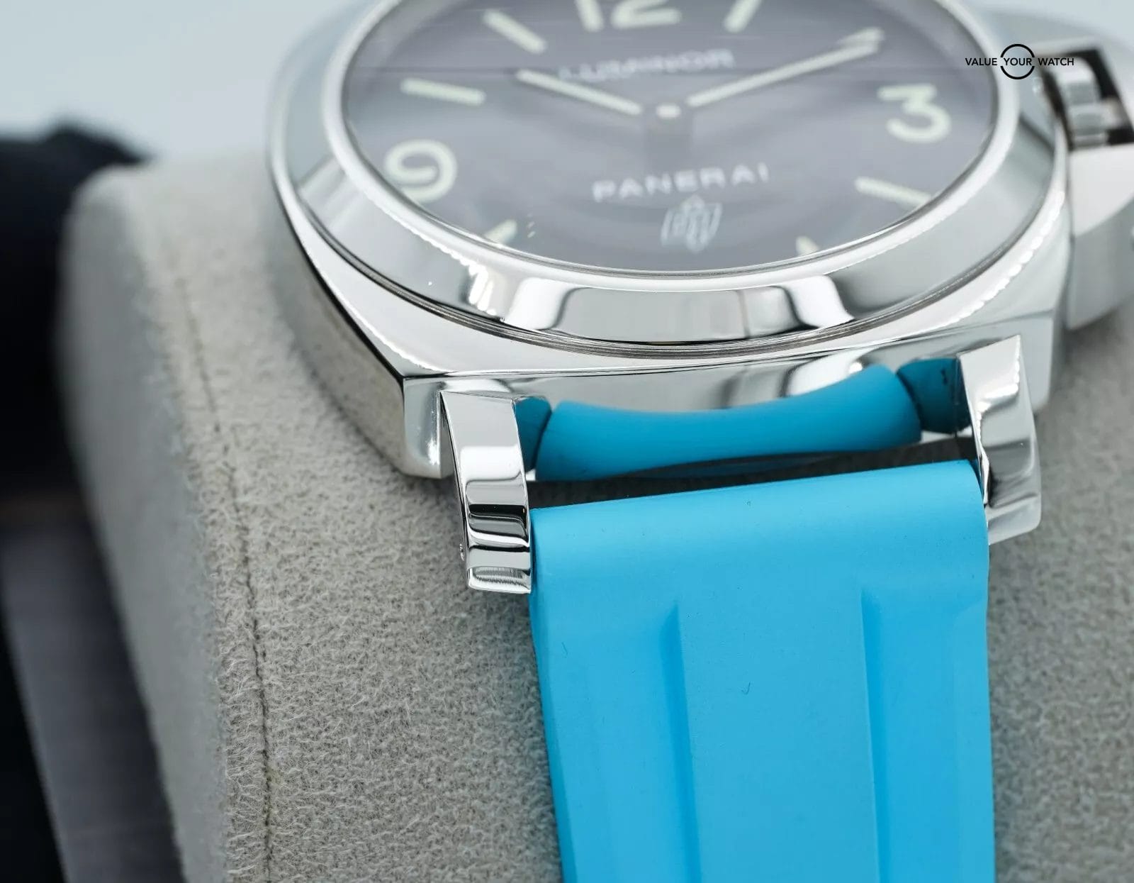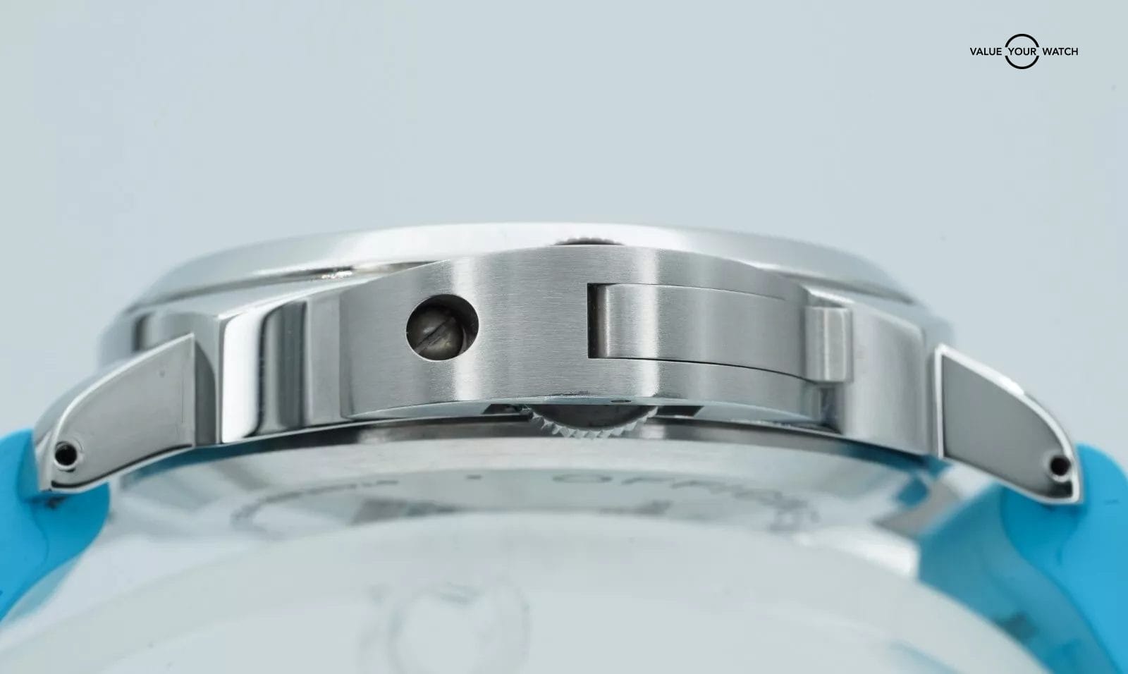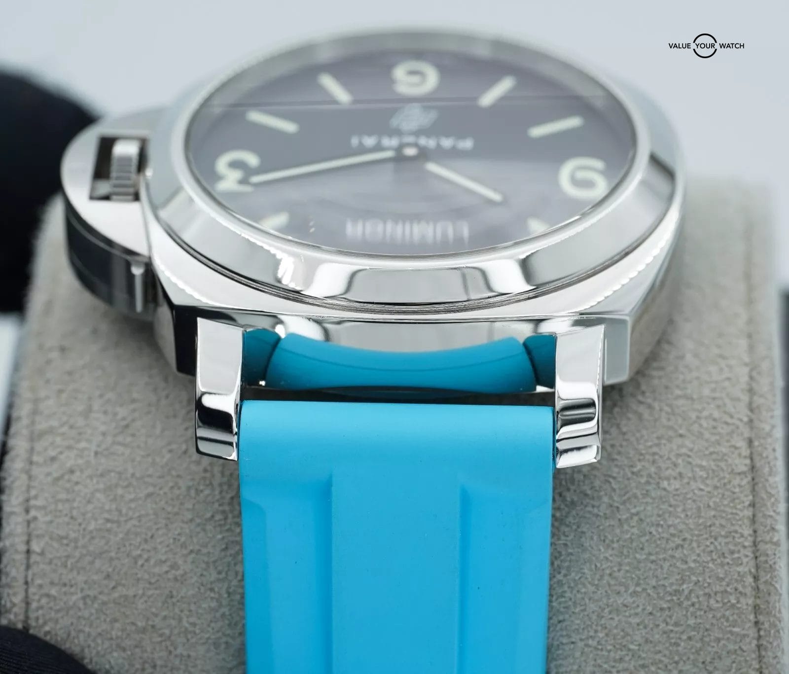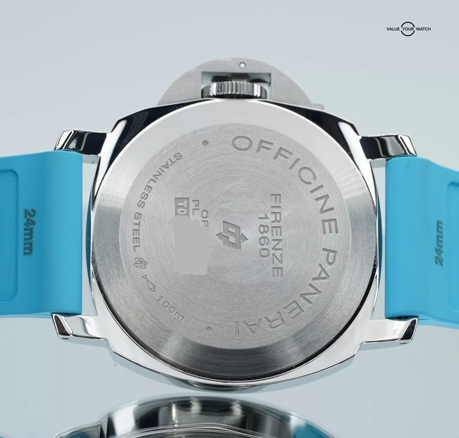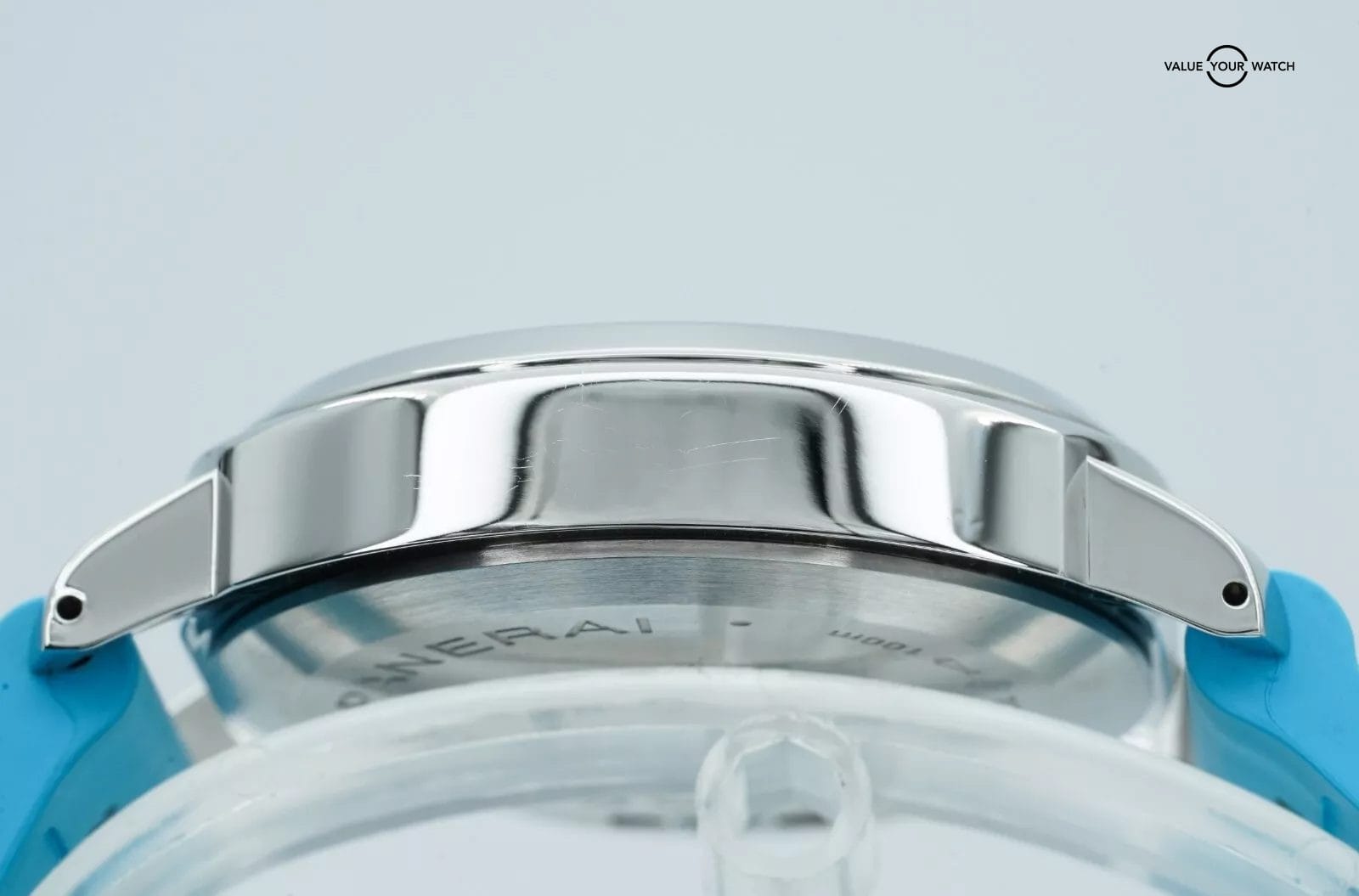 This beautiful timepiece comes as a watch only sale. The watch is in excellent pre-owned condition. It comes fitted on a Horus Miami blue rubber strap with Panerai buckle. The sides of the case have a few light marks but nothing substantial. Pay close attention to the pictures as they accurately describe the condition. Mechanically the watch is functioning as it should. Serial numbers and names are blurred in photos only for privacy reasons.
