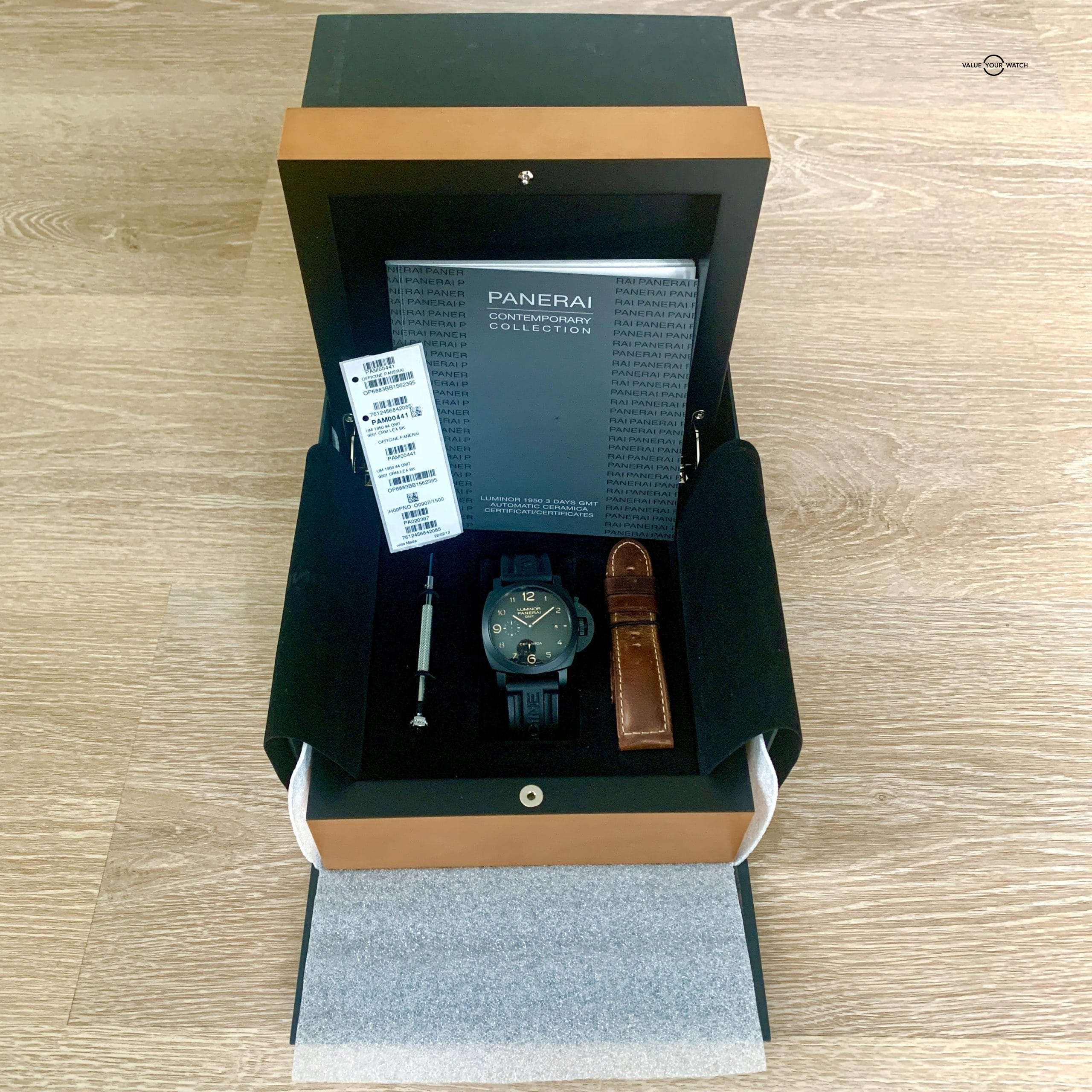 Set includes the original Panerai outer box/inner box, warranty certificate booklet, OEM brown leather straps, strap changing tool, original identification stickers.