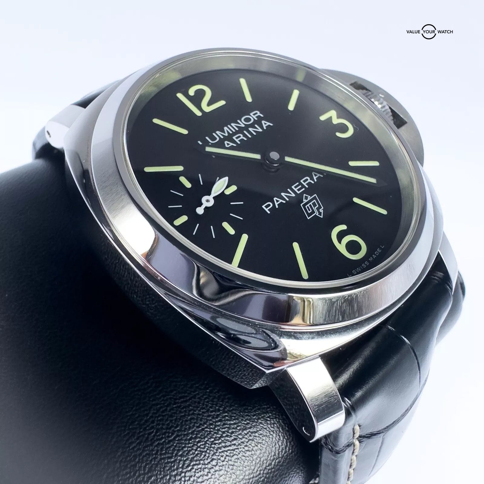 Here we have the Panerai Luminor Logo Marina PAM 776 – a fusion of style and substance. Crafted from stainless steel, its bold design showcases Panerai’s iconic crown-protecting bridge and luminous features for unparalleled visibility. Powered by the reliable caliber P.6000 movement, it boasts an impressive 72-hour power reserve and water resistance up to 100 meters.This watch is in excellent condition and comes as a full set which includes Original Boxes, Warranty Card, Instructions Book, Bezel Protector, and 2 black leather Panerai straps. More pictures are available on request!Please contact me with any questions, I seek a transparent and pleasant experience for everyone!I ship with FedEx overnight & fully insured from New Hampshire.A 14 day money back guarantee is provided as well, assuming the watch is in the same condition as when shipped.You can follow my collection – itsmackaitime – on I_GA Brief History:When Guido Panerai, grandson of brand founder Giovanni Panerai, secured a contract with the Italian Navy to provide luminescent equipment, Officine Panerai moved from being just a manufacturer of diving instruments to becoming one of the most influential watchmakers in the world. The company’s prized invention was a zinc sulphide and radium bromide concoction which they patented as ‘Radiomir’. The radium, a radioactive substance that releases alpha and gamma rays as it decays, reacted with the zinc sulphide in such a way that made it glow. The company used its radium-based luminescent paint on various devices such as night-sights, compasses, depth gauges and calculators. Guido’s son Giuseppe took over in 1934, shortly before the Navy requested that the brand make a robust diving watch that was as readable in low light as the company’s other instruments. As the watches were to be used underwater and at night by pilots of single-man submarines, the hands and markers needed to be much brighter than for use on land. The watchmaker provided two solutions to this problem—the first was to layer a dial that was completely covered with a thick coating of luminescent paint with a secondary dial that had slots cut from it, and the second was to hollow out channels from a dial in the shape of the markers, allowing thicker quantities of luminescent paint to be used. Both of these ideas had a satisfactory result, particularly at sizes that were unconventionally large for the time. The engine that powered Panerai watches was a tried-and-tested Rolex movement, and was mounted in a steel oversized cushion case. Lugs were soldered to the case to allow fitment of a strap, making the watch wearable on the diver’s wrist. Called the Radiomir after the radium that powered the luminescent paint, it was the birth of a design icon. It was tested in 1936 by the First Submarine Group, and was a resolute success. Following the Second World War, the Radiomir evolved fixed lugs and the famous patented crown locking device. The Radiomir became the Marina Militare which, following the introduction of a less dangerous tritium-based radioactive luminescent material called ‘Luminor,’ became the Luminor. An enormous version built for the Egyptian Navy, the Egiziano, came in the 1950s, which later inspired the Submersible. A chronograph, the Mare Nostrum, stalled at the prototype stage. There were no Panerai watches available for civilians until 1993, when the Luminor and the Mare Nostrum were released in limited runs. Their success attracted the interest of the Vendome Group, now the Richemont Group, which purchased the watchmaker. The distinctive and immediately recognisable style of the brand’s watches may have evolved for functional reasons, but that hasn’t stopped Panerai from amassing a loyal following. It has proven that just because form follows function, it doesn’t necessarily mean something can’t look good too.Features:BOX/PAPERSYes/ YesBRANDPaneraiPRODUCTION YEAR2019MODEL NUMBERPAM00776SERIESLuminorCase ShapeCushionBEZELStainless Steel DomedMOVEMENTManual-WindJewels19CalibreP.6000Power Reserve72 HoursCASE BACKSolidMATERIALSteelCASE SIZE44 mmCASE SHAPERoundLug Width24 mmDIAL TYPEAnalogDIAL COLORBlackDIAL MARKERSIndex / ArabicHANDSLuminousBAND MATERIALLeatherCLASPTang BuckleBRACELETLeather StrapCOUNTRY OF MANUFACTURESwitzerlandWater Resistance100 Meters (330 Feet)