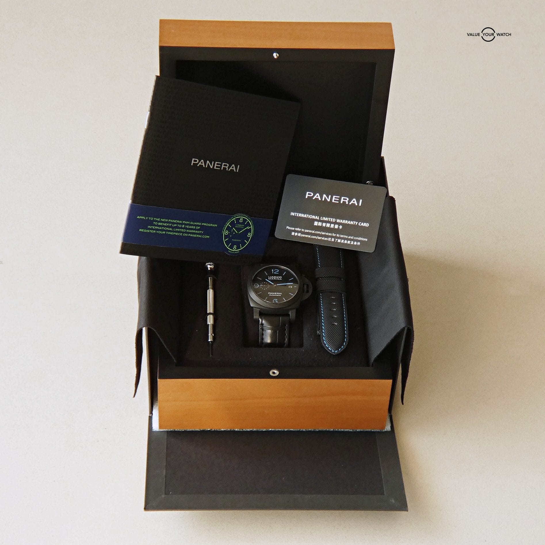 Comes in a full set on a Panerai black leather strap with an extra blue thread strap.