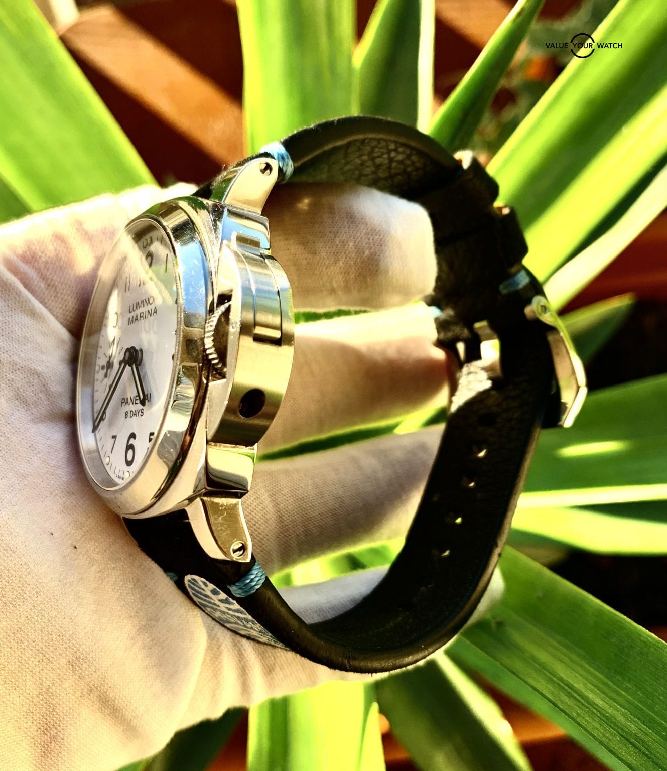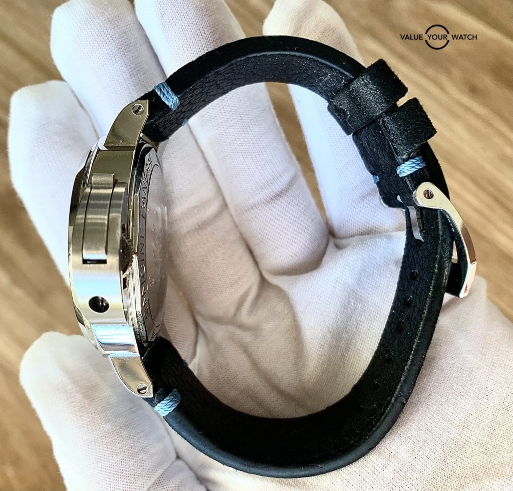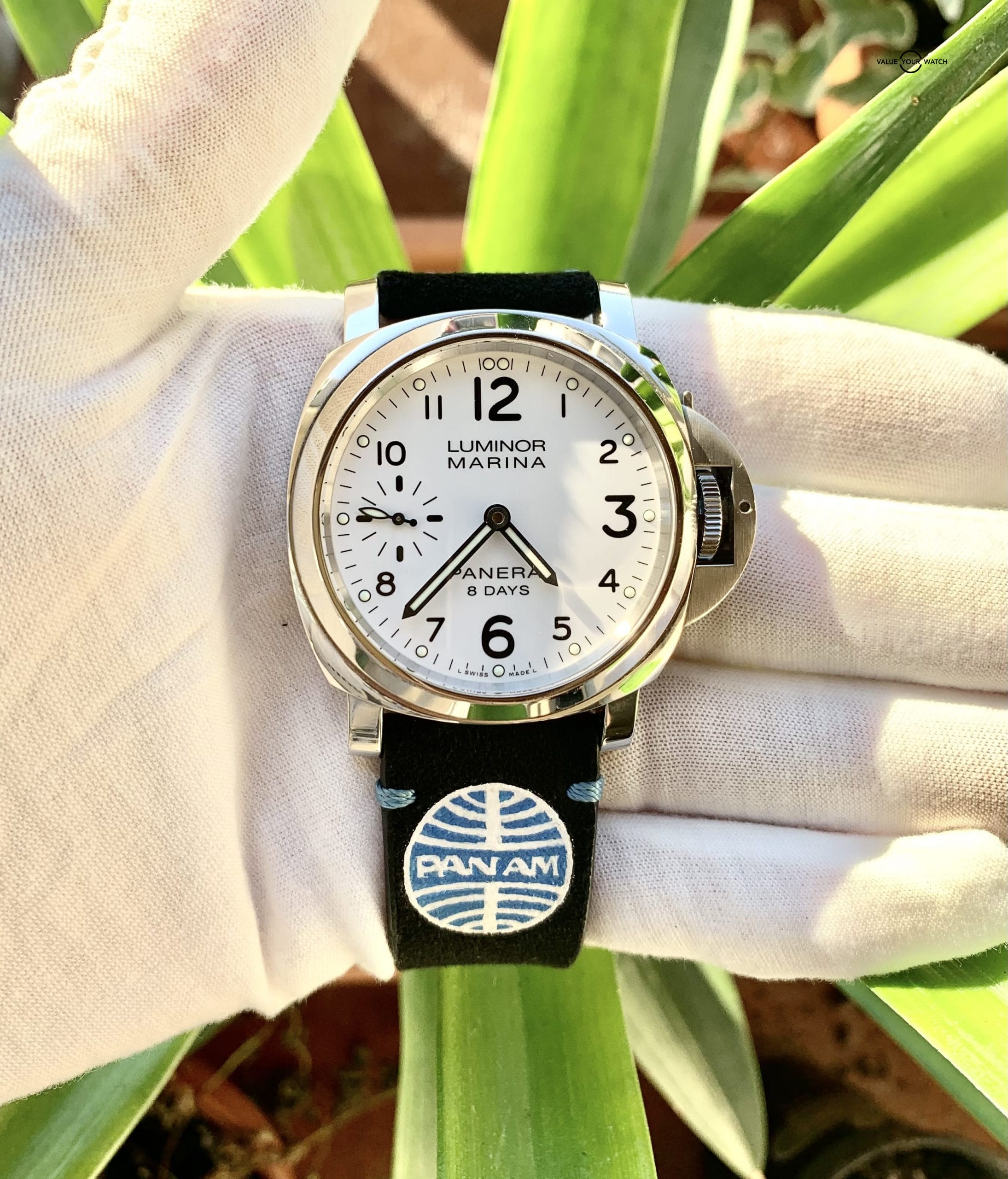 Panerai Luminor Marina 8 days 44mm, (PAM 00563), white acciaio, comes with a sharp, hand painted PAN AM Panerai strap as well as original rubber strap, box, papers and outer box. It is manual winding, 192 hours (8 Days). It comes together beautifully with a stainless steel case, sapphire crystal and luminous hands. Great condition!