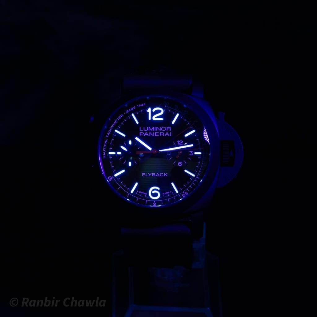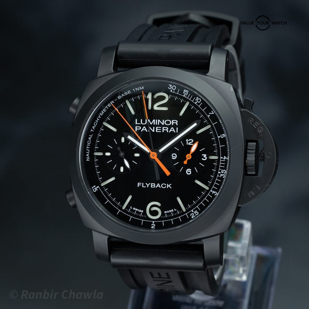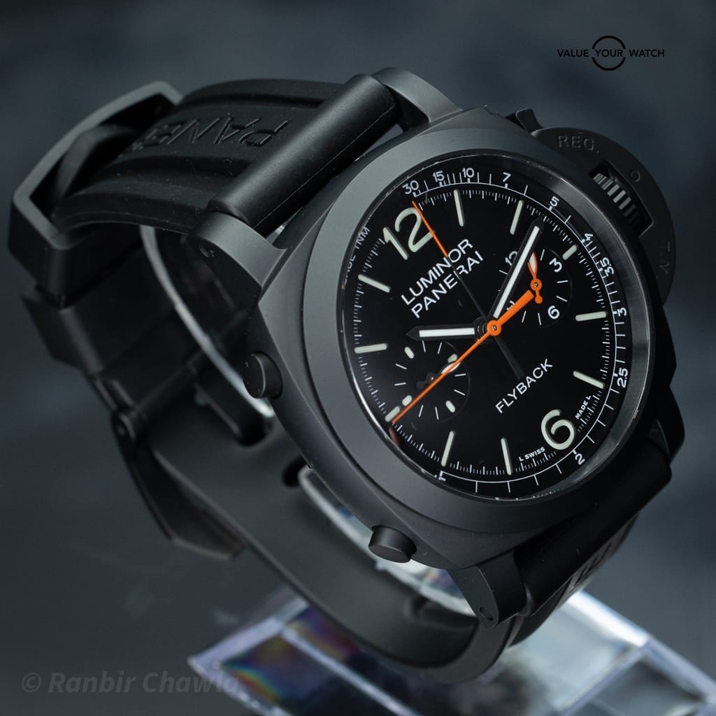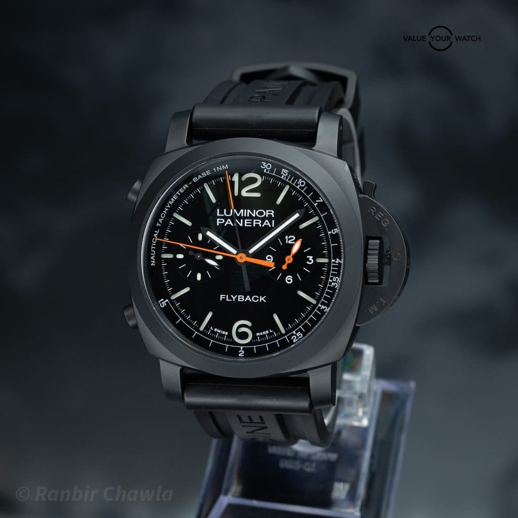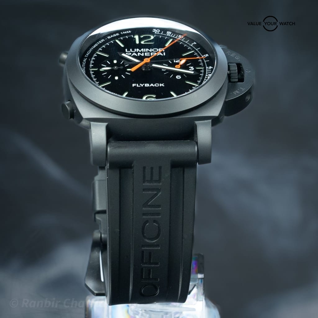 The watch features a black sandwich dial with luminous numerals and a bicompax chronograph layout. Itβs powered by the in-house Panerai P.9100 flyback automatic chronograph movement, offering a 72-hour power reserve and operating at 28,800 vibrations per hour (4 Hz). The flyback function allows instant reset and restart of the chronograph with a single pusher.
