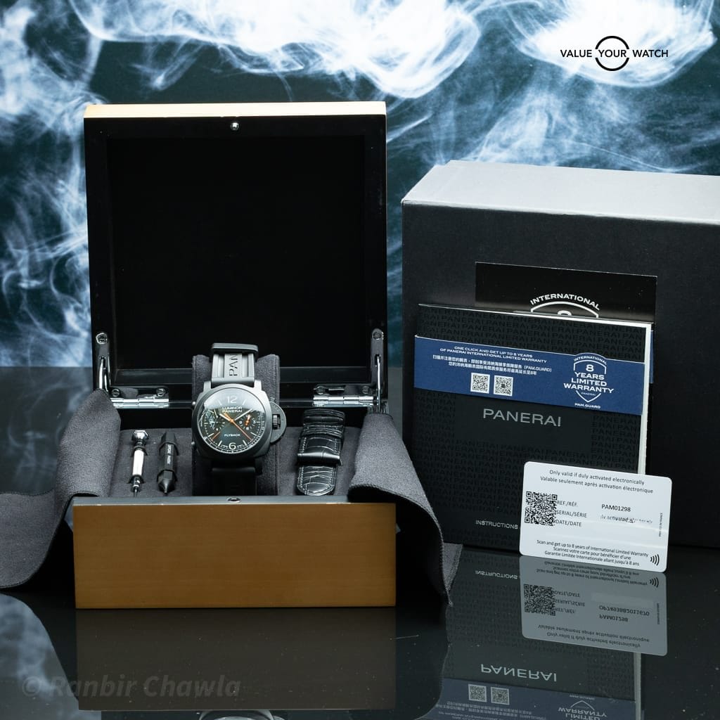 This PAM01298, part of the Luminor Marina Chrono Flyback collection, is a 2024-dated piece in excellent condition. It comes as a full set with original box, warranty card, manuals, OEM black rubber strap, and an additional OEM black leather strap.