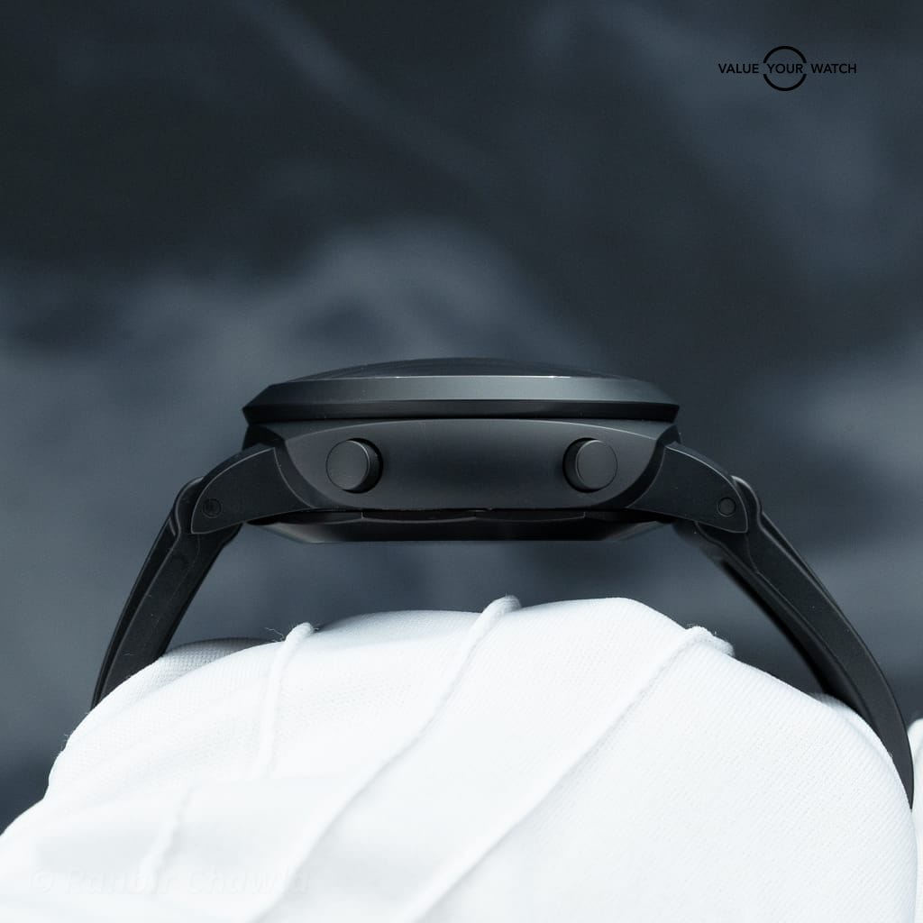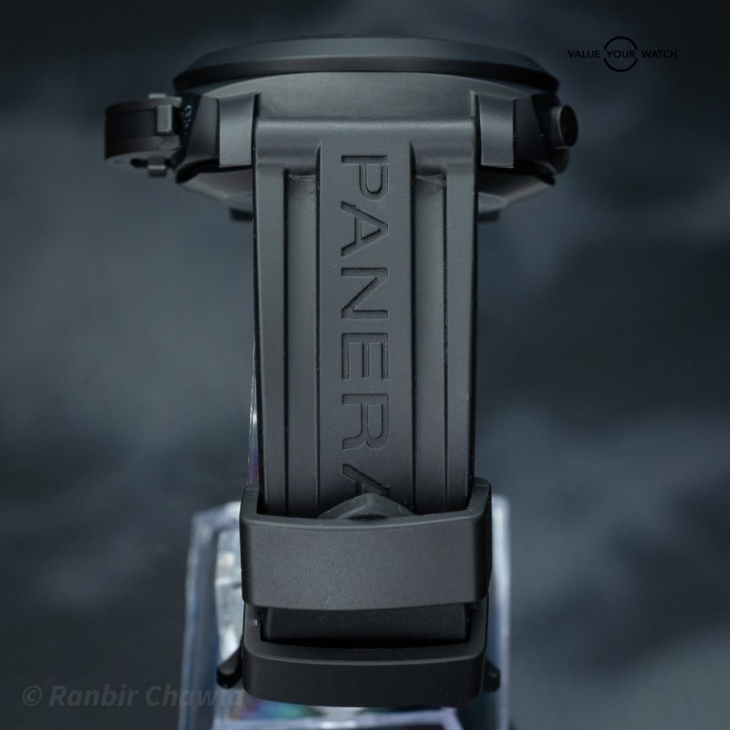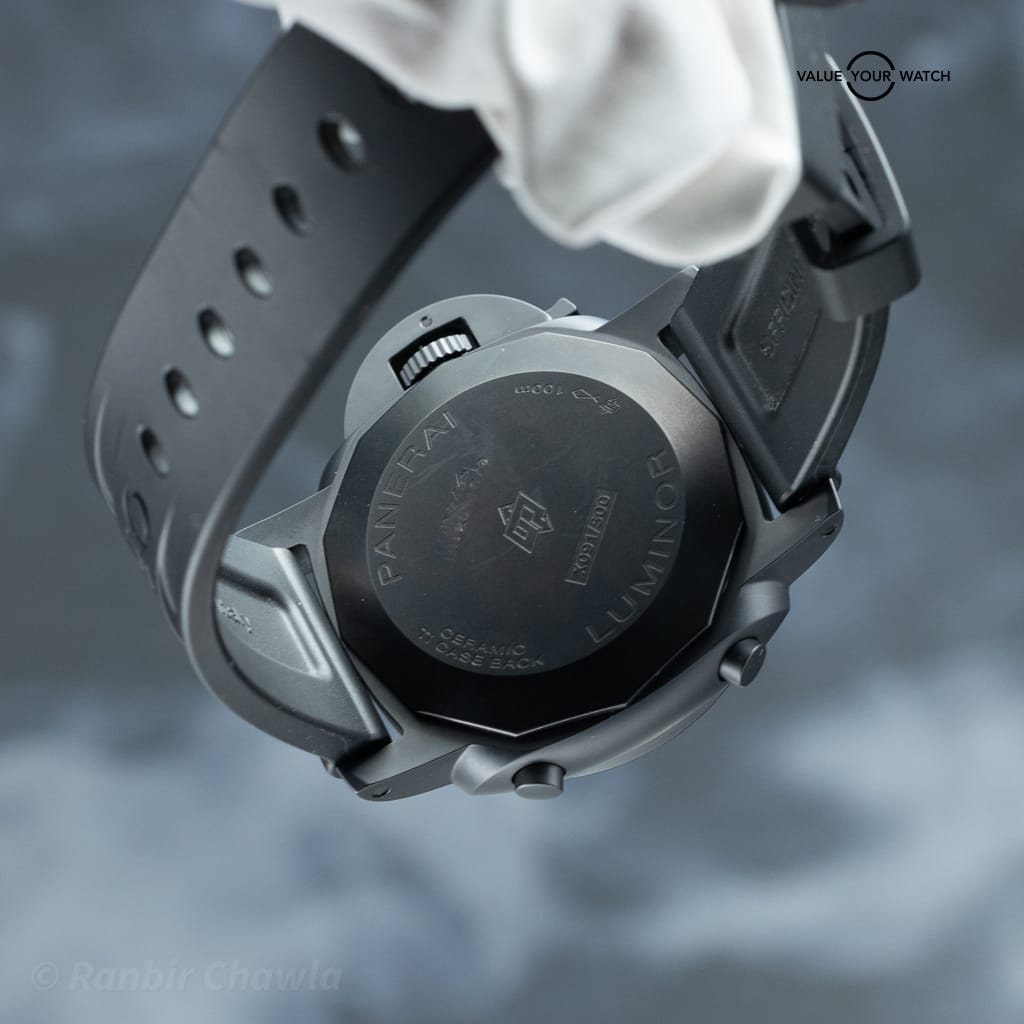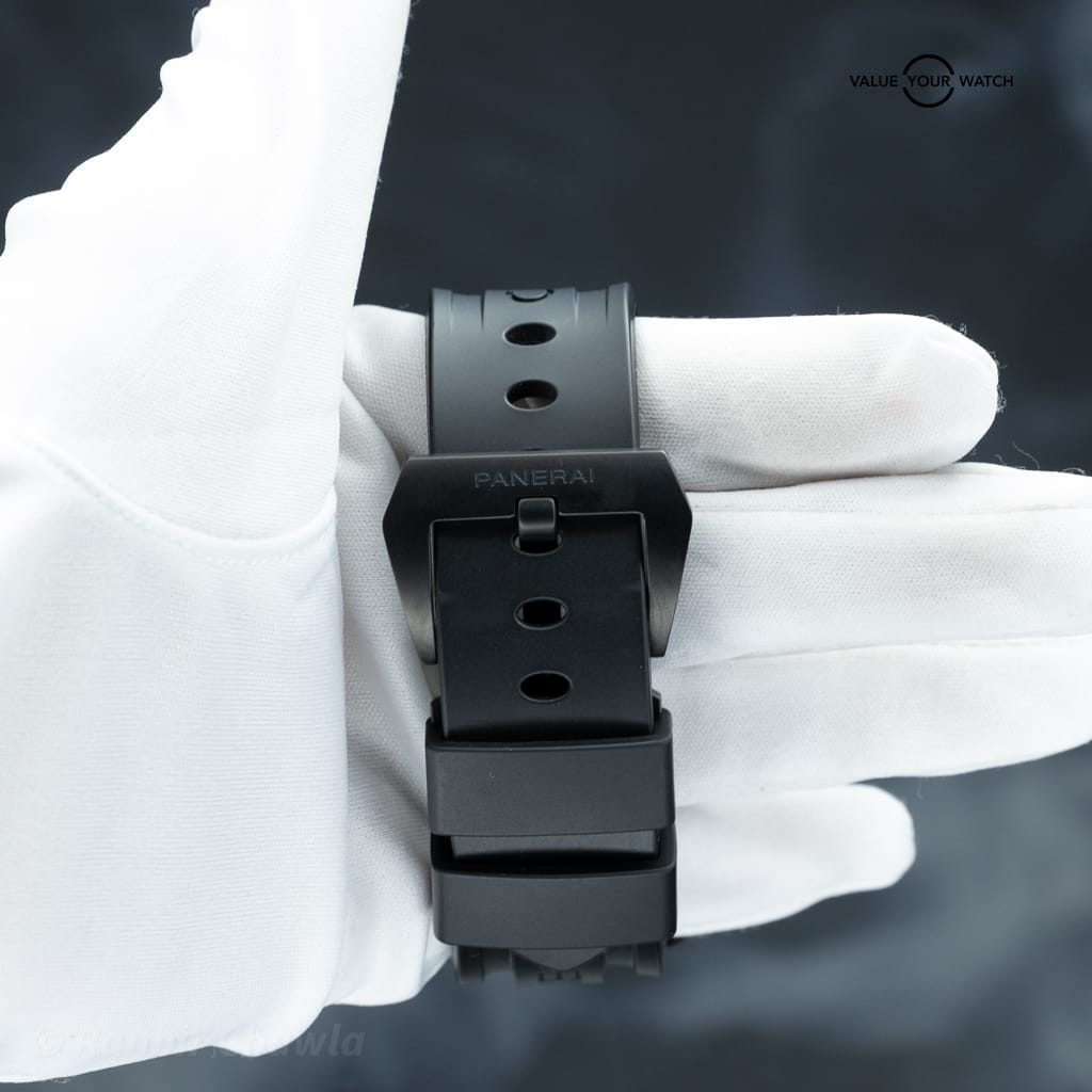 The case is constructed from matte black ceramic, measuring 44mm in diameter, and features Paneraiβs signature crown protector and tachymeter scale engraved on the bezel. With a sapphire display caseback and quick-release strap system, it delivers both technical sophistication and rugged design.