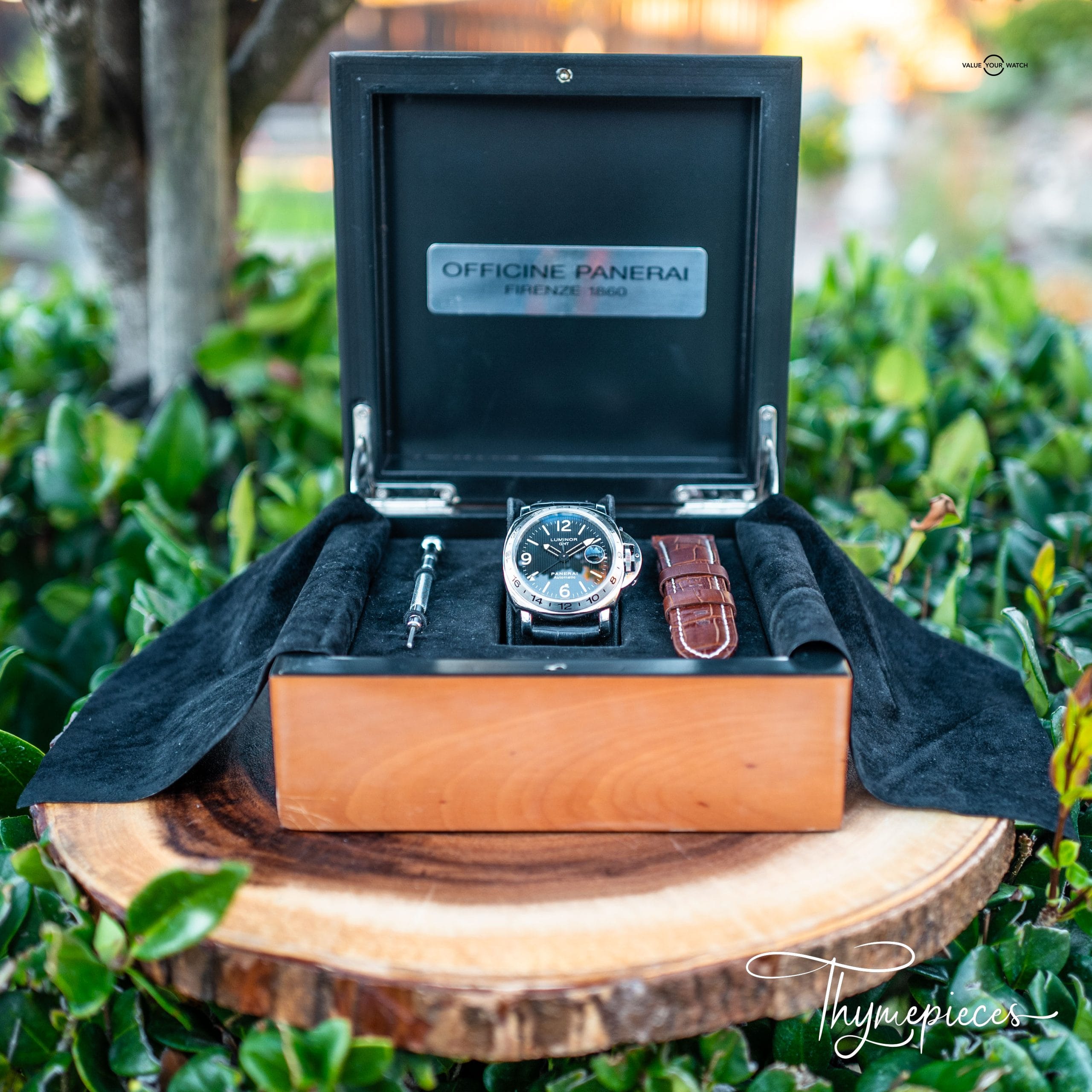 Paneristis will appreciate the original double box, original black strap, and most especially the cracked tritium on the minute hand.
