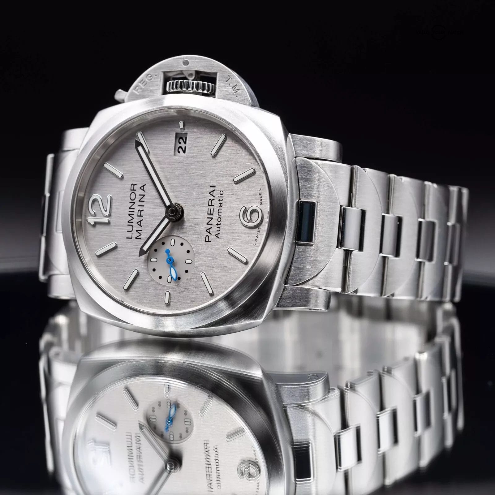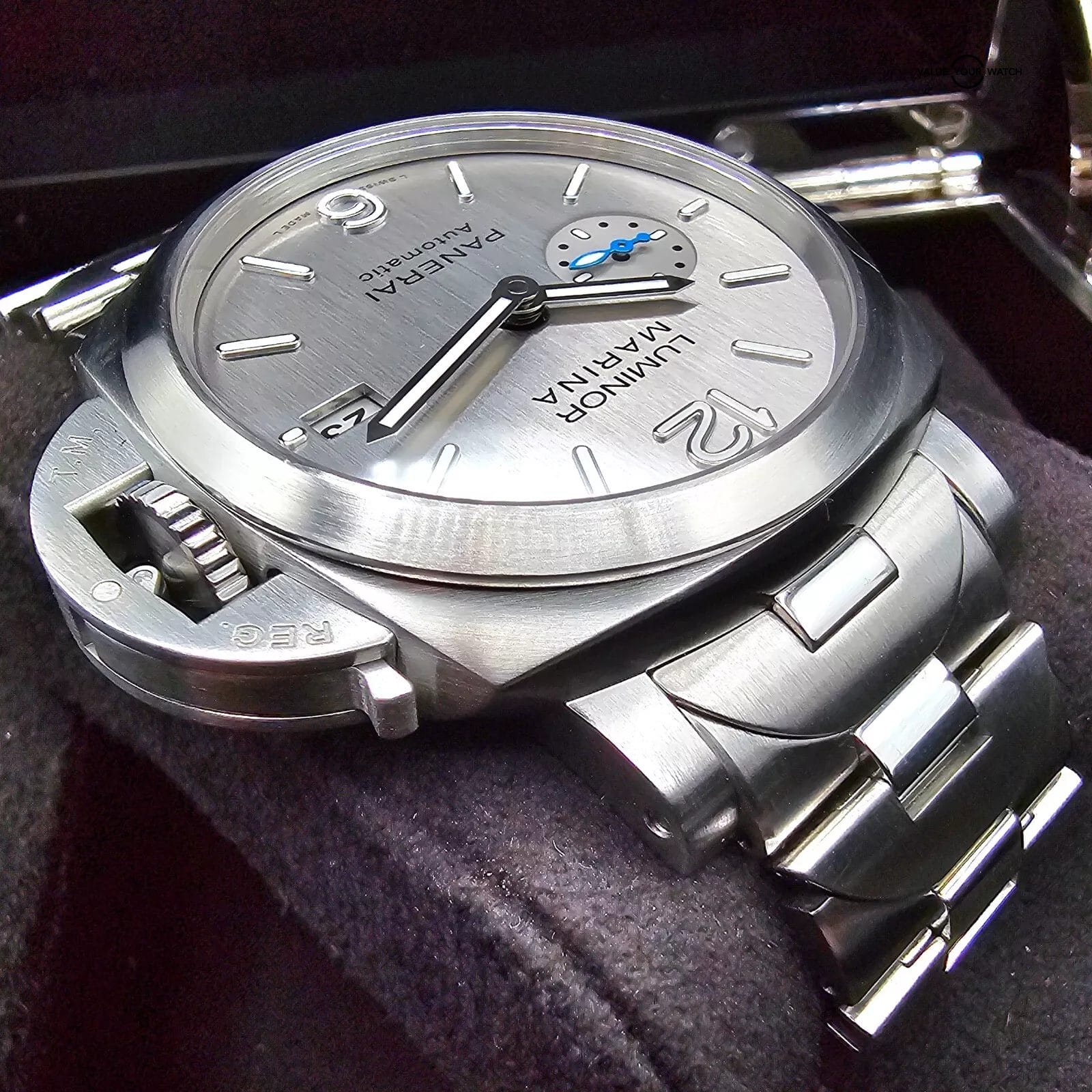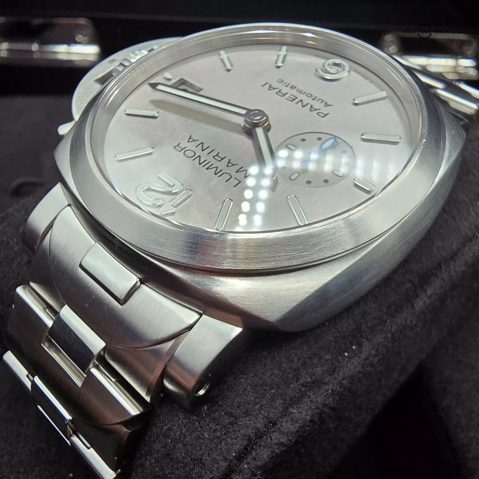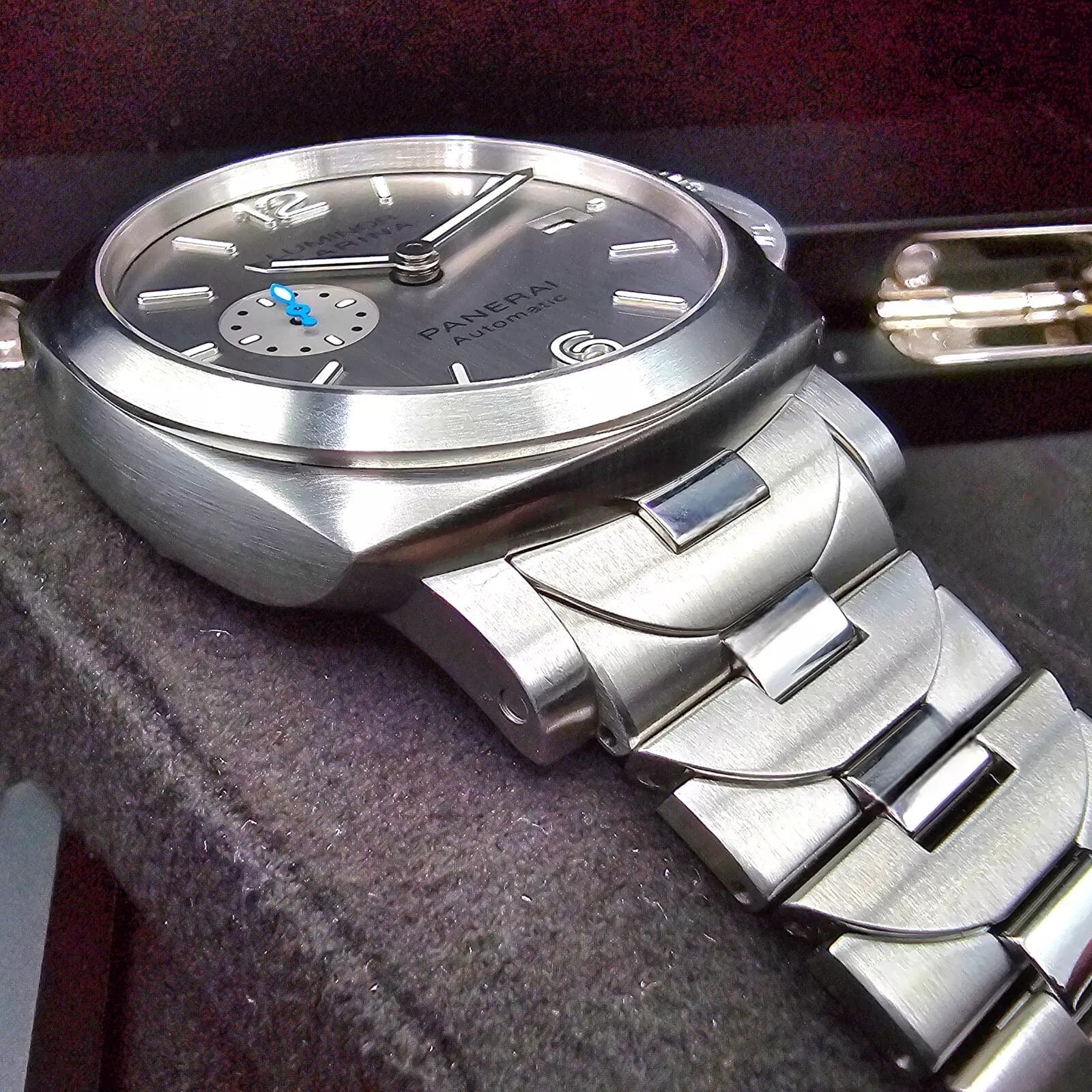The brushed silver dial looks absolutely perfect, making this the most elegant Luminor there is in steel.