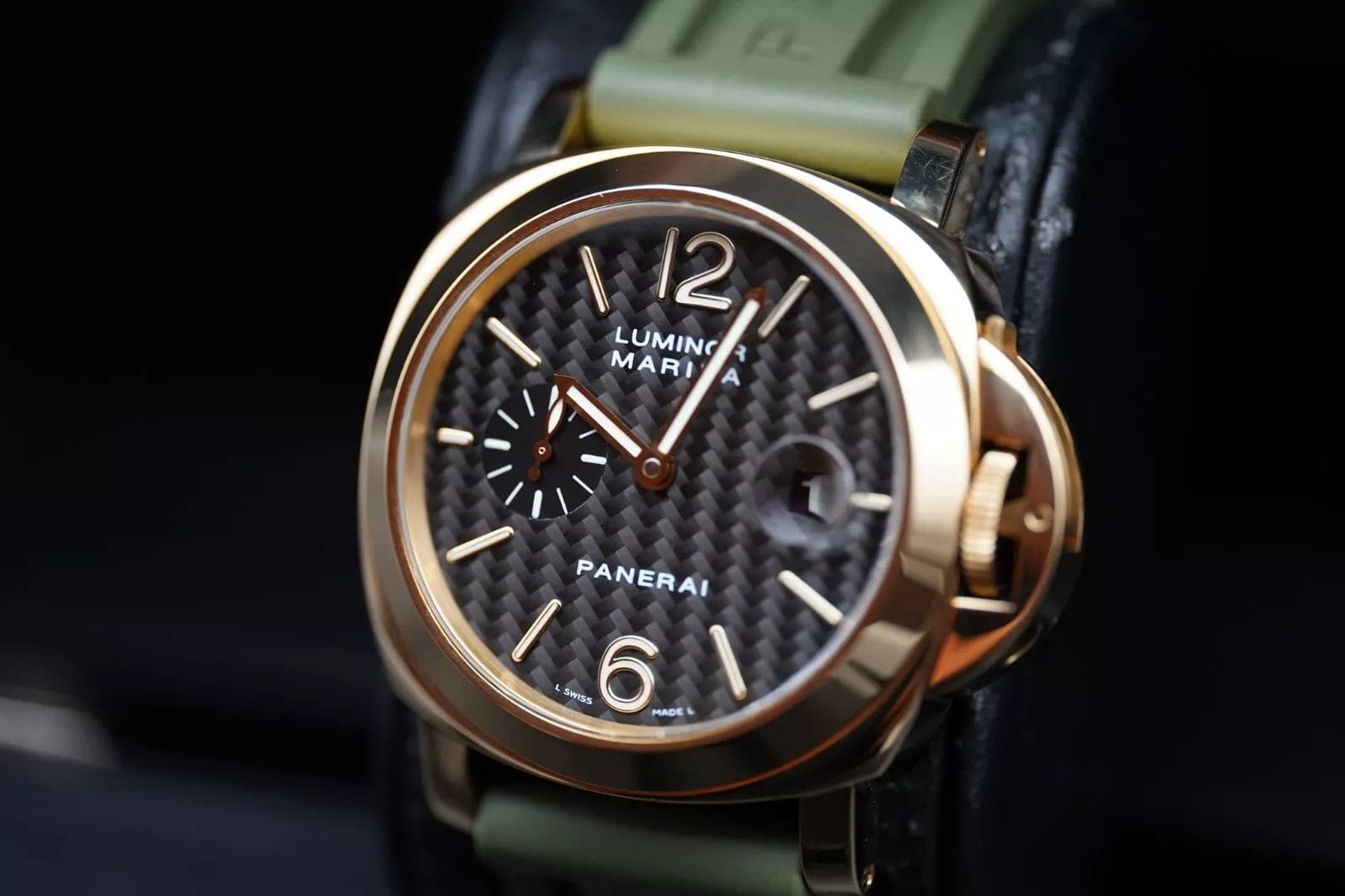 1 of only 250 ever produced – A timepiece well respected by watch afficionados. The PAM00140 is equipped with the illustrious carbon fiber dial and is encased in 18kt solid gold from the closed caseback to the strap changing tool, ultimately completed by a small seconds at 9 o’clock and a date window at 3 o’clock