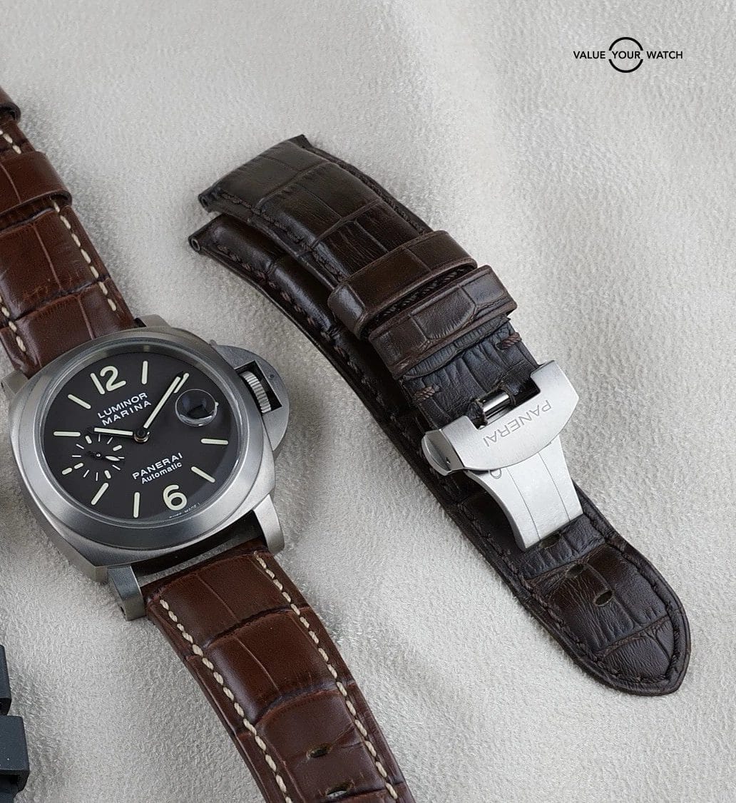Three OEM straps: brown leather, brown leather with tan stitching, black rubber stap, including Panerai tang buckle and Panerai double folding clasp