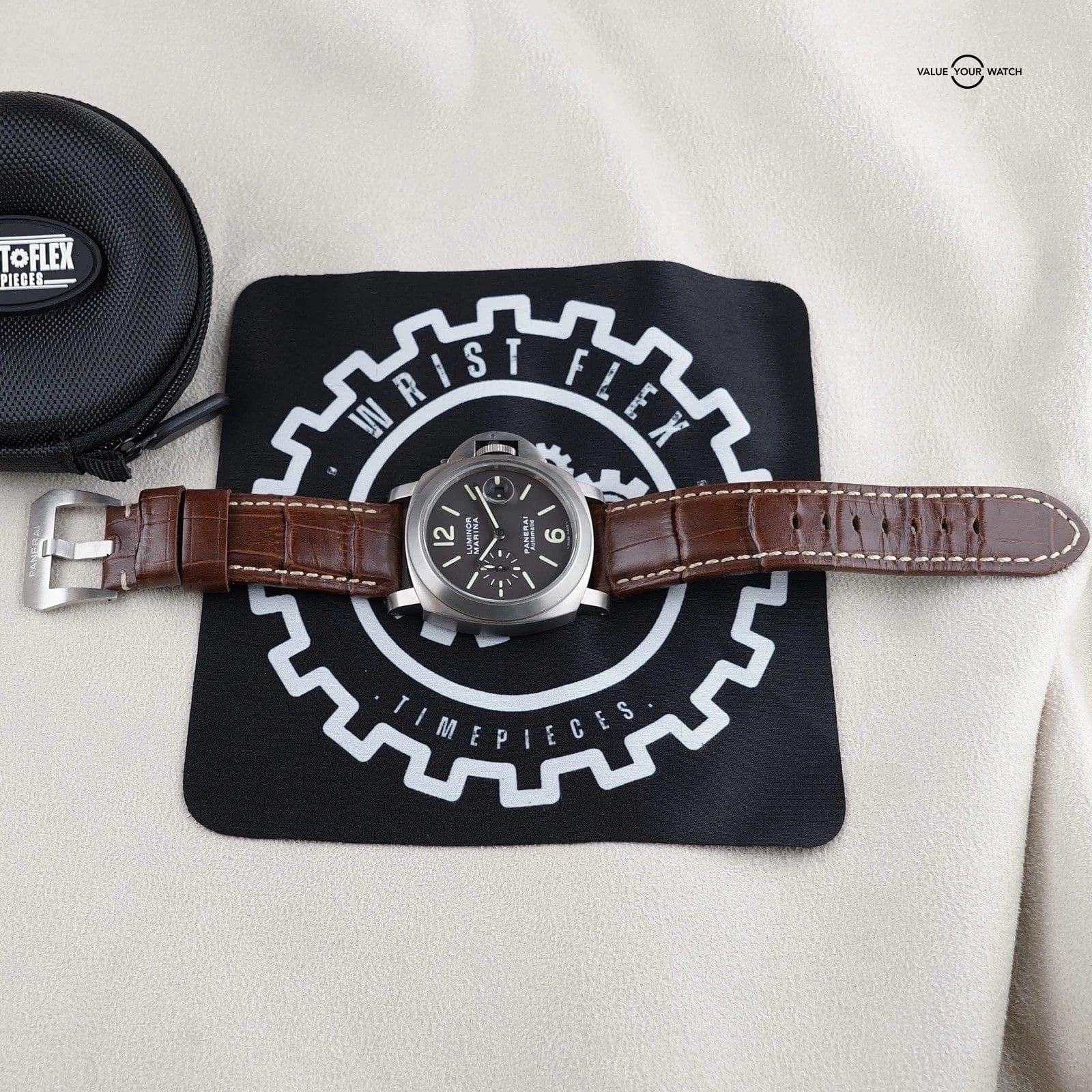 The PAM00240 is the lightweight way to wear Panerai. The 44mm Luminor case in titanium delivers the full Panerai silhouette with a noticeably easier, more comfortable wrist feel. Pair that with the slate brown dial and date layout, and you get a collector-favorite configuration that wears far lighter than it looks.