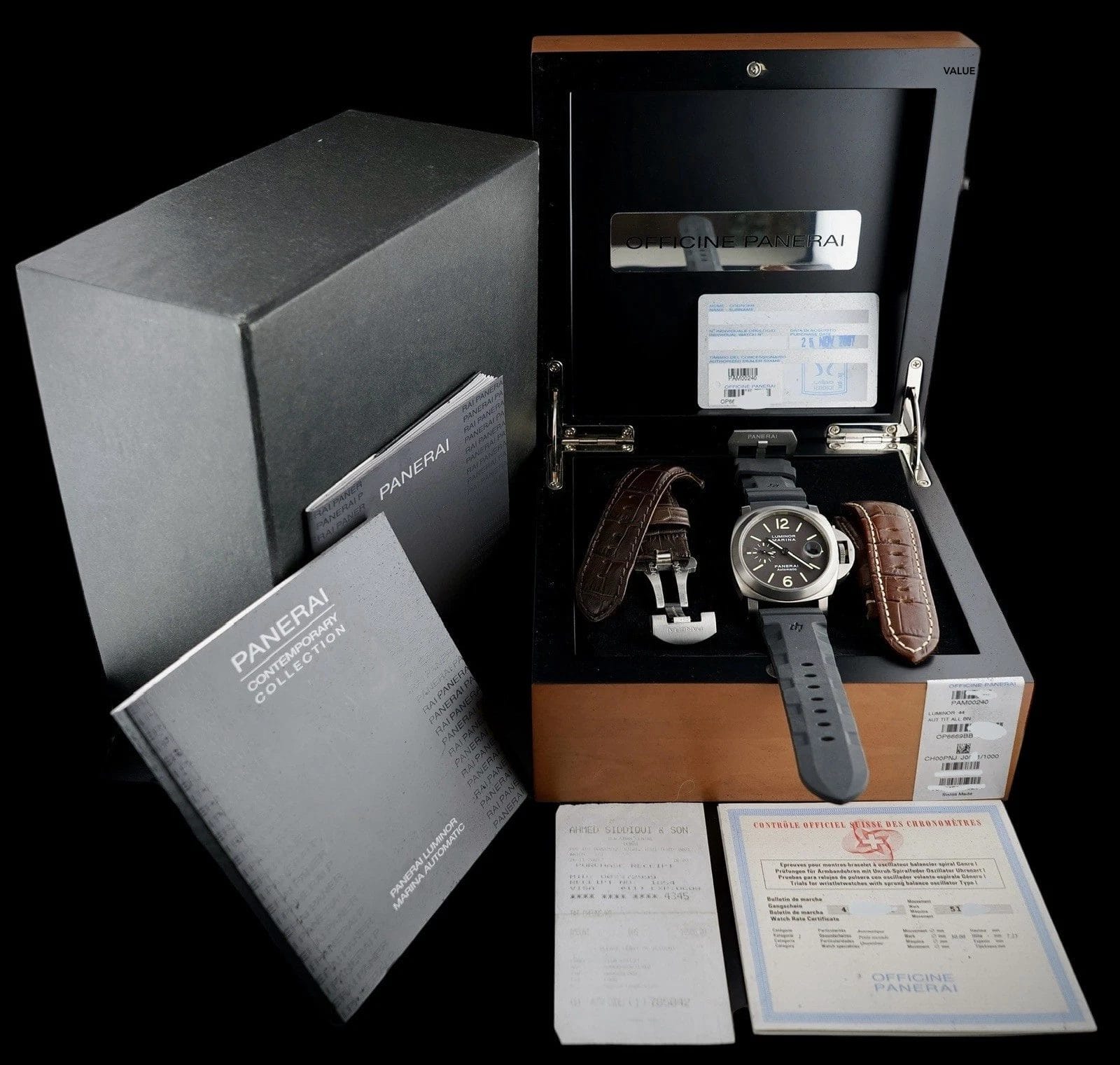 - Three OEM straps: brown leather, brown leather with tan stitching, black rubber (Paneristi style)