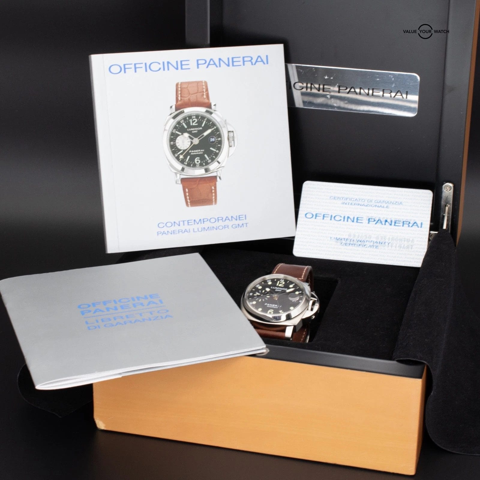 Contents: Panerai wooden box, booklets and 2005 warranty card (missing pillow).
