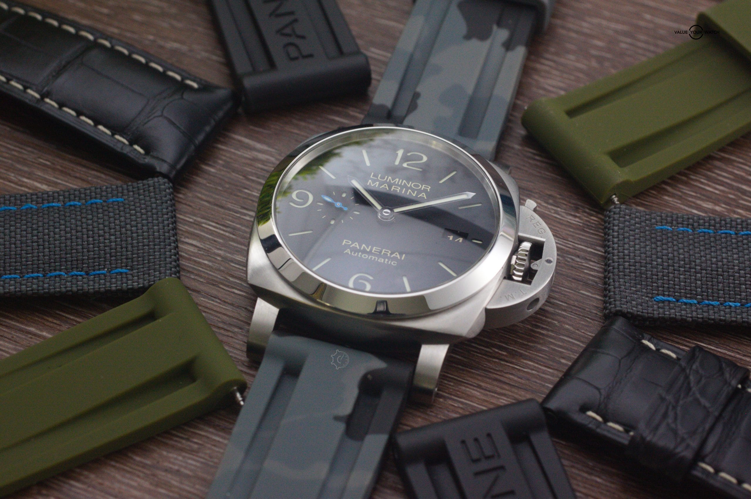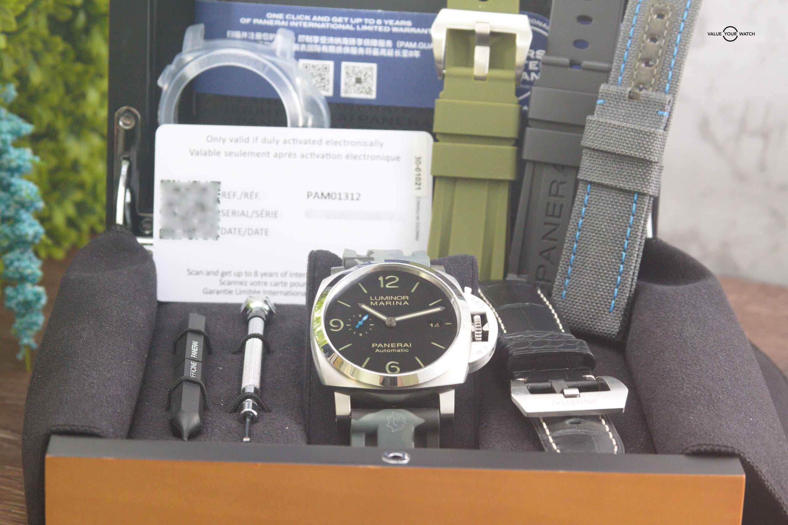 This watch comes triple boxed, & includes the international warranty card, Operating Instructions Manual, strap changing tool, OEM Panerai rubber & leather straps along with an extra beautiful OEM gray canvas strap with contrasting blue stitching & 2 awesome Horus rubber straps for a total of 5 straps so you can be free to change styles.
