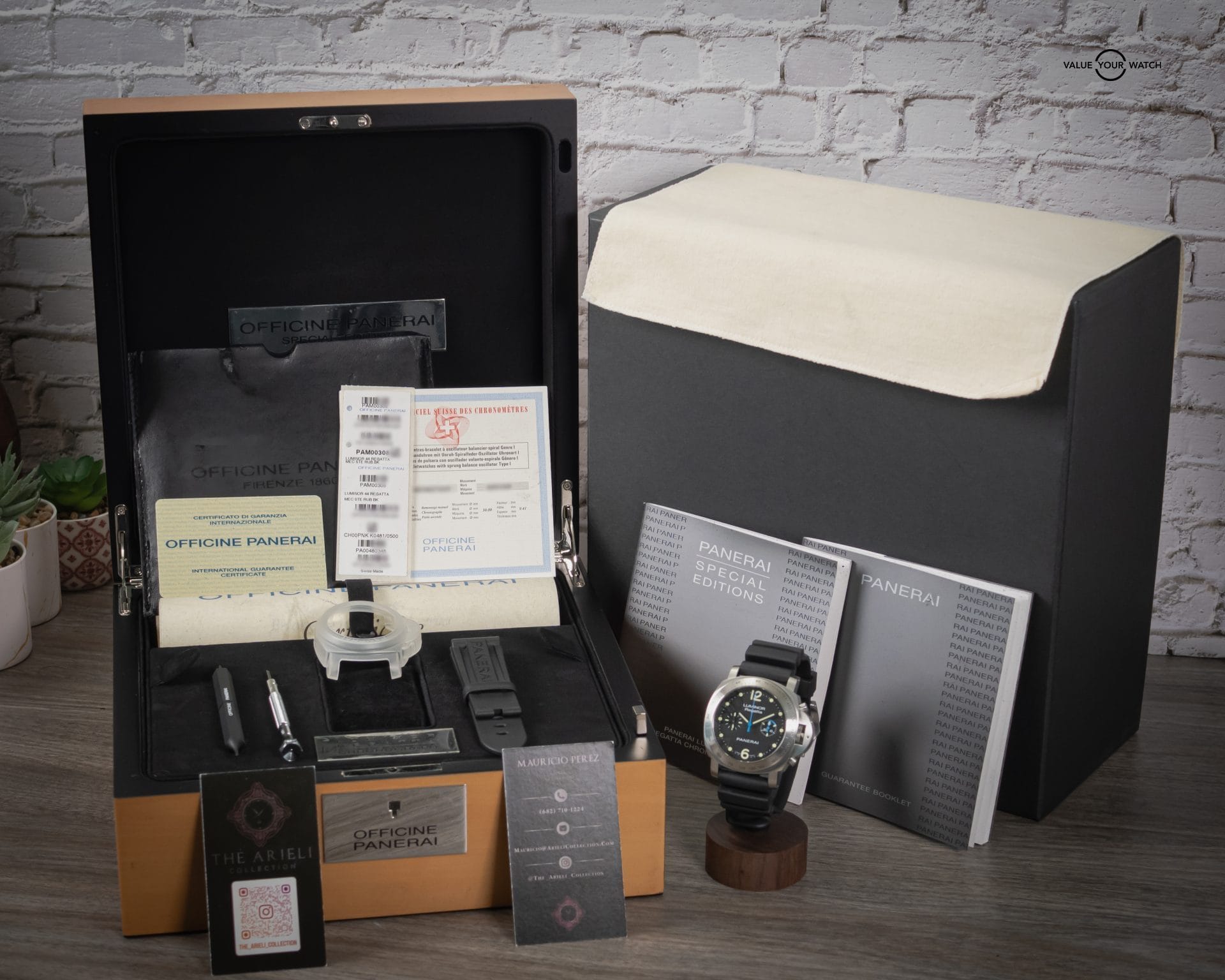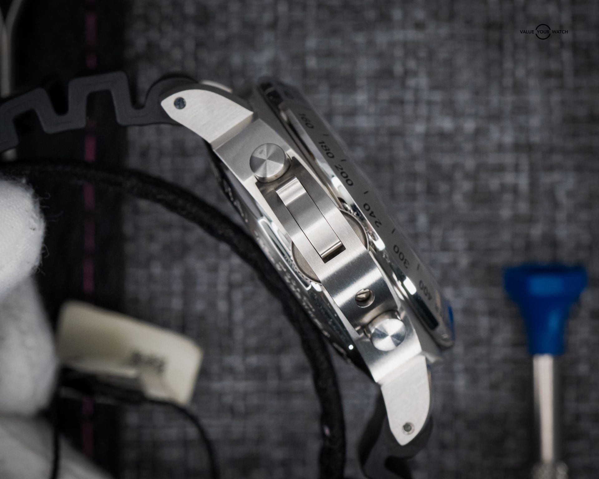 This is not your average Panerai chrono. The PAM308 is a visual and mechanical celebration of sailing heritage, designed for collectors who appreciate bold design and limited-production significance. Its unworn status and untouched presentation make it increasingly rare — a true vault piece that offers both wrist presence and horological value. The tachymeter bezel, regatta timing scale, and Panerai’s signature crown guard all nod to the brand’s roots in maritime functionality, while the Special Edition certificate and full set seal the deal for any serious Paneristi.