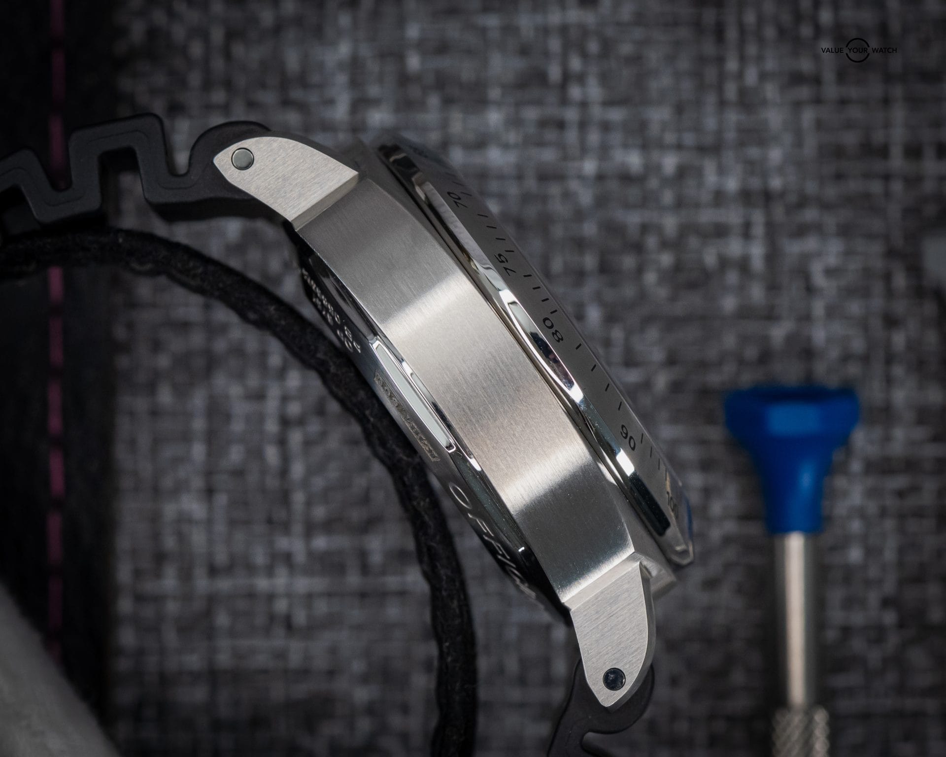 • 44mm brushed steel Luminor case with engraved tachymeter bezel