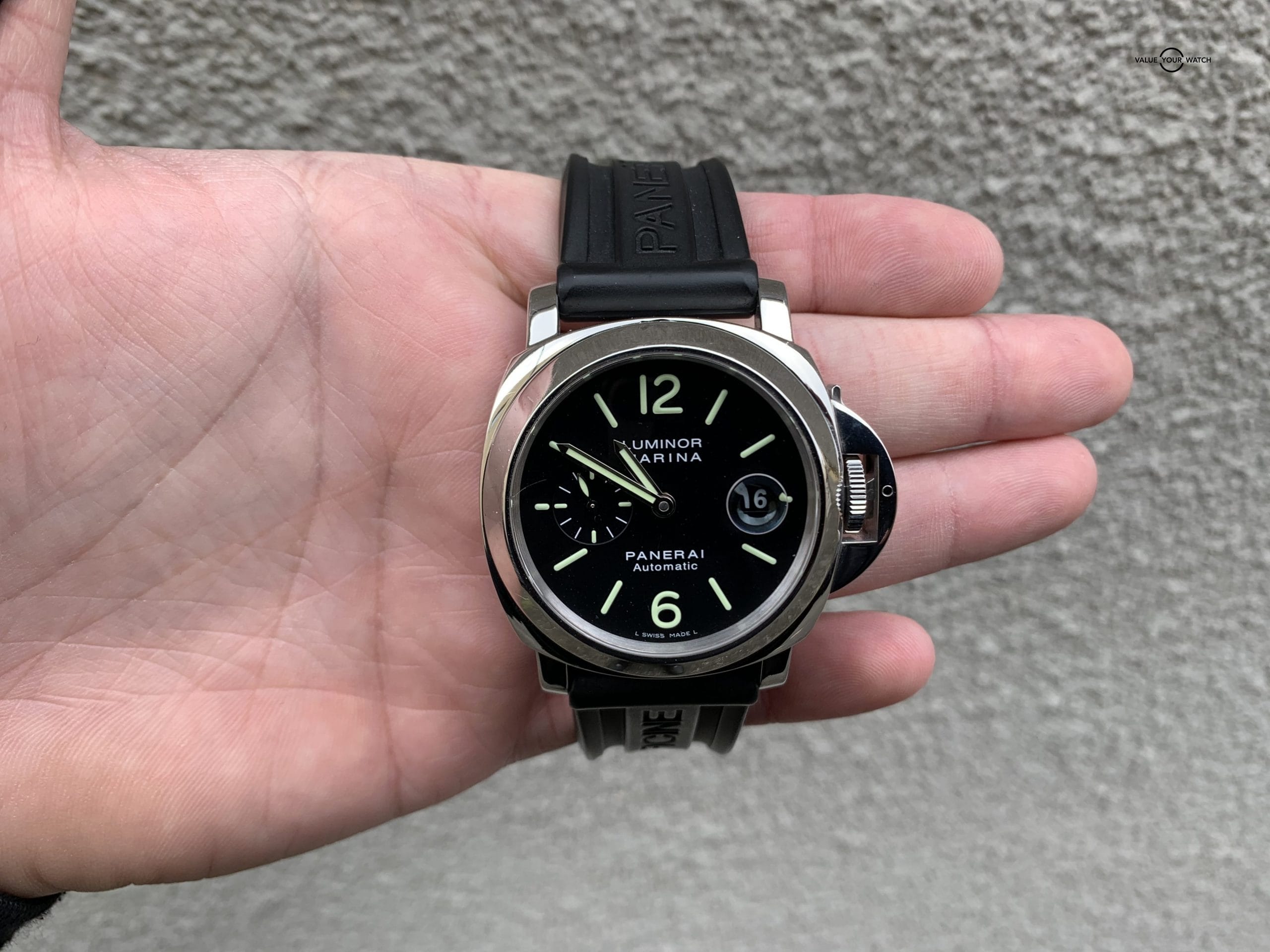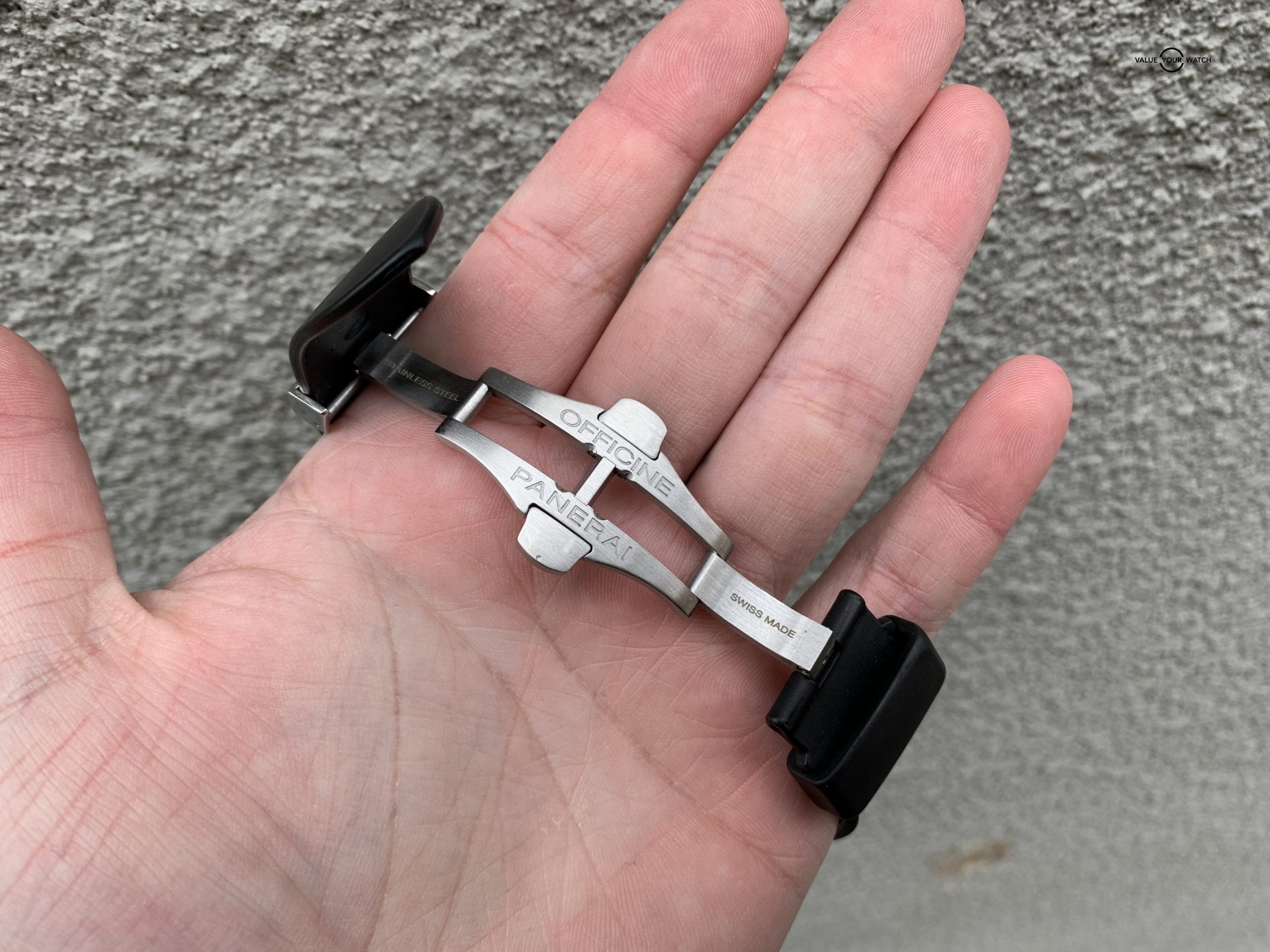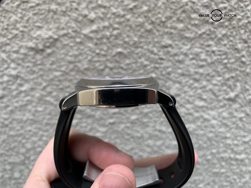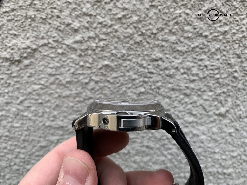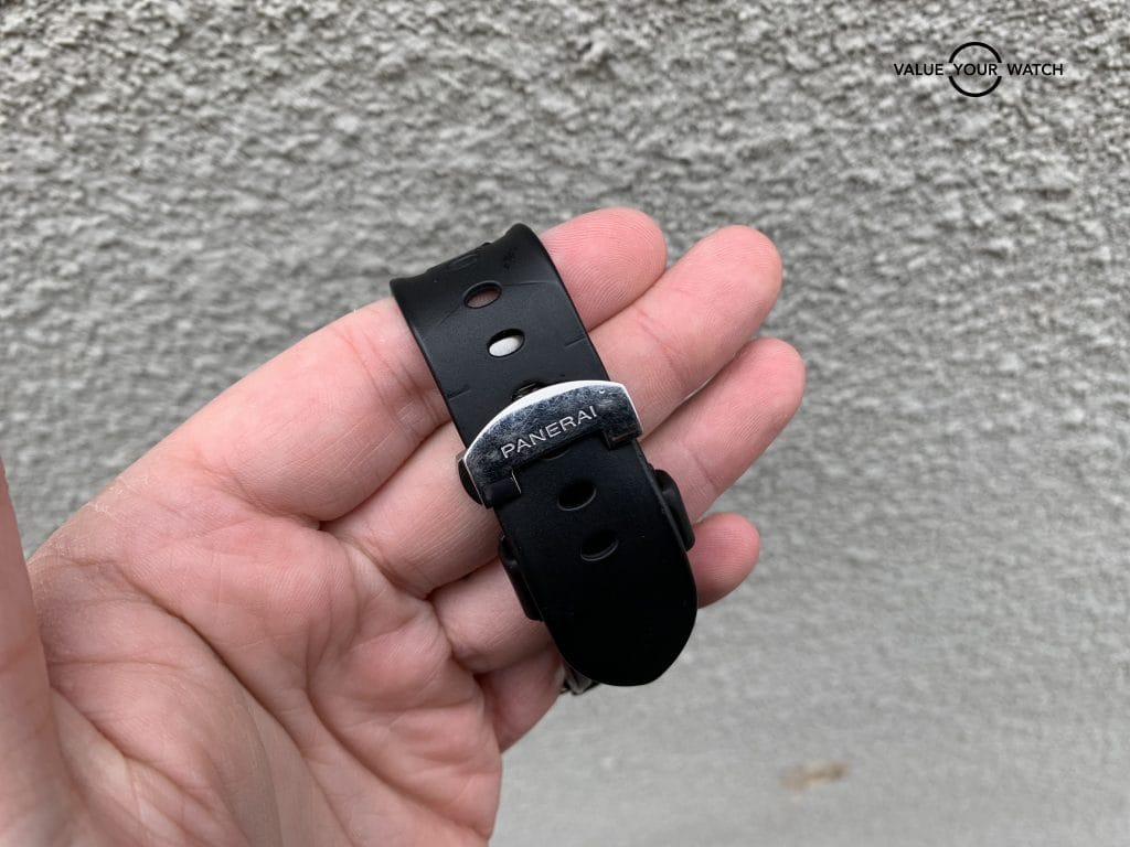 This Panerai features the OPIII automatic self-winding movement with an approximate 42 hour power reserve. The watch comes on an original Panerai rubber strap with the factory stainless steel deployment clasp. With adjustments to accommodate any size wrist, this band does not need to be cut to size.