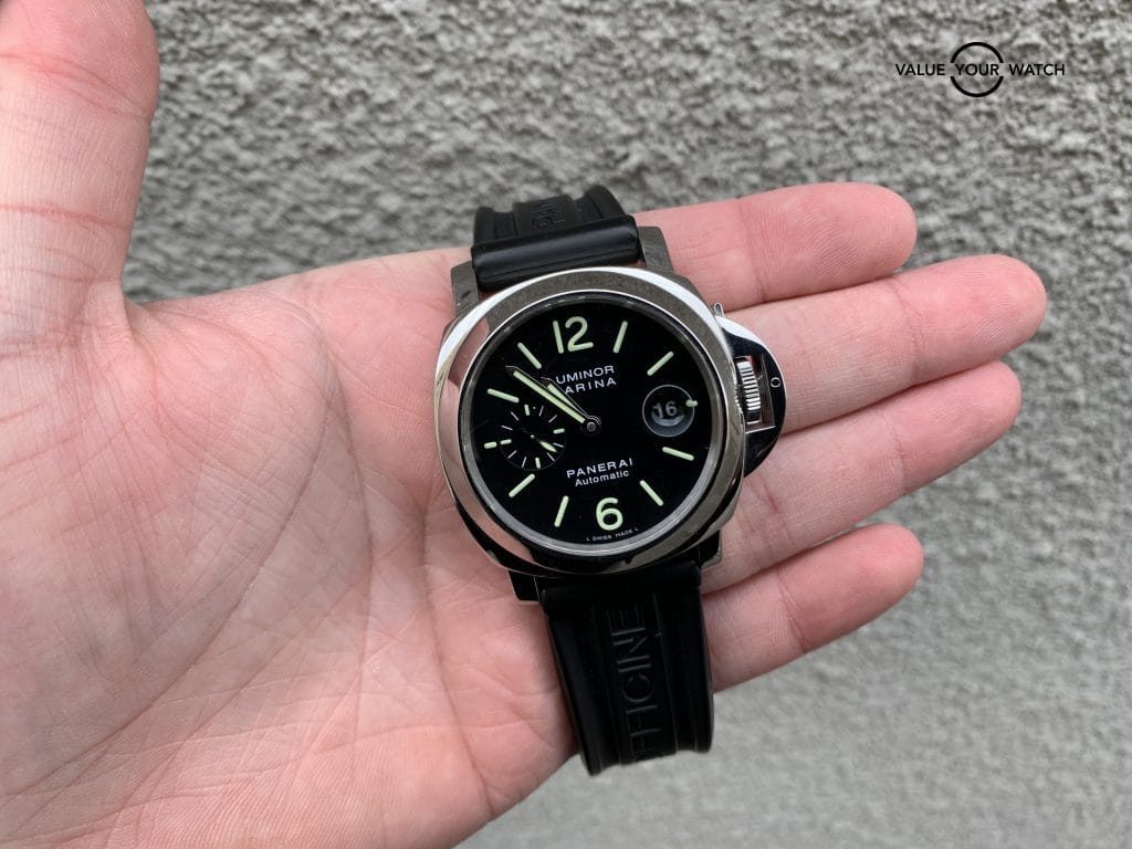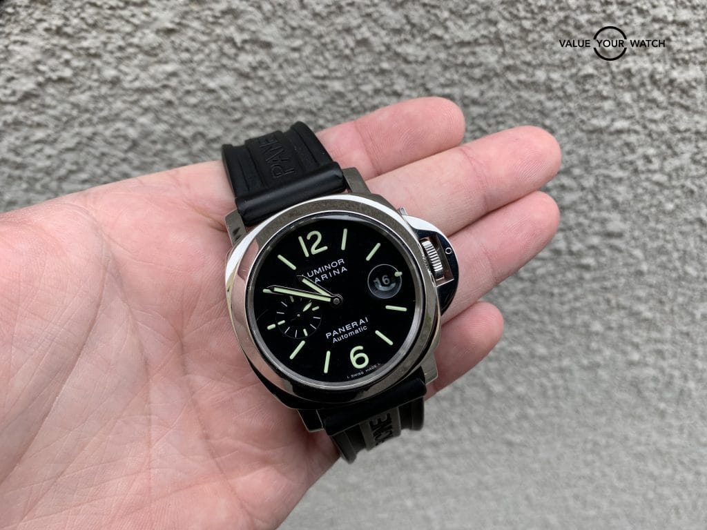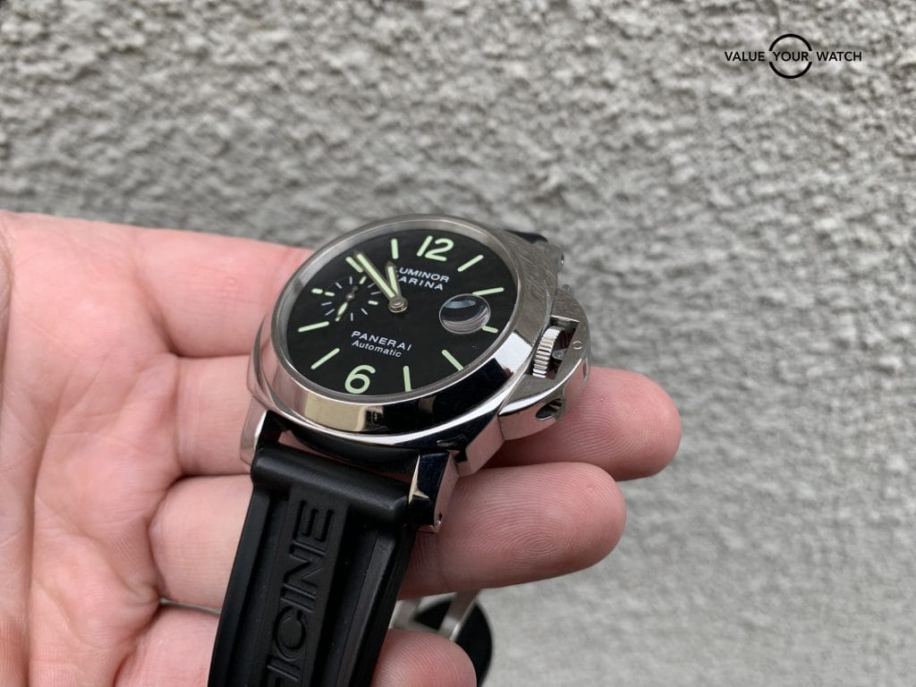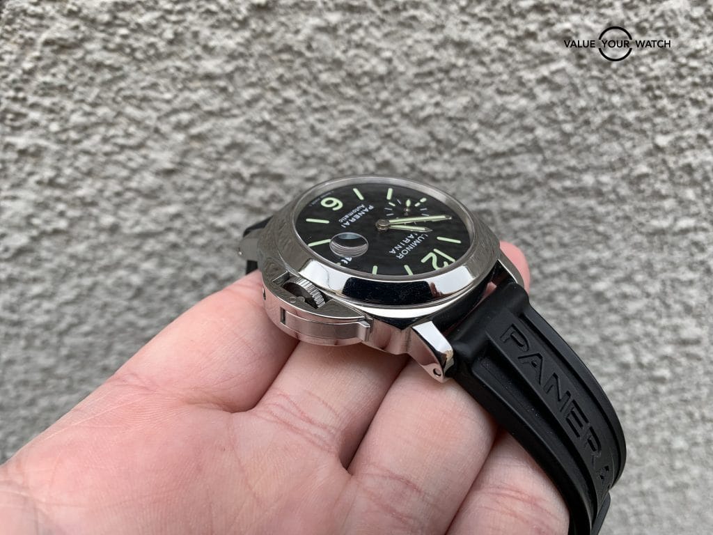 This Pam104 is in excellent shape! Some light micro scratches on the case and bezel that will come up with a polish. The crystal has one minor hairline scratch in the AR coating in between 9 and 10 o’clock.