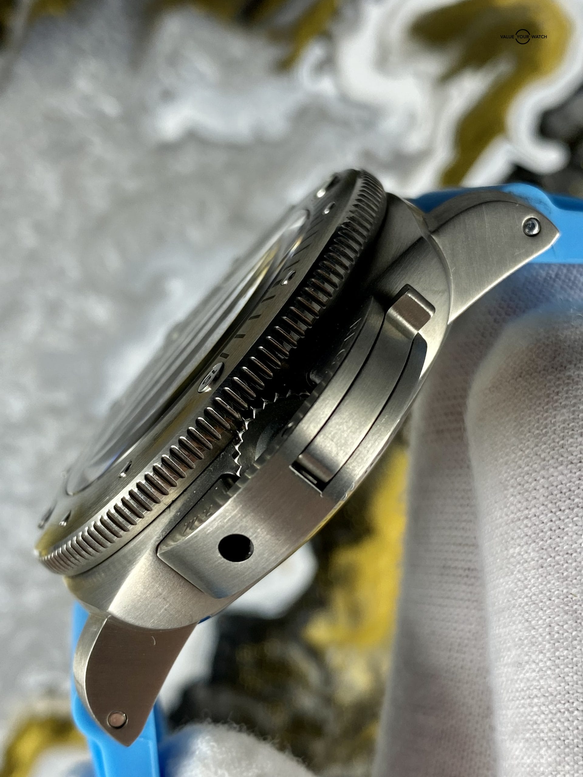 If you’re looking for a diving watch, Panerai has you covered! This titanium Luminor Submersible wears light for a 47mm watch, and distinctively shows your love for water sports with the signature Submersible style and Miami blue strap to finish the look! Panerai limited this model to 1000 pcs, this is #193/1000. Summer is coming and this watch is burning to be splashed!