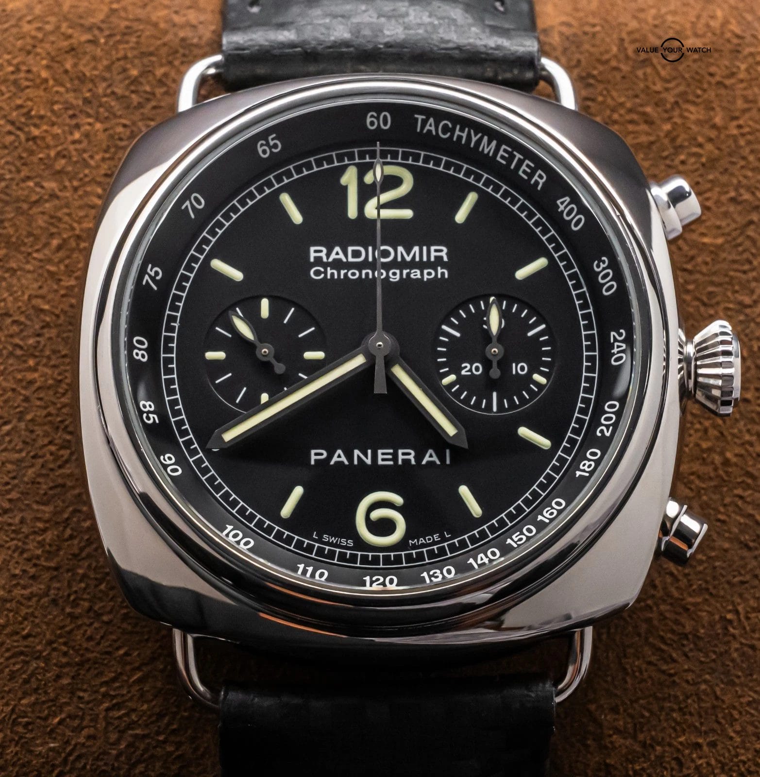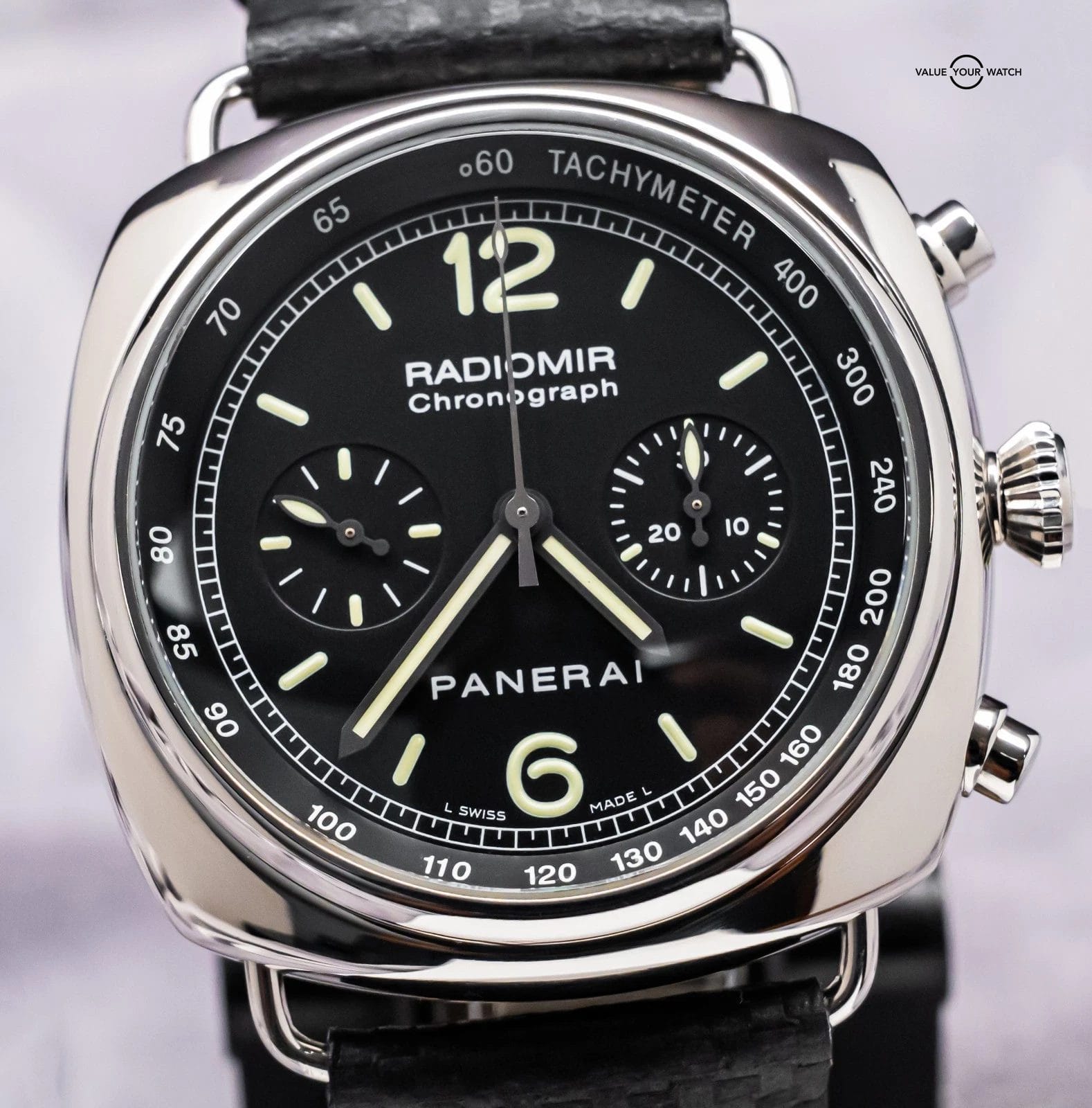 STUNNING Panerai 288 Radiomir Chronograph 45 mm in Stainless Steel with Black Dial on Black Panerai Carbon Fiber Leather Strap & Custom Deploy Clasp! Arrives as a complete set with a “J” Serial, denoting this piece to be 2007 manufacture at Panerai. This Radiomir is absolutely stunning with the high polished finish, it looks killer on wrist!