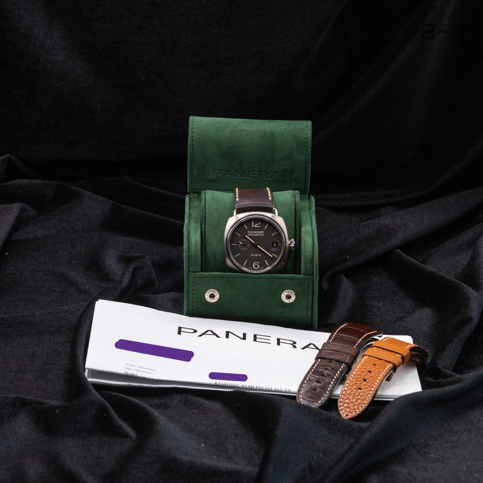 Comes in the service box as pictured, with papers from a Panerai service in 2021. Also includes 3 straps! Currently mounted on a thick leather strap by Aaron Bespoke, and also includes 2 original Panerai straps.