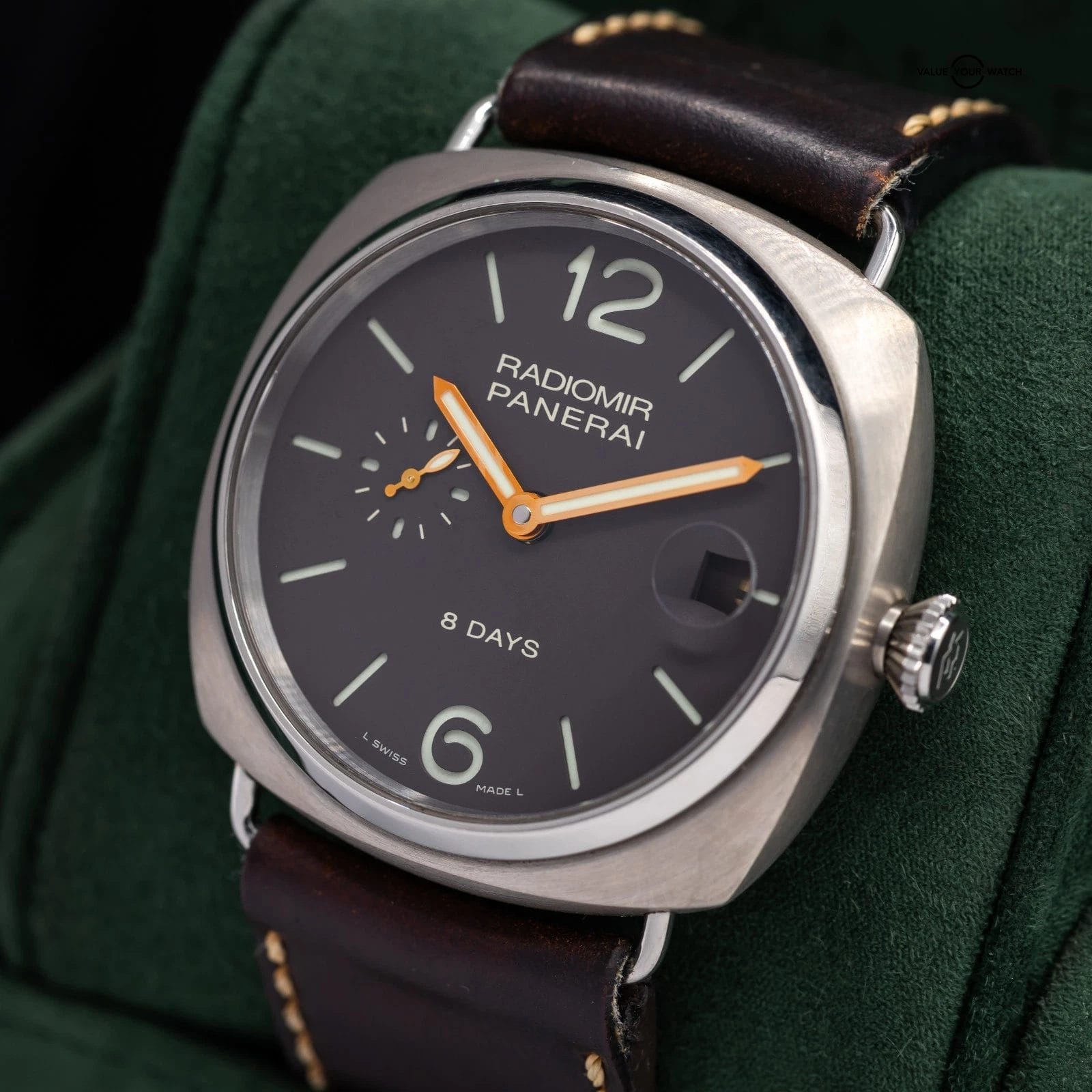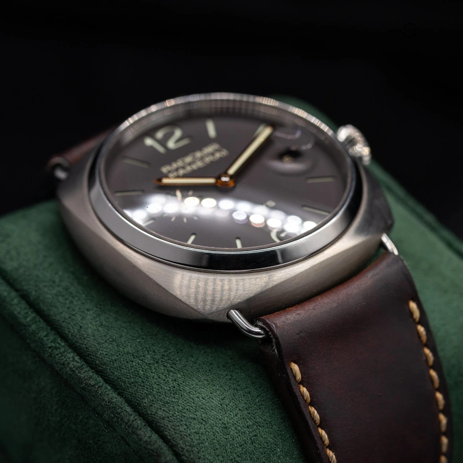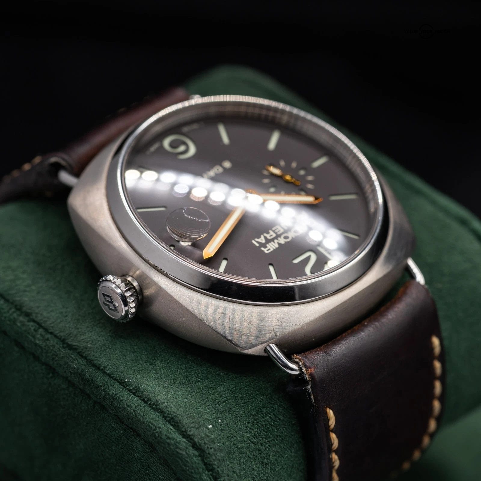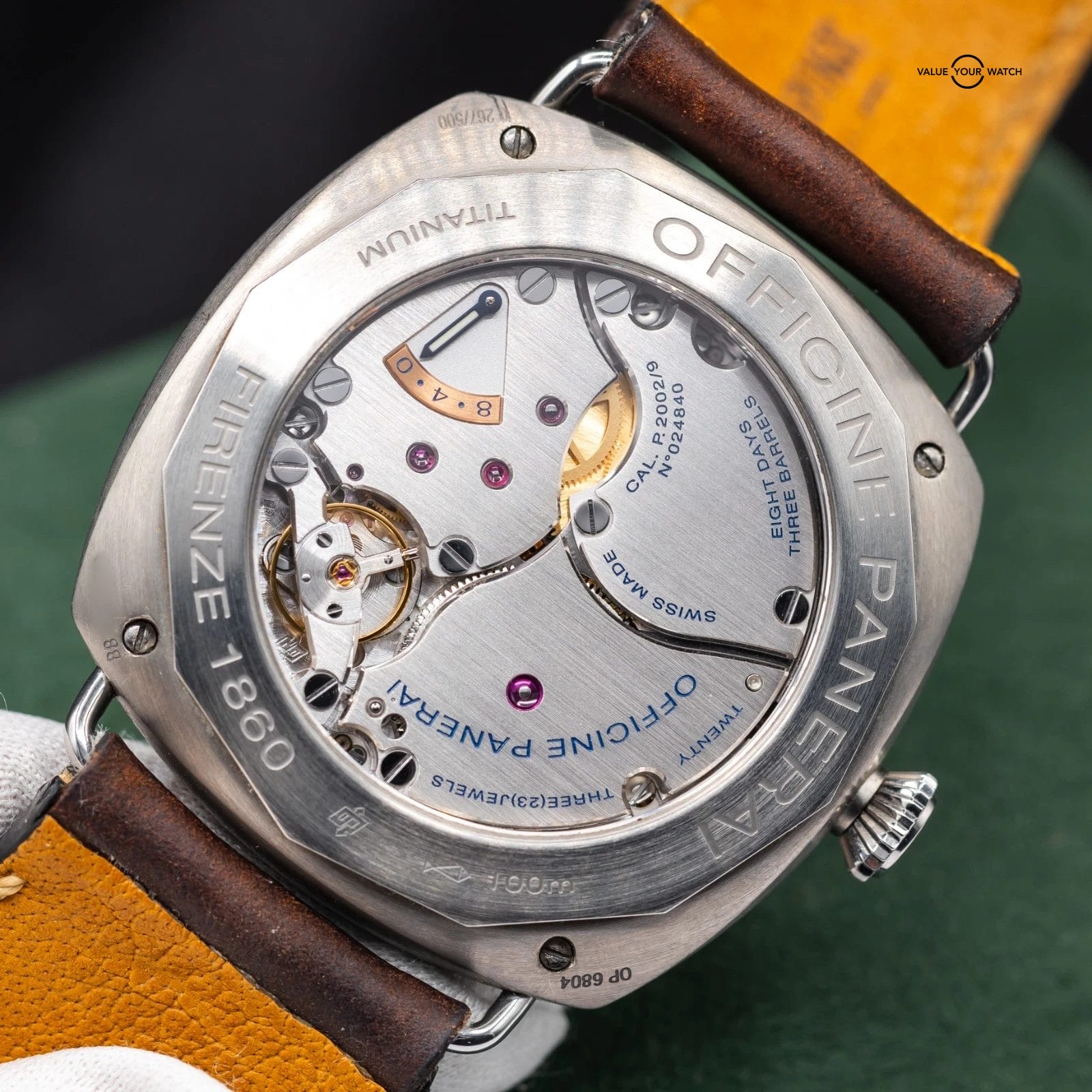 Up for sale here is a very cool offering by Panerai in the Radiomir lineup. This variant of the 8 Days Radiomir is cased in full titanium, and with the 1860 case shape at 45mm, it feels very comfortable on the wrist! Ref. PAM00346