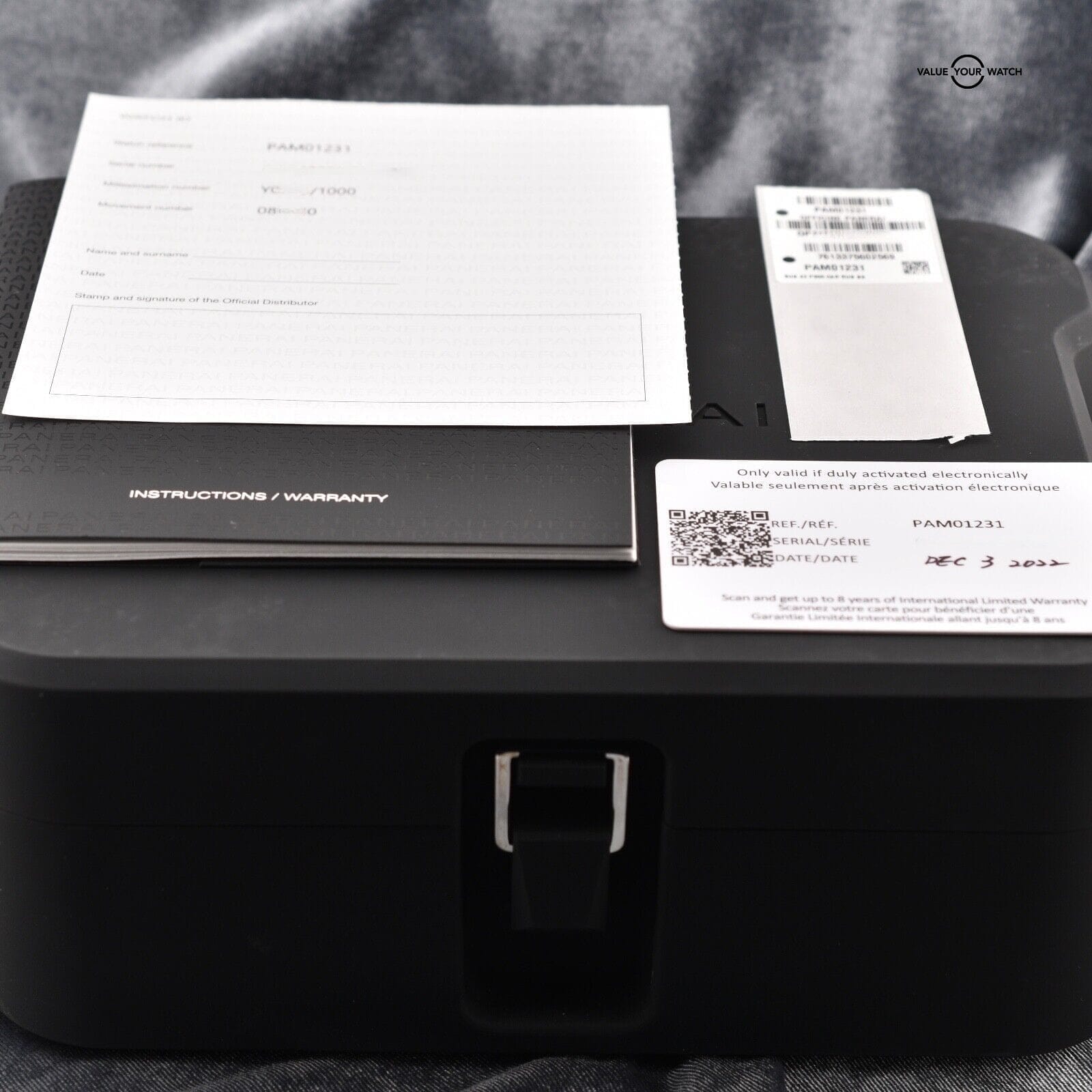 Contents: Double boxes, Instruction/Warranty Booklet, additional Panerai strap, December 2022 Warranty Card, Stickers, Cloth, and Screwdriver