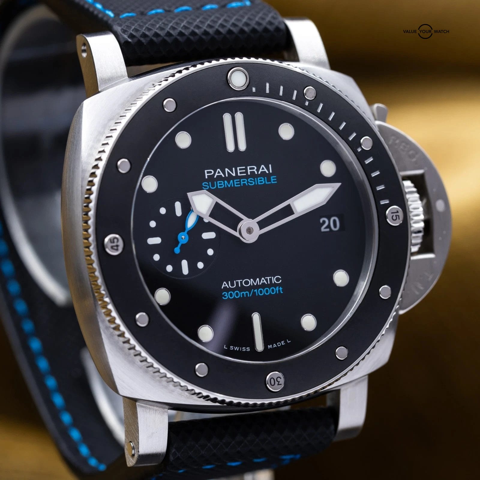 The newer style submersible with the ceramic bezel and the blue accents against the black dial. Such a great combo! This one is in the 42mm case size so perfect for anyone without a big wrist still wanting to own a Submersible. Swiss watchmaking internals with the Italian styling elements we all love!