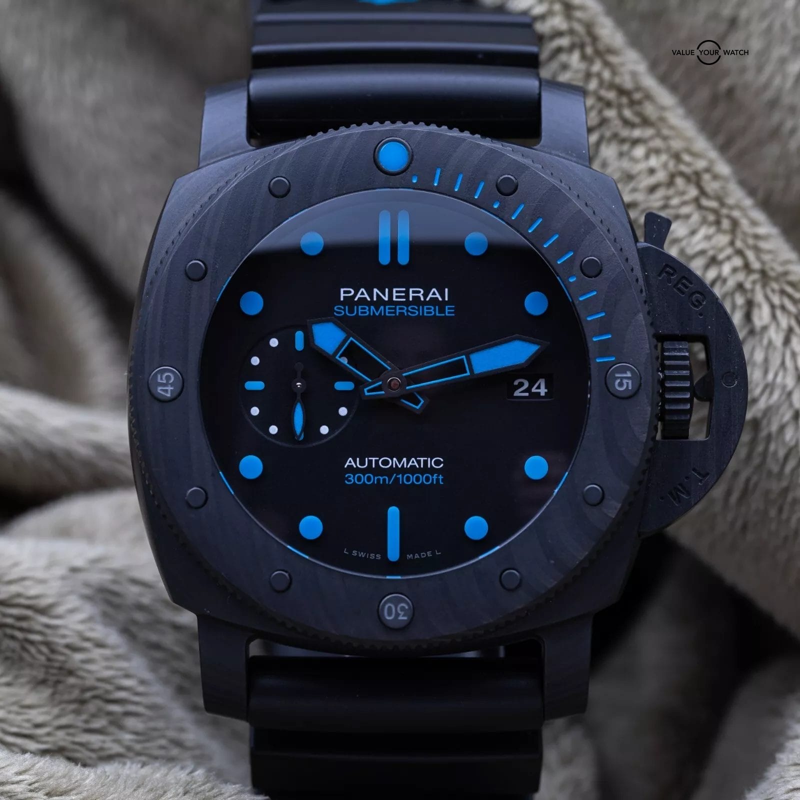 Watch is in great condition. Only one mark on the underside of the crown guard, otherwise the Carbotech is flawless. Comes with boxes and warranty card and paperwork dated 2020. Crystal is clean and the watch is running great. Under Panerai warranty until 2028…talk about peace of mind! Don’t miss your chance to get an almost new Carbotech Panerai Submersible at a fraction of the $17k+ retail price!