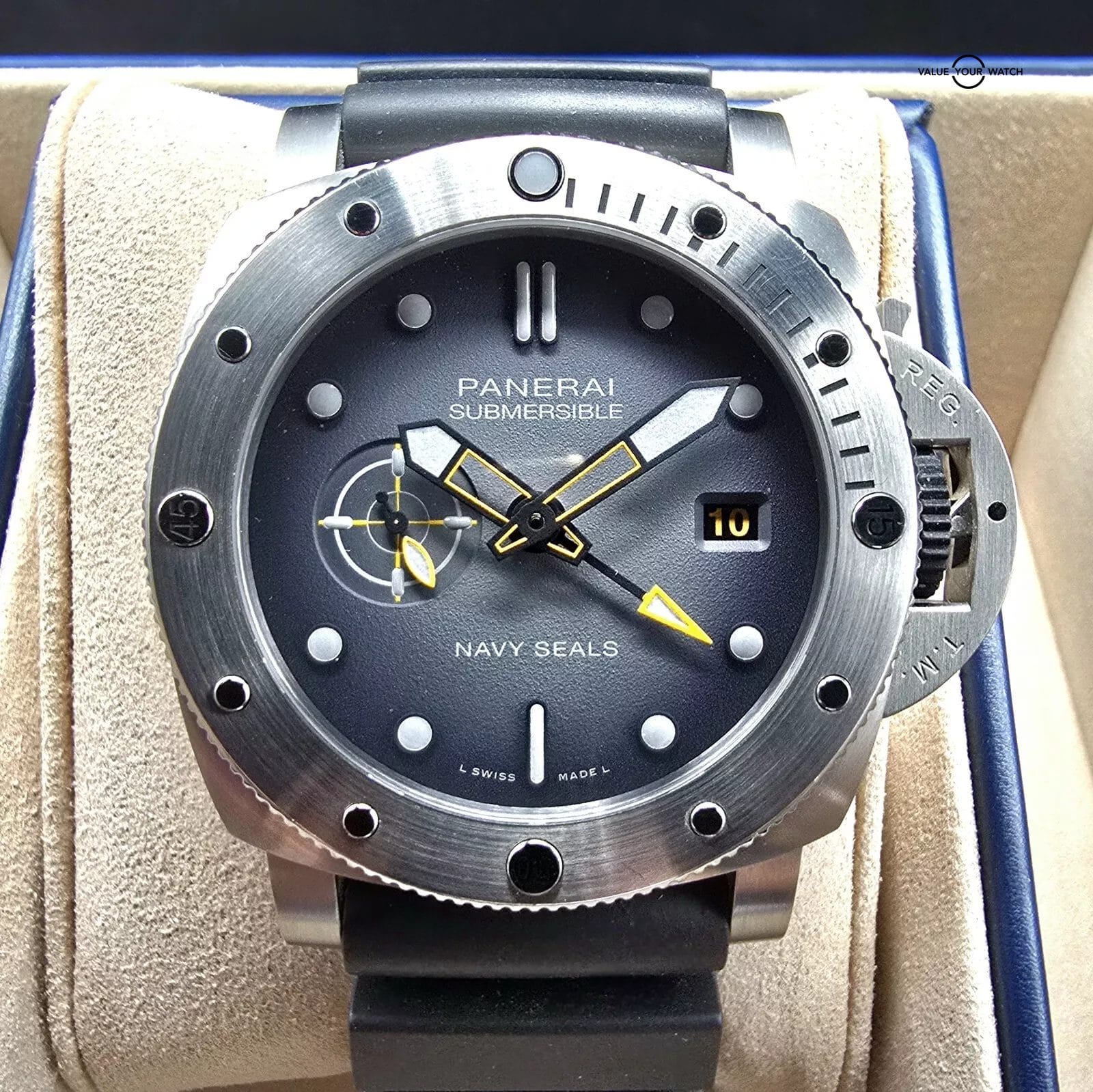 For sale here is a beautiful example of a the newest Panerai Submersible Navy Seals limited edition. The combination of the stainless steel case, 300m waterproofness, and GMT function means this can be your every day, go anywhere watch, yet still be the one you save for special occasions