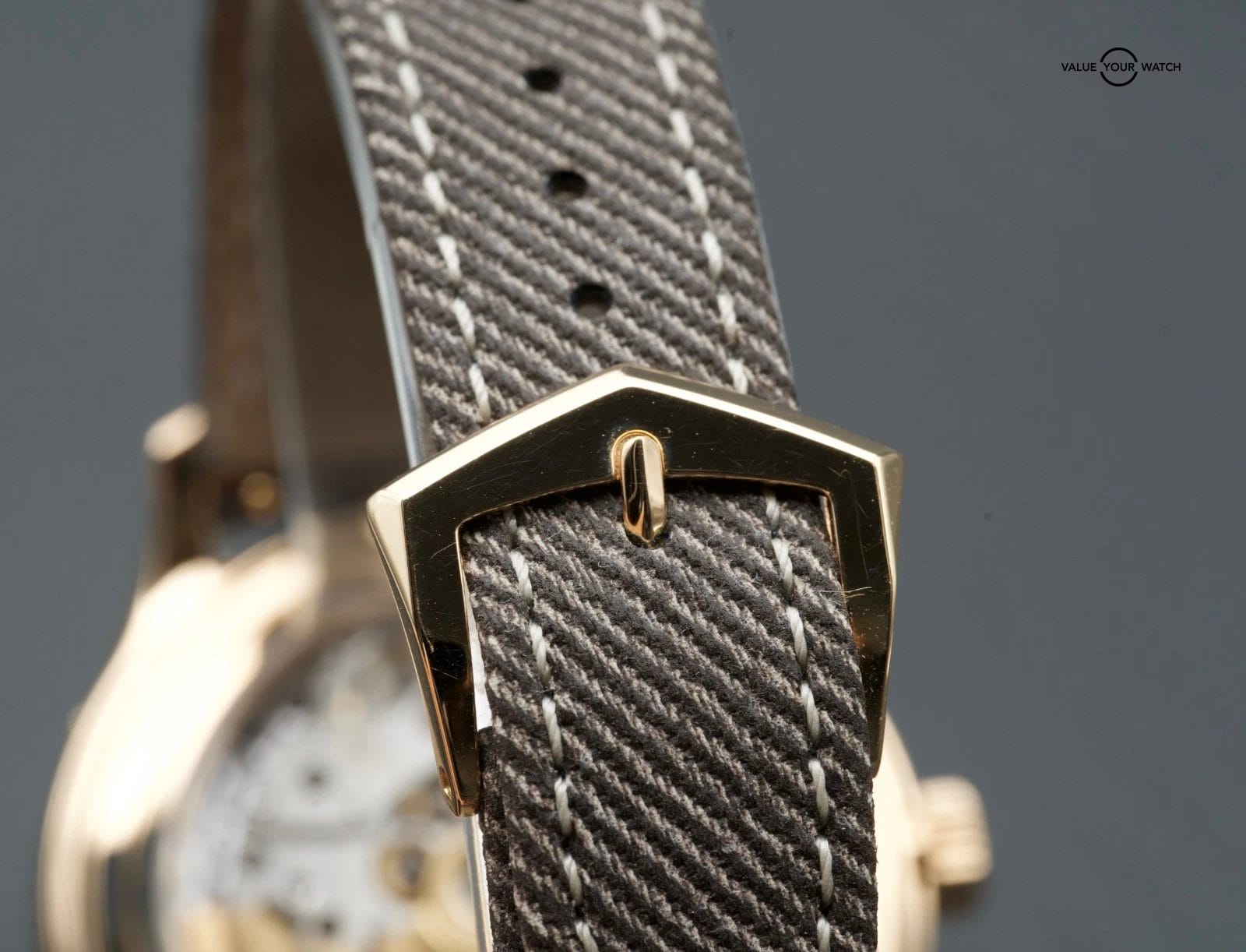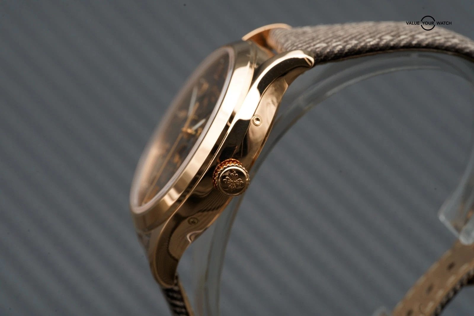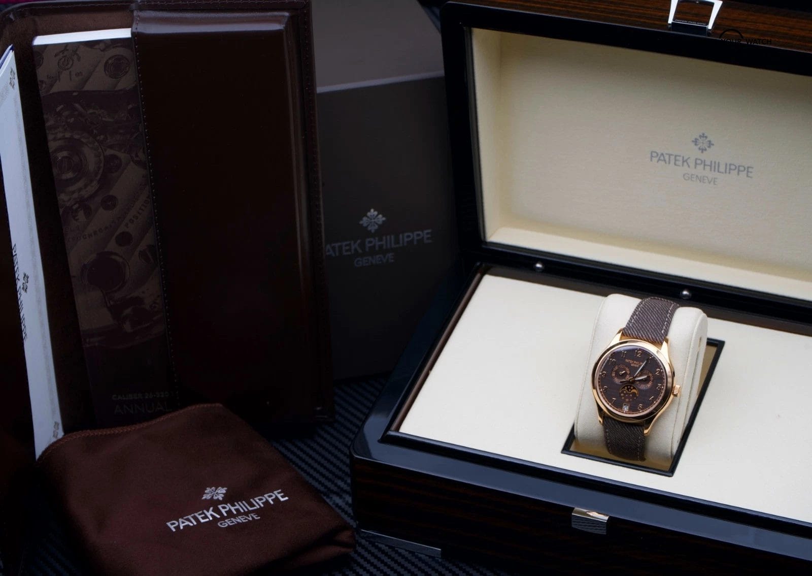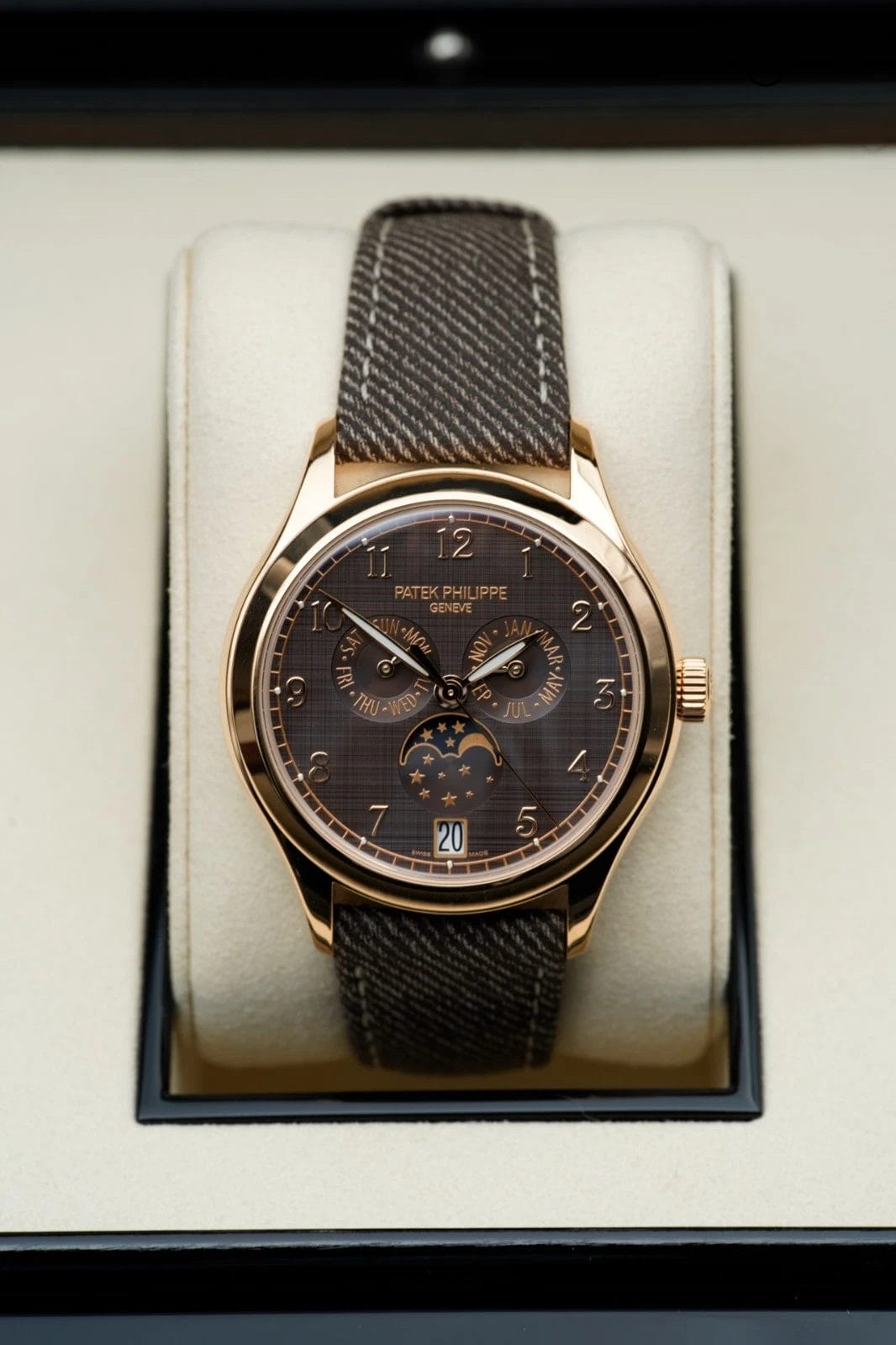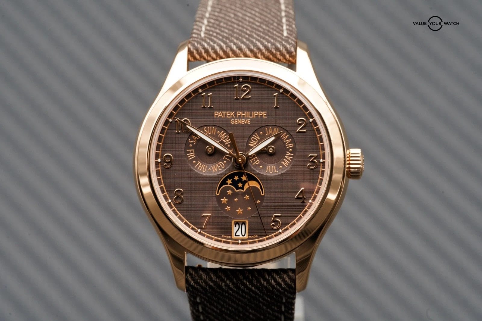 For sale is a Patek Philippe Complications 4946R (38mm) Annual Calendar in rose gold with the textile brown/chocolate dial and brown “chestnut”, denim pattern, calfskin leather strap.