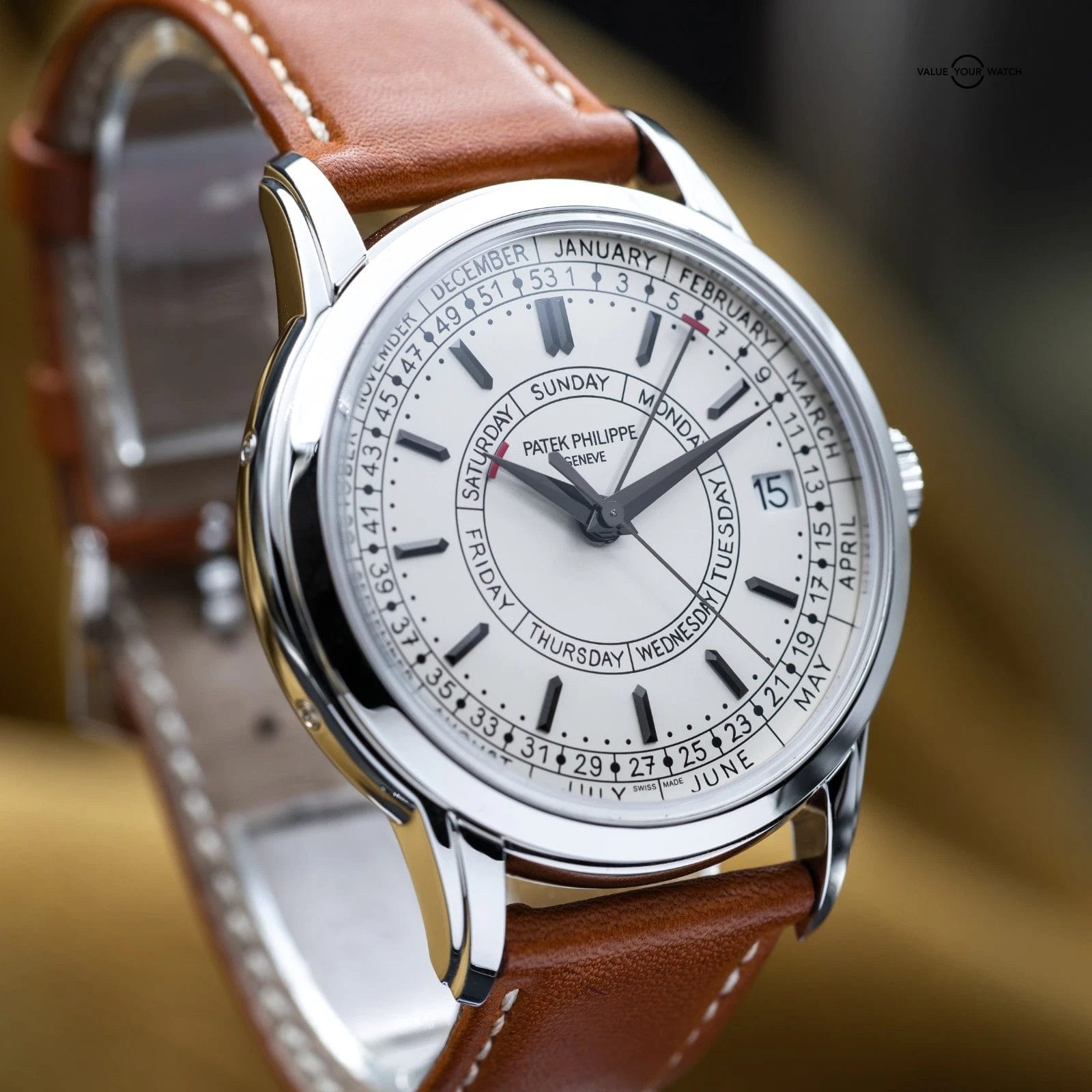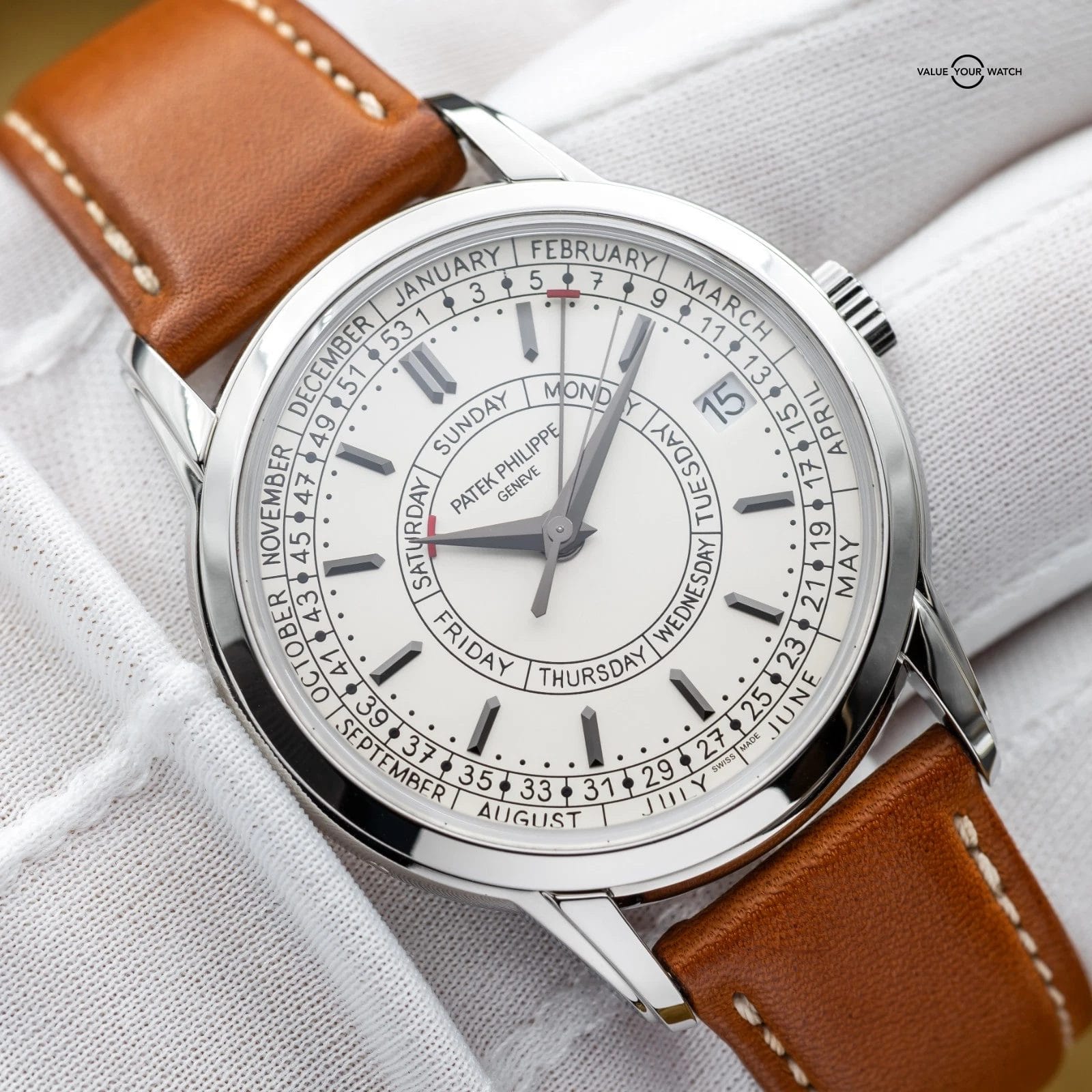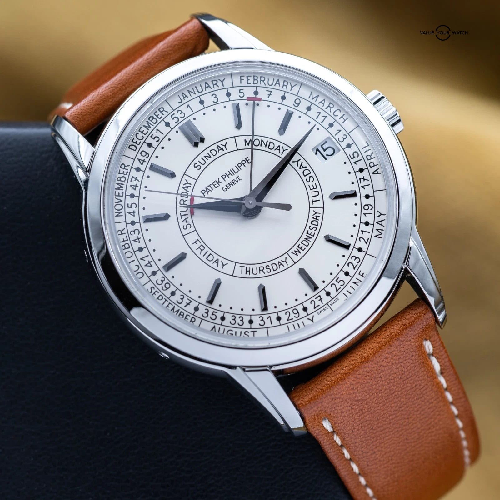 The Patek Philippe Calatrava Weekly Calendar blends classical watchmaking with a modern twist, highlighted by its rare weekly calendar complication. Crafted in stainless steel with a 40 mm case, it features handwritten-style typography for a more casual, contemporary appeal. It also offers a weekly calendar complication – a display showing the current week number of the year in addition to the day and date – driven by a self-winding mechanical movement developed specifically for this model. The Calatrava is a thoughtful, understated statement piece for collectors who value both innovation and tradition.