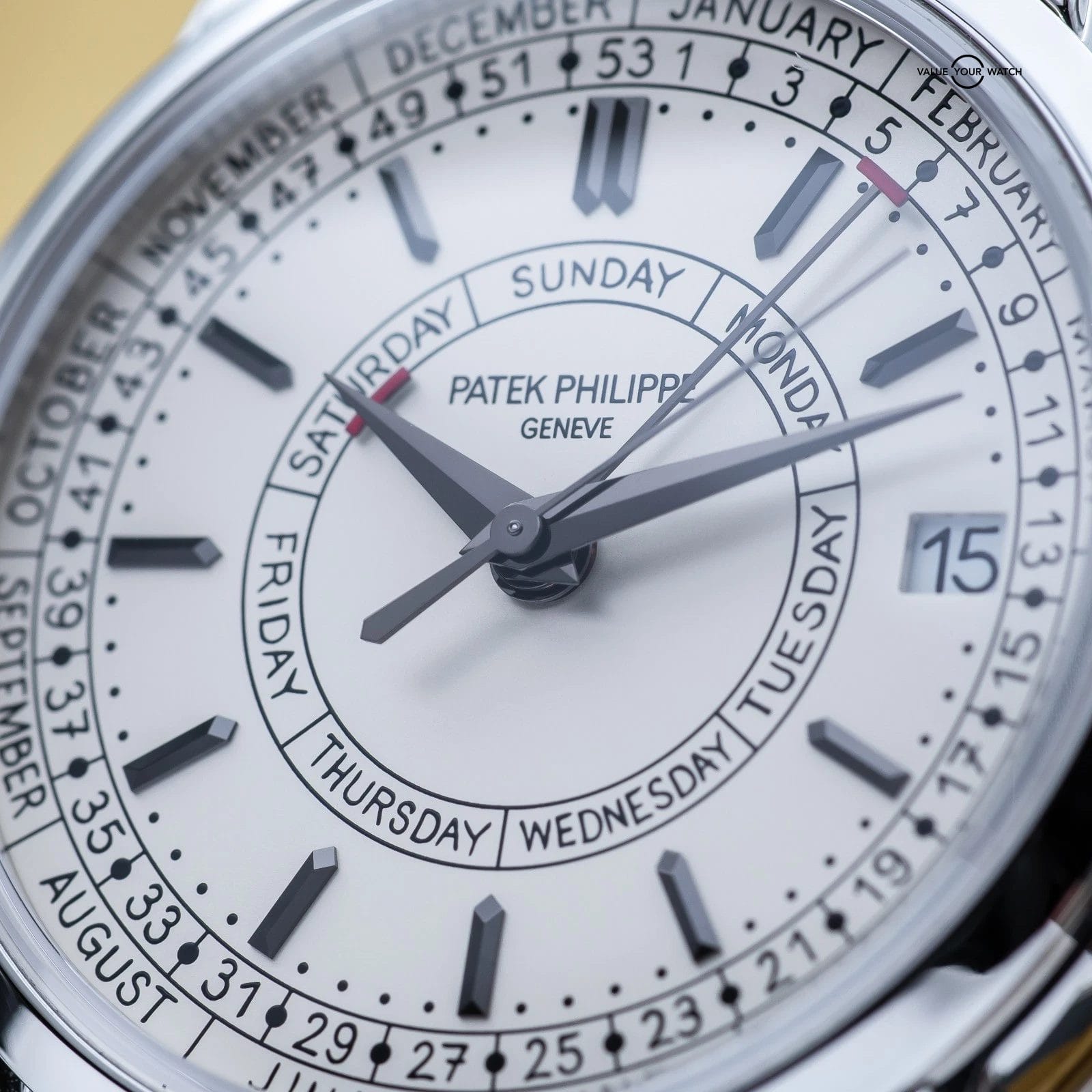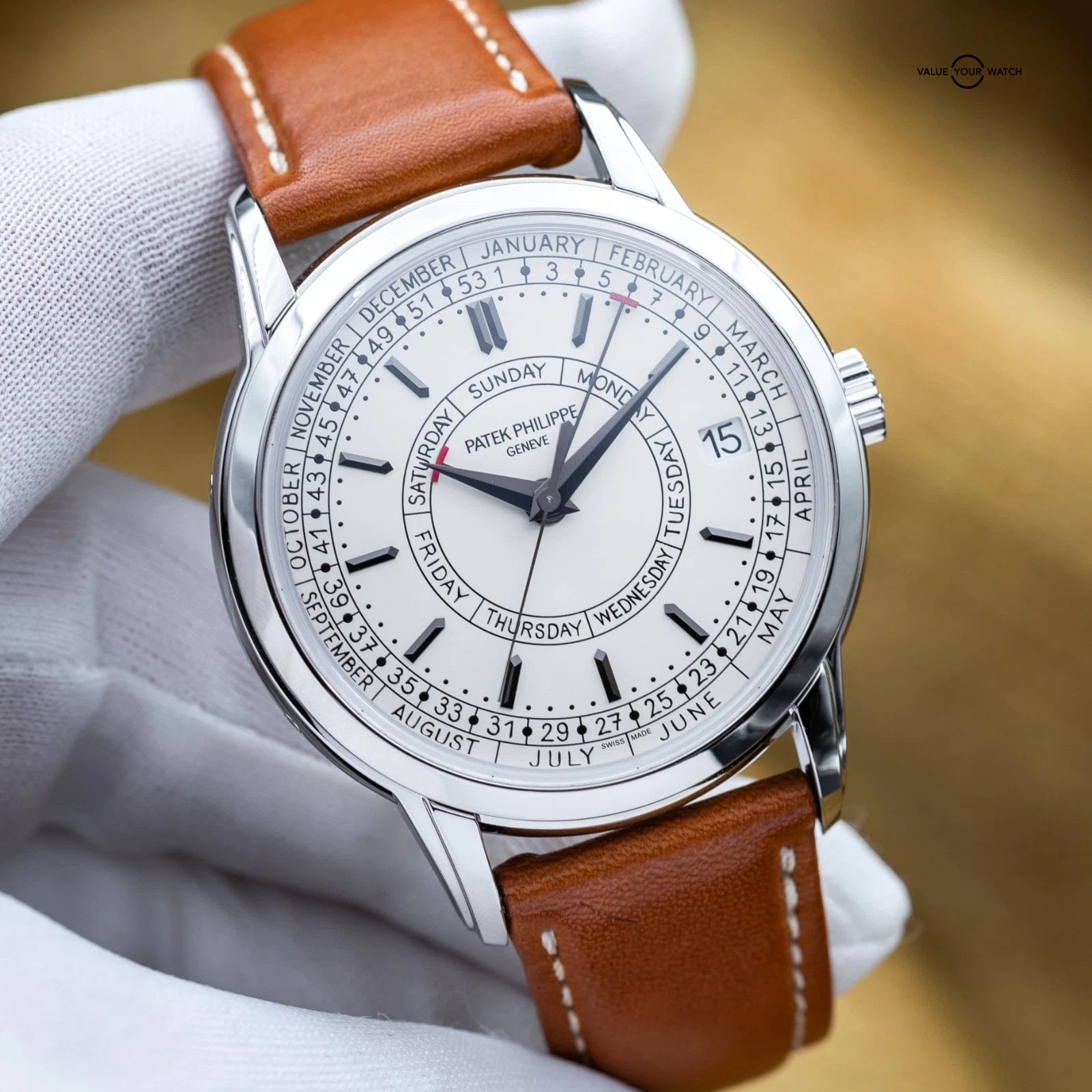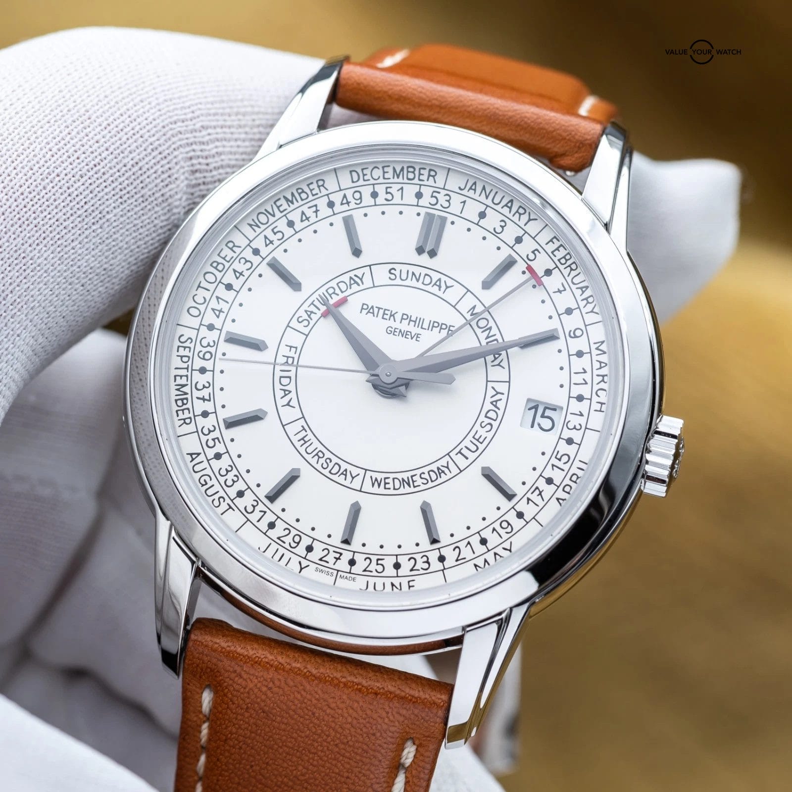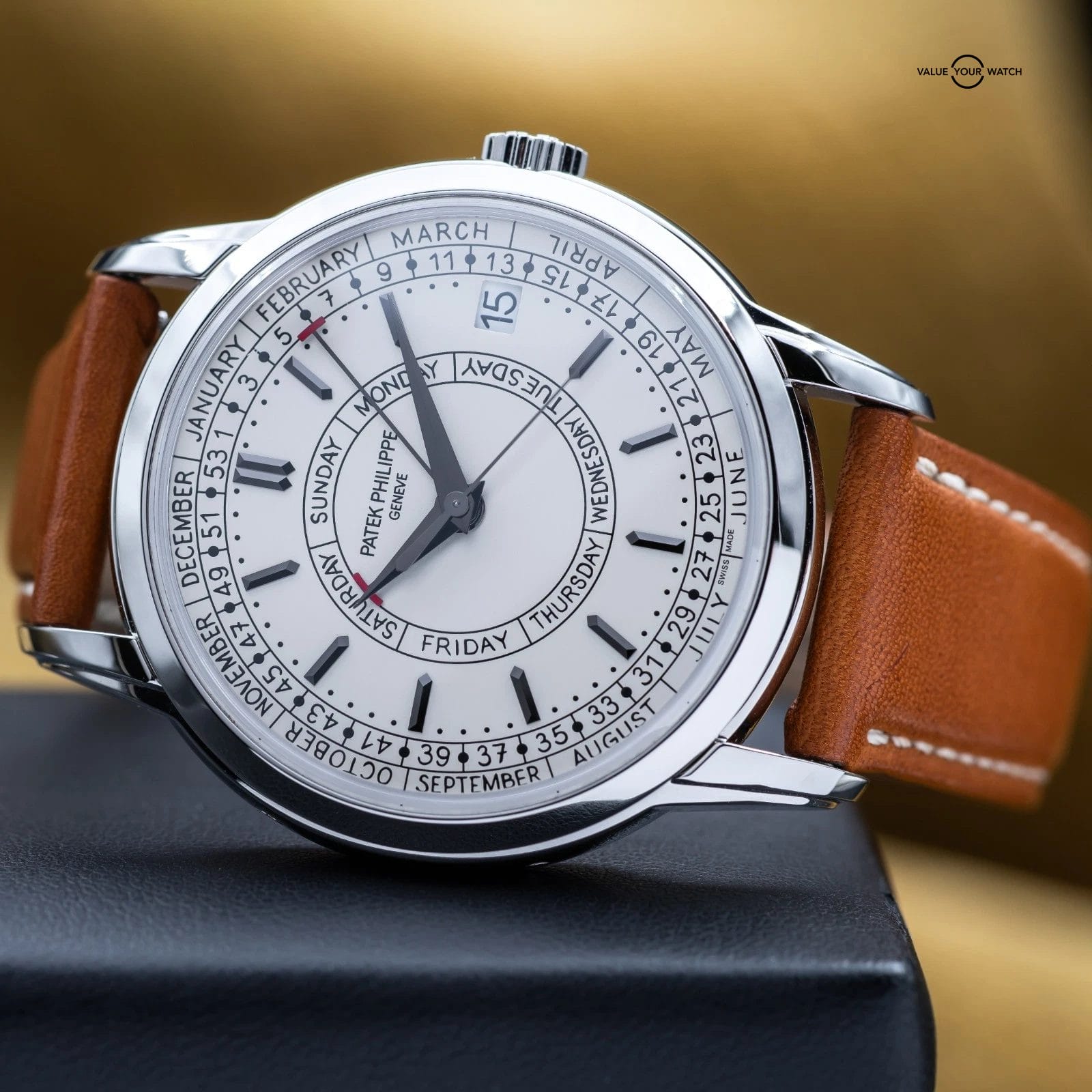 The Patek Philippe Calatrava Weekly Calendar blends classical watchmaking with a modern twist, highlighted by its rare weekly calendar complication. Crafted in stainless steel with a 40 mm case, it features handwritten-style typography for a more casual, contemporary appeal. It also offers a weekly calendar complication – a display showing the current week number of the year in addition to the day and date – driven by a self-winding mechanical movement developed specifically for this model. The Calatrava is a thoughtful, understated statement piece for collectors who value both innovation and tradition.