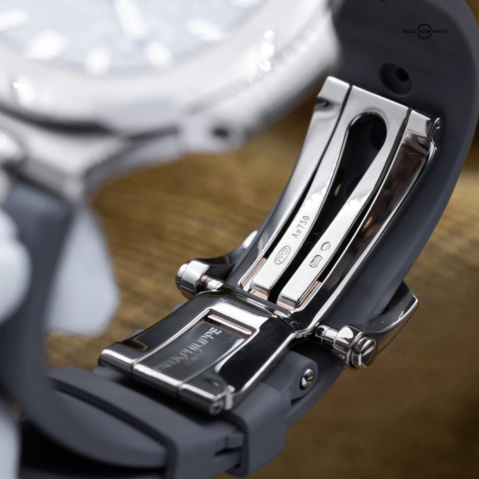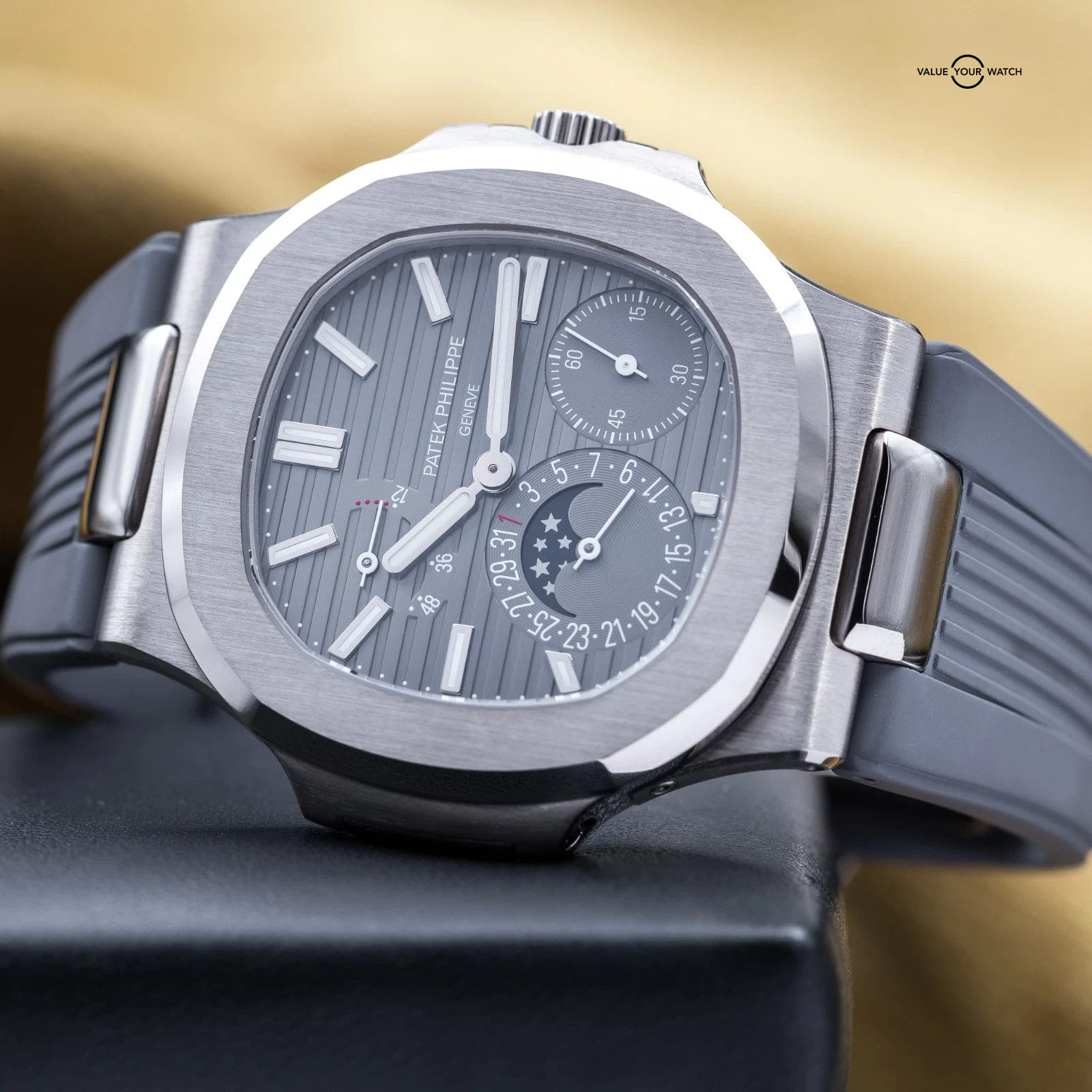 Comes with box and papers (warranty) dated from 2019 purchase. Watch is in complete working order, running very strong, and keeping impeccable time as you’d expect from a Patek. The case, crystal and clasp are in great condition. Watch comes with both a black Patek Philippe leather strap (signs of wear) and an after-market grey rubber strap. Don’t miss your chance to get this grail piece while you can!