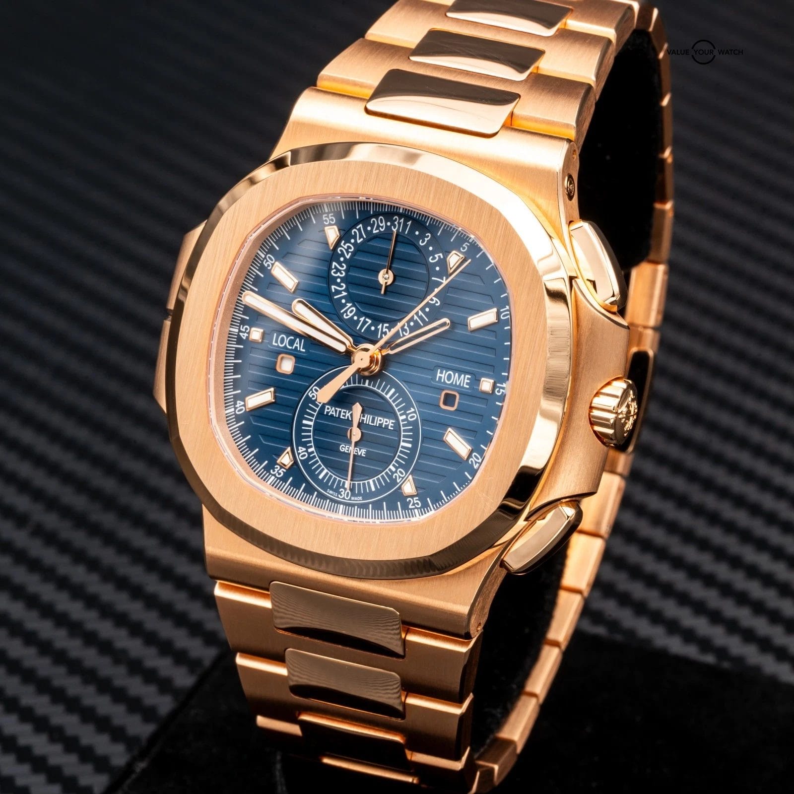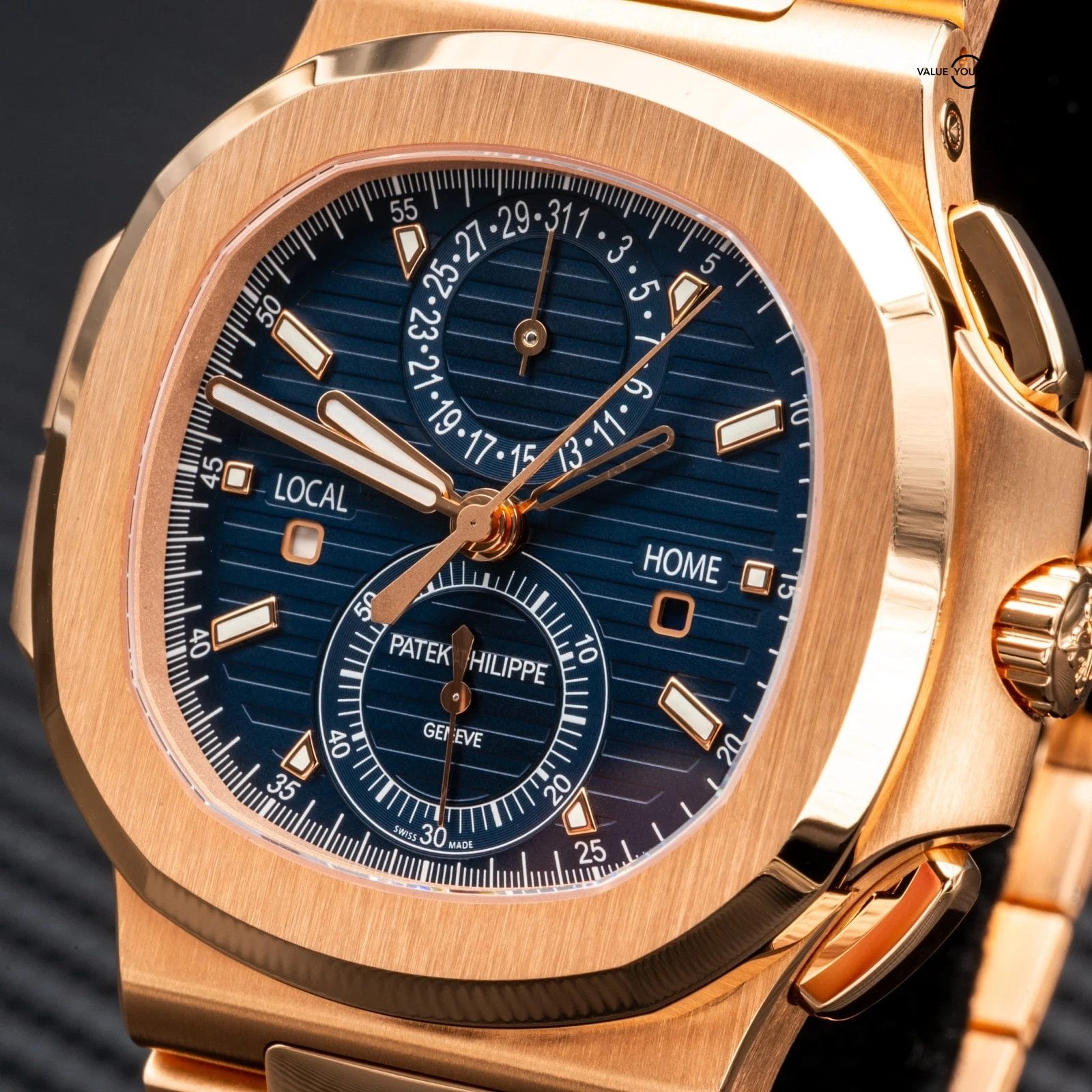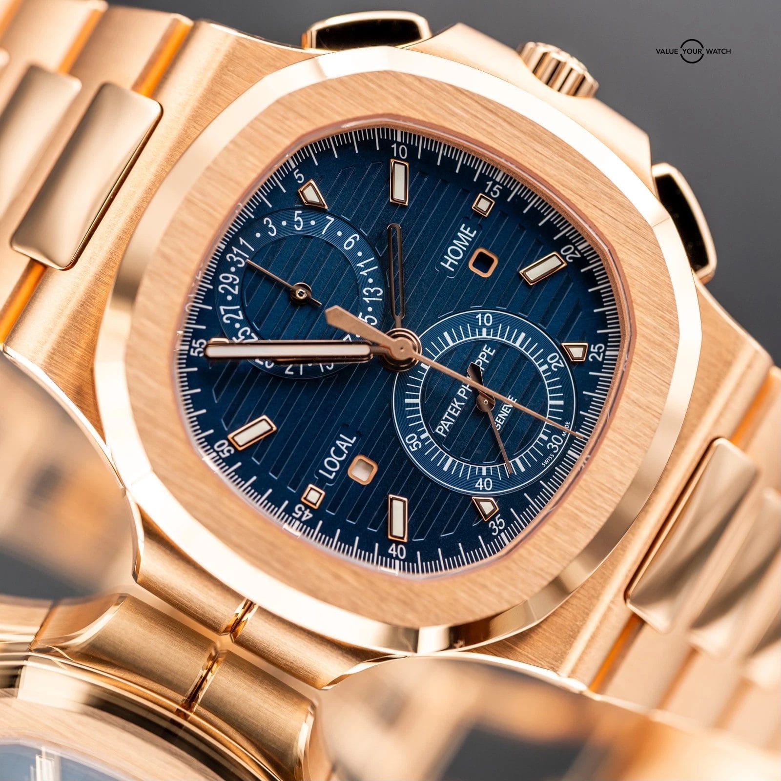 ⌚️UNWORN 2021 Patek Philippe Nautilus 5990/1R Travel Time Chronograph Rose Gold Blue Dial — FULL SET⌚️