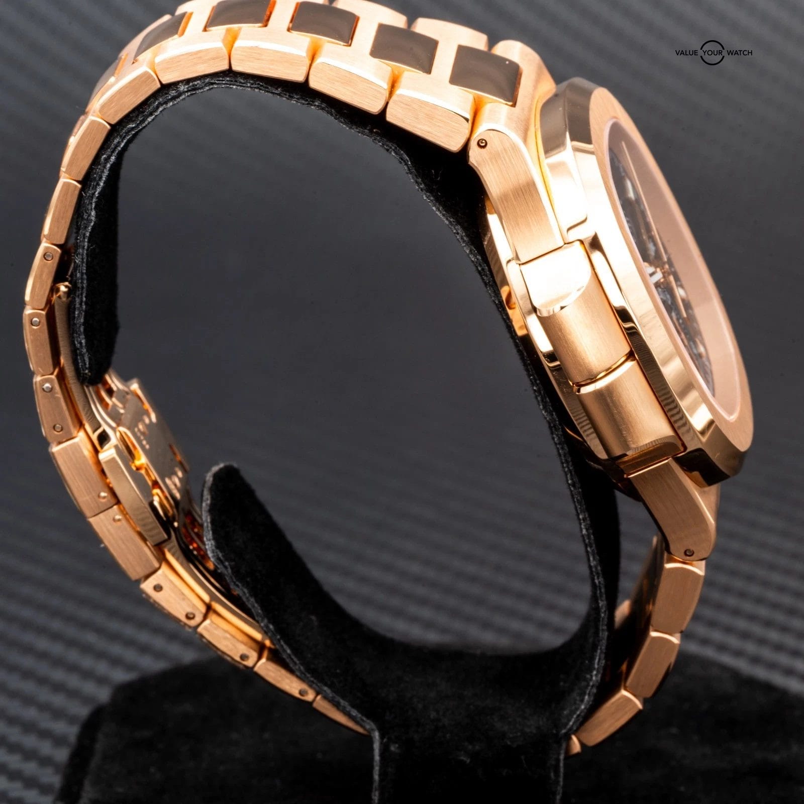 For sale is a 2021 Patek Philippe Nautilus 5990/1R in 18kt rose gold. This legendary, rose gold timepiece has never been worn, includes stickers still on the clasp, and comes with a full set. It is in like-new, unworn condition and has been timegraph tested; running at +2s/day with an amplitude of 310 degrees, so it will not need serviced for years to come.
