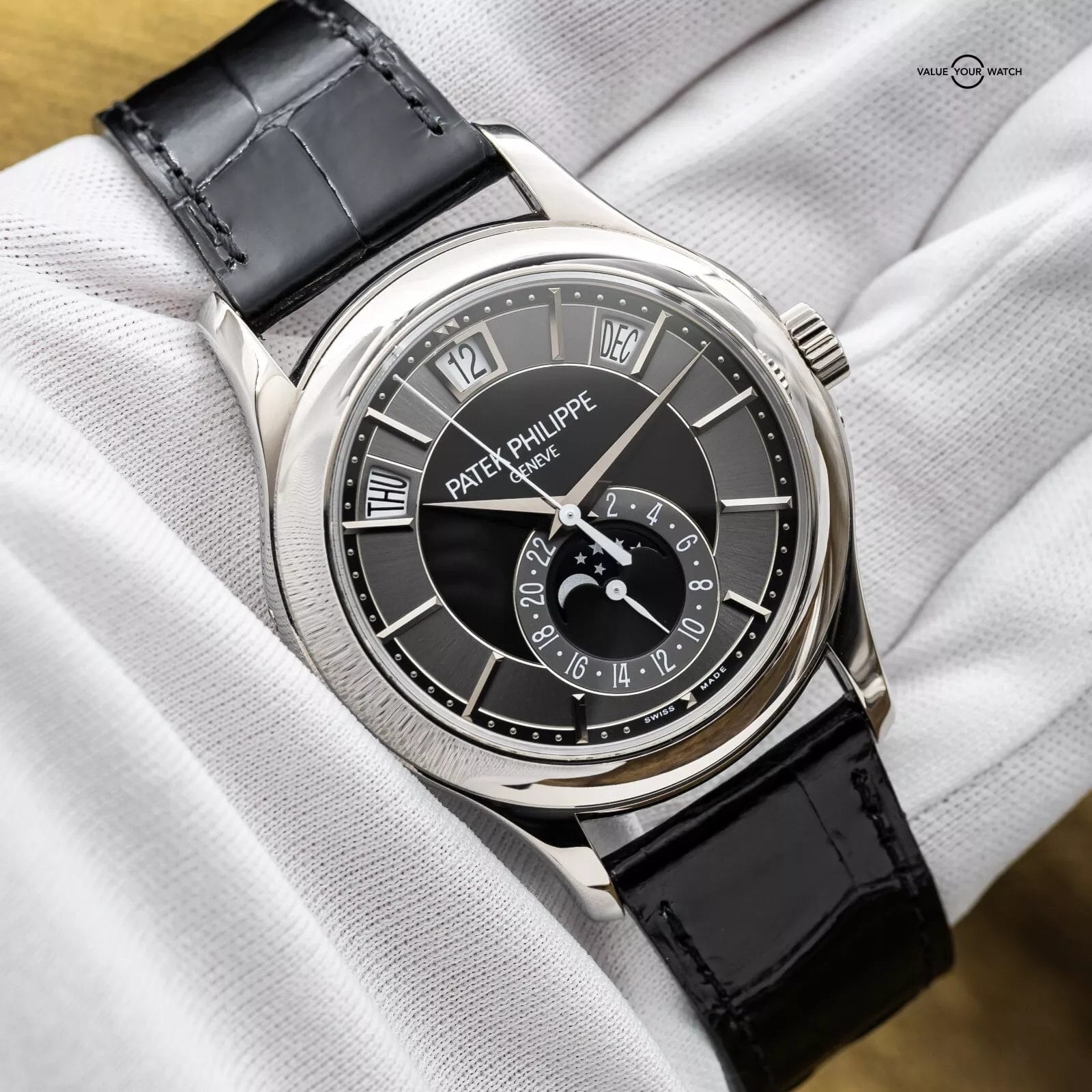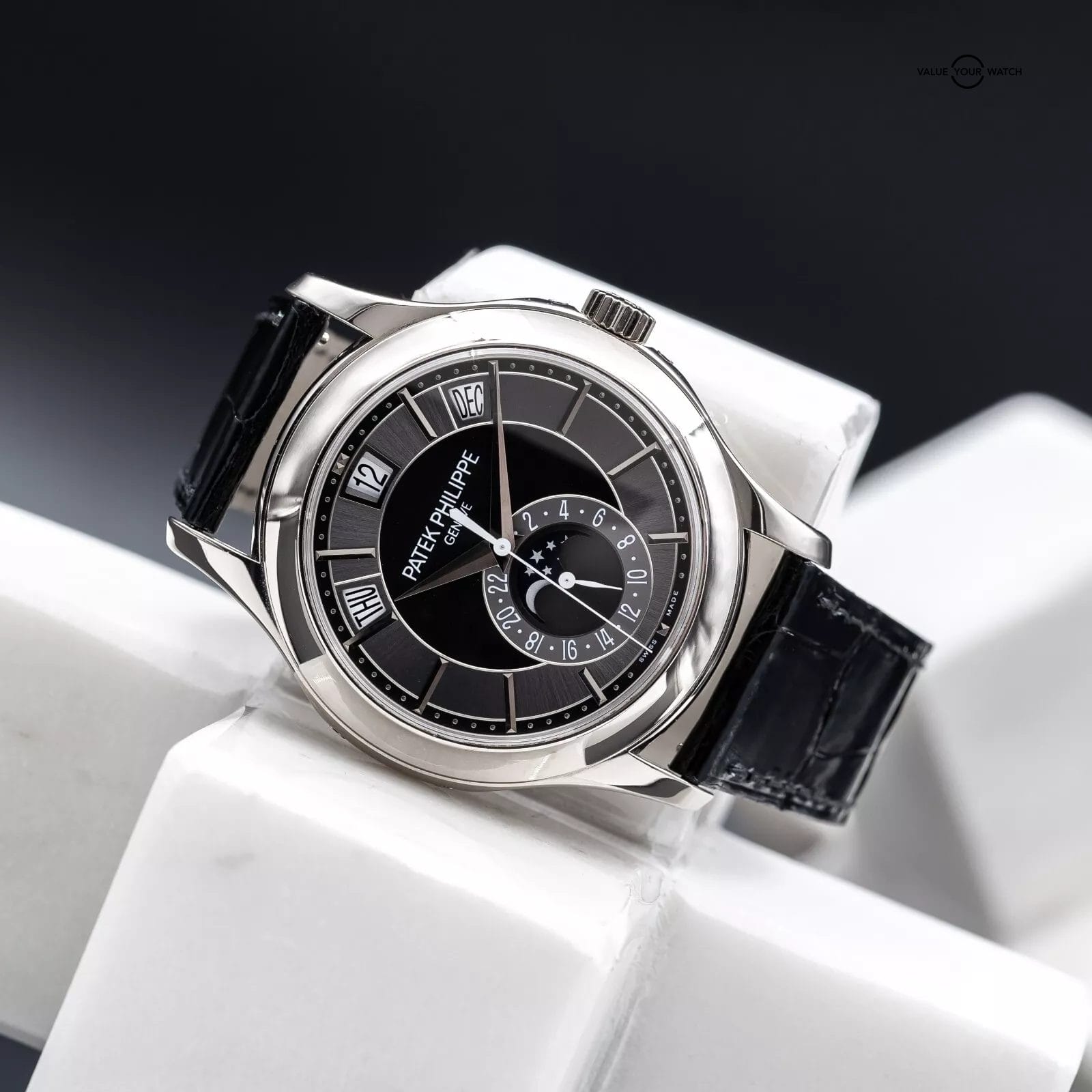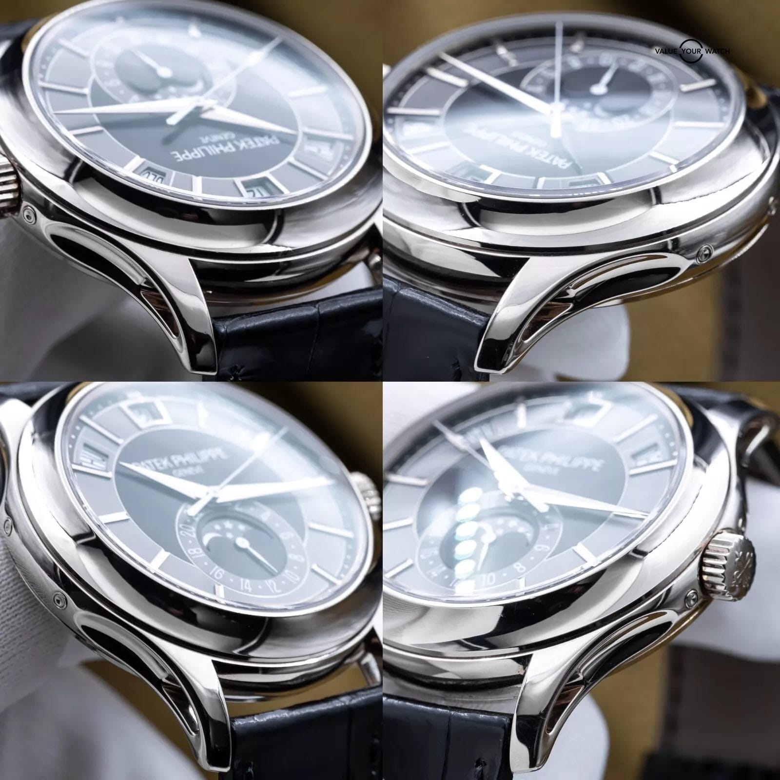 Comes as a full set with all the original inner and outer boxes and all manuals/booklets, and origin papers (warranty) dated from 2012 purchase. Also comes with the white gold annual calendar and moonphase pusher tool. Watch is in complete working order, running very strong, and keeping great time. The case, crystal and buckle are in great condition with only very minor signs of wear (unpolished). Don’t miss your chance to get this Patek while you can!