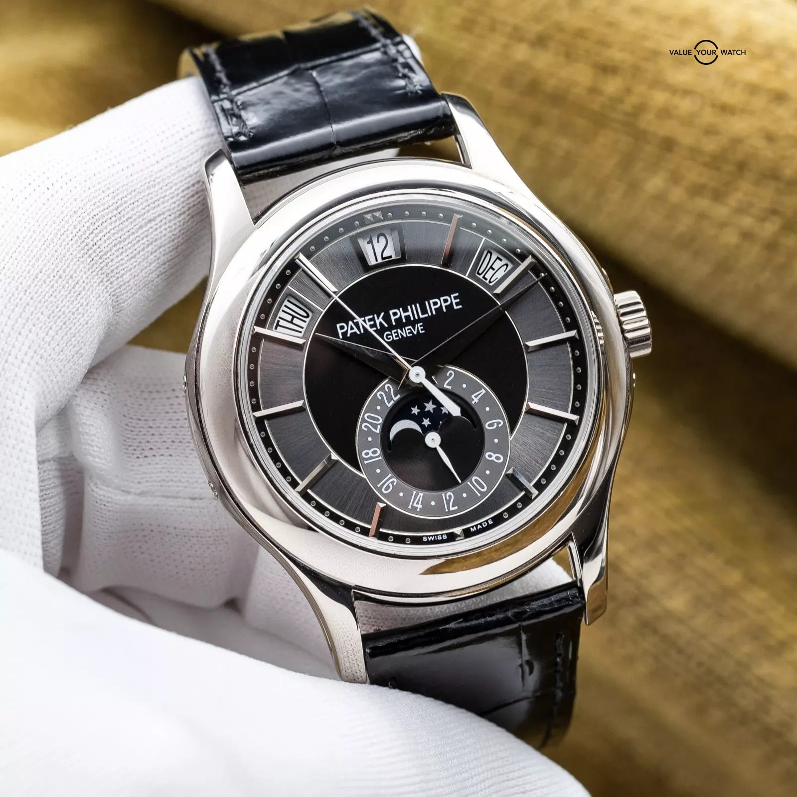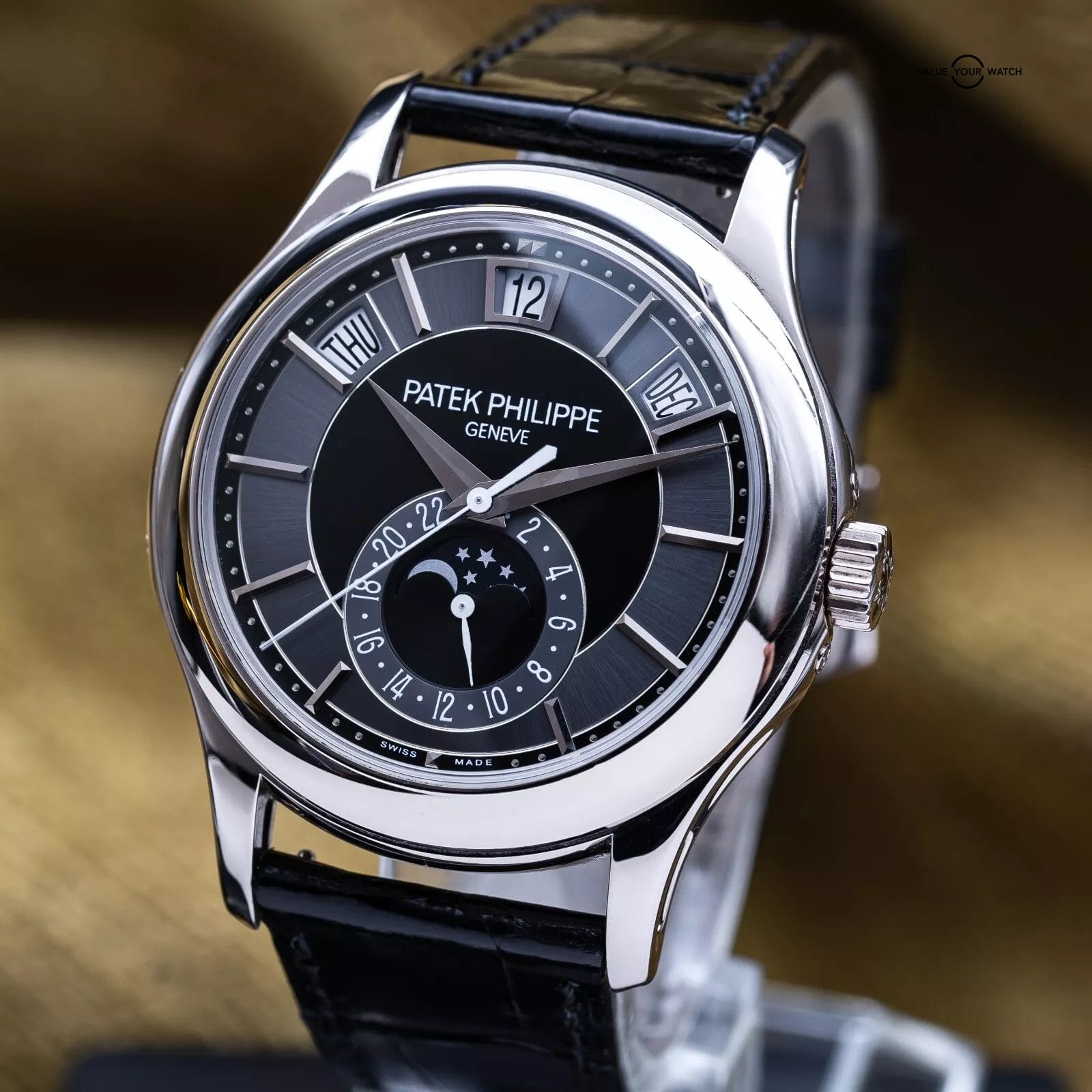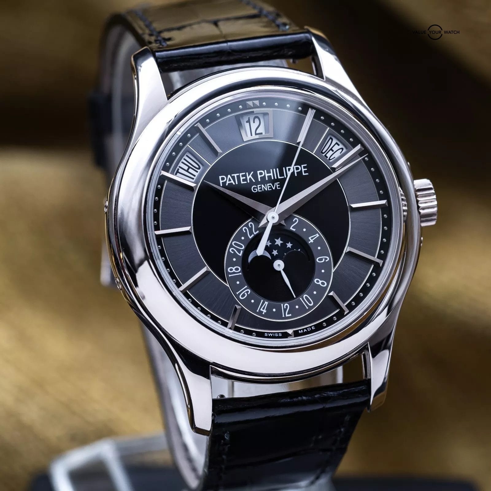 Comes as a full set with all the original inner and outer boxes and all manuals/booklets, and origin papers (warranty) dated from 2012 purchase. Also comes with the white gold annual calendar and moonphase pusher tool. Watch is in complete working order, running very strong, and keeping great time. The case, crystal and buckle are in great condition with only very minor signs of wear (unpolished). Don’t miss your chance to get this Patek while you can!