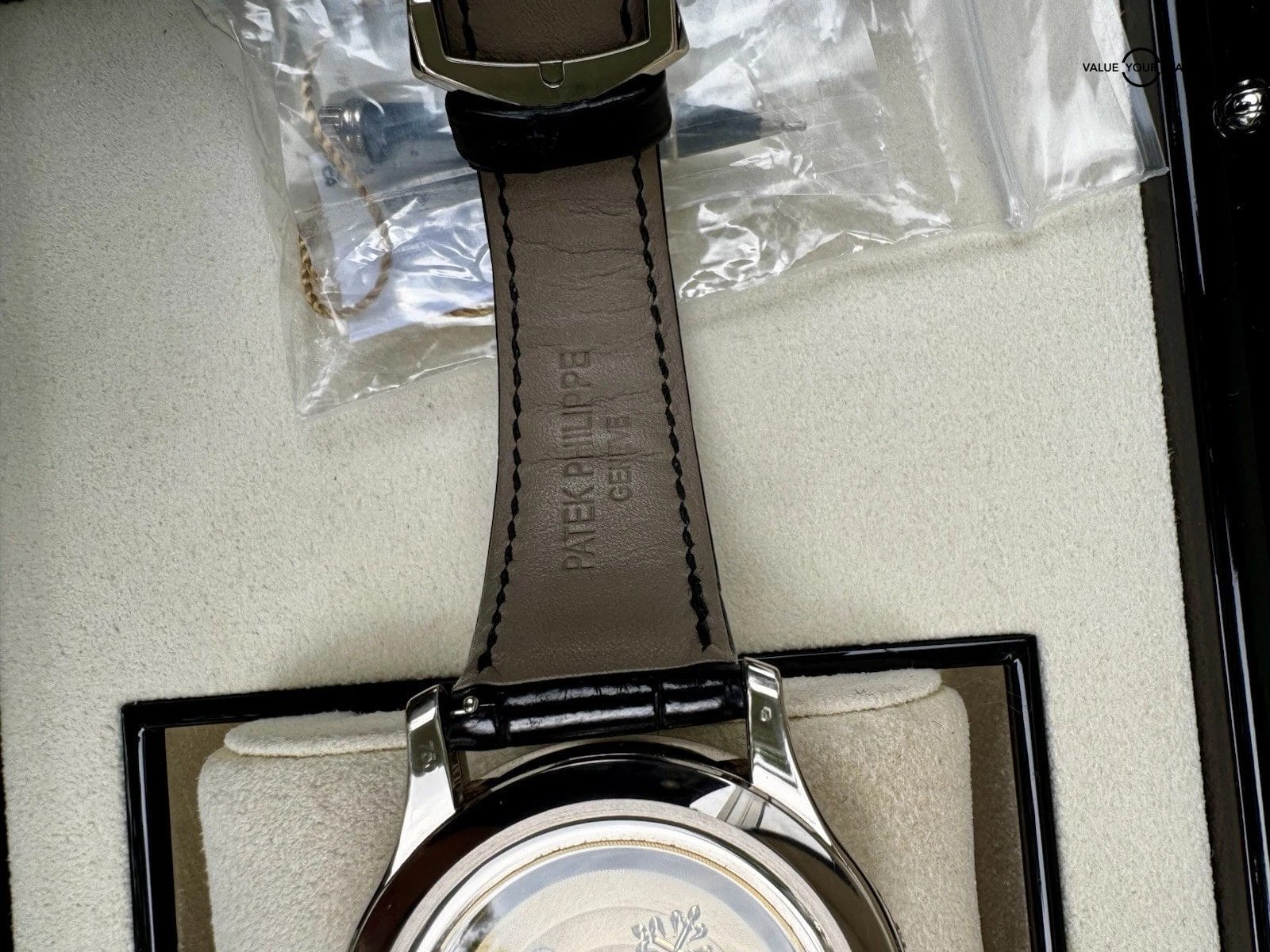 The Patek Philippe Grand Complications Blue Men’s Watch – 5205G-013 is a luxurious timepiece featuring a silver bezel and case, complemented by a blue leather strap. With a sophisticated design including baton indexes, a 12-hour dial, and a water-resistant case, this Swiss-made watch is both functional and stylish. The watch boasts a mechanical automatic movement, 30m water resistance, and comes with original box and papers. The watch also showcases diamond accents and a date indicator, making it a comprehensive and elegant accessory for any man’s wrist.
