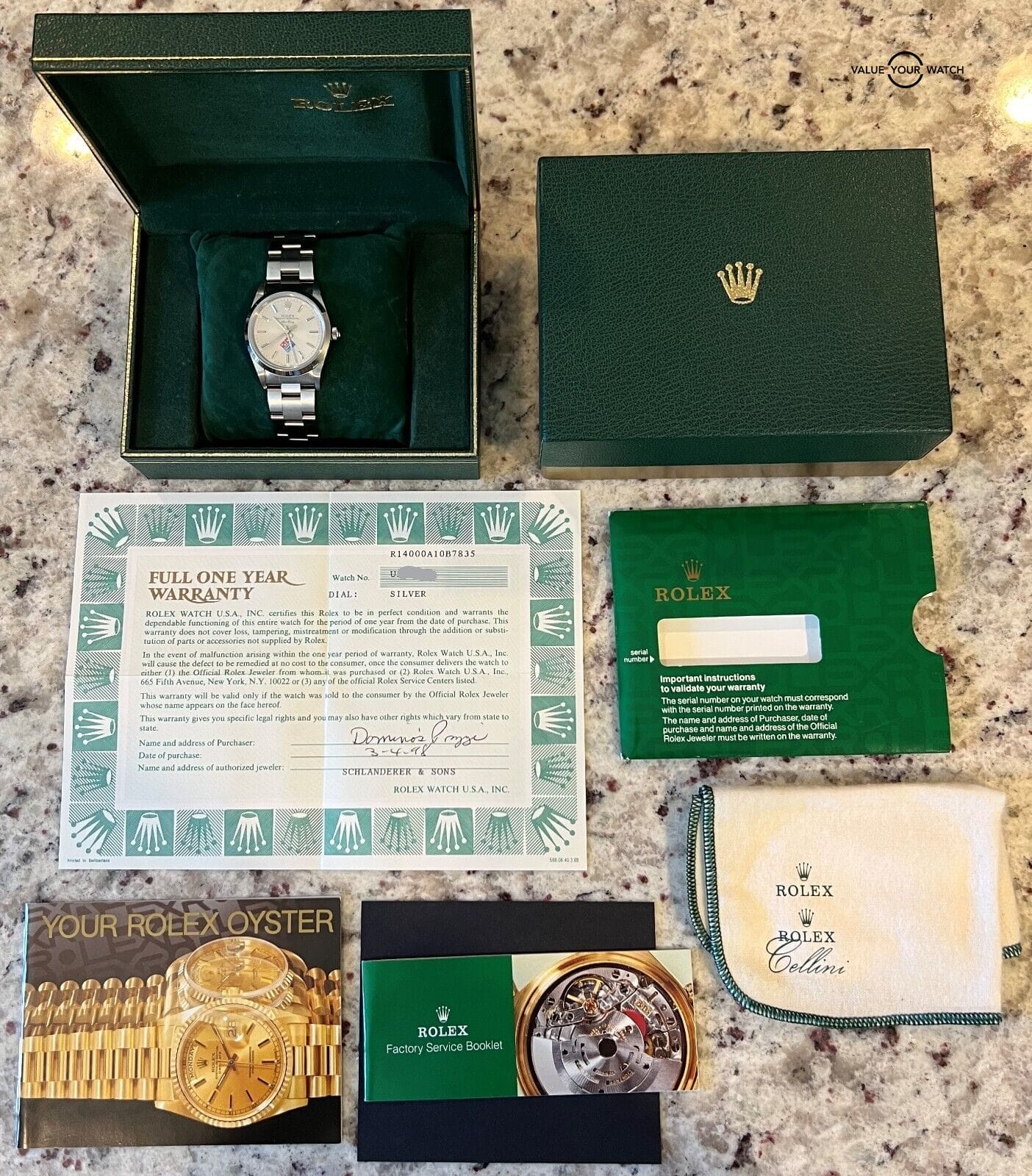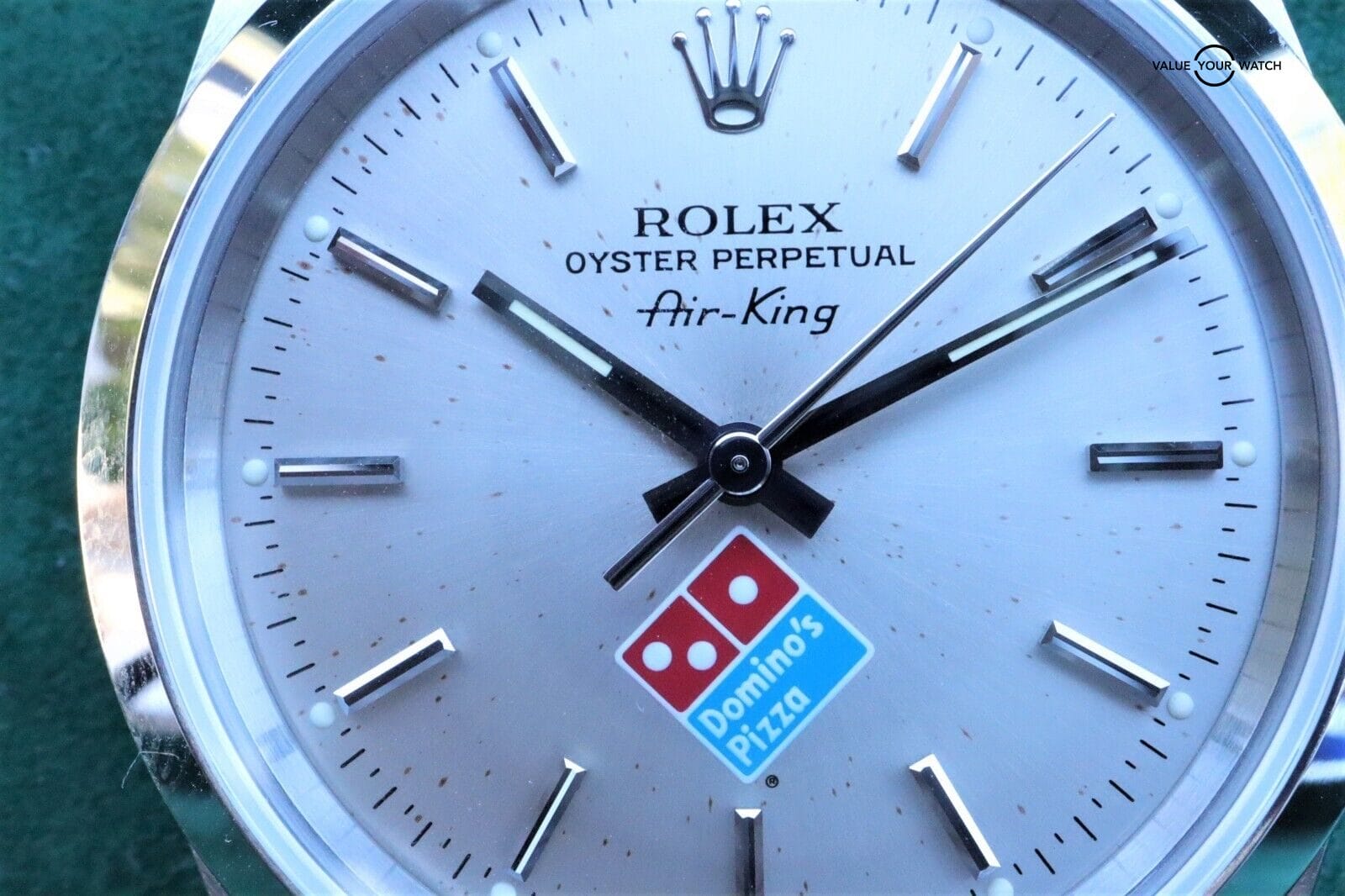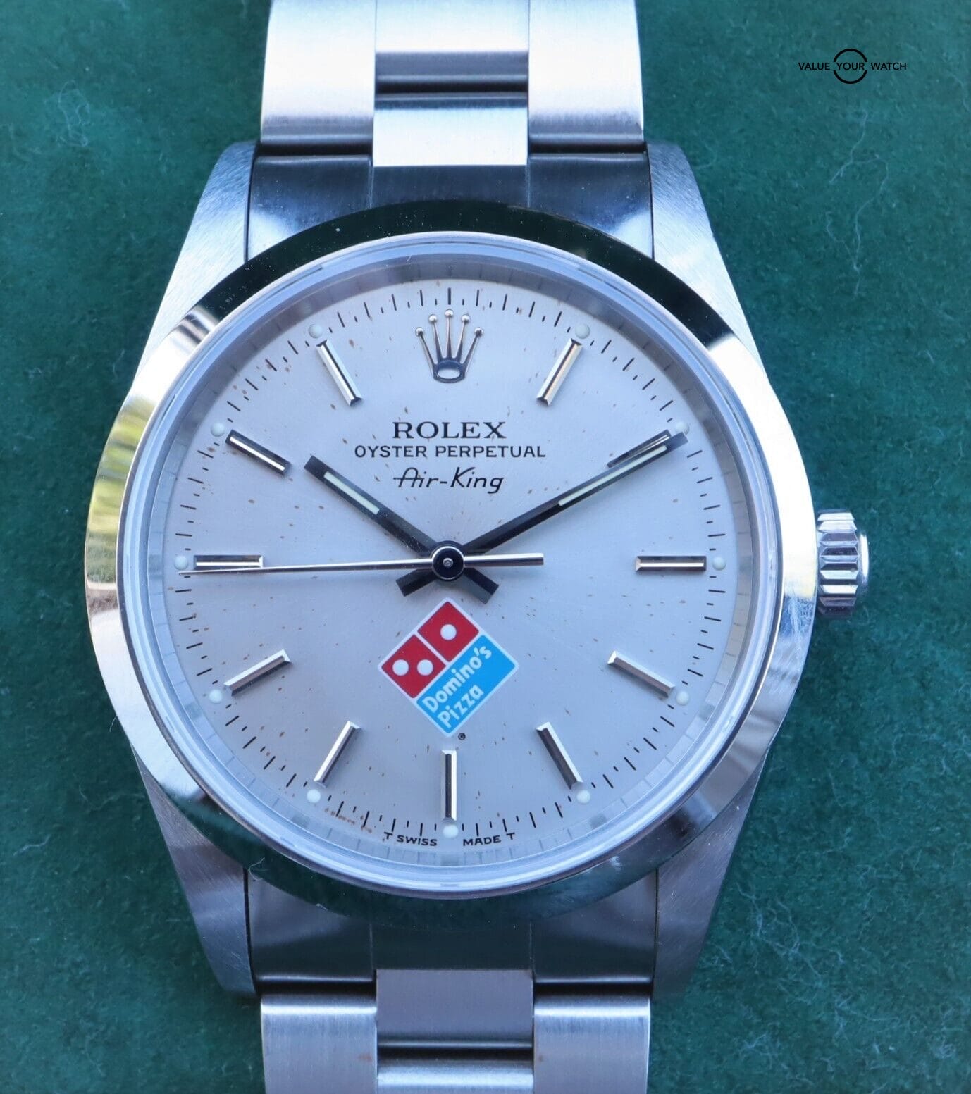 Rolex Air-King 14000 Domino’s Dial Box & Papers RARE!! These watches were not made for purchase by the public, but as a way to reward managers having $25,000 in sales in a week, four weeks in a row. All these watches were originally ordered through Schlanderer and Sons in Ann Arbor, Michigan, where Domino’s has its headquarters. As you can see on the paperwork this one came from there. I am happy to answer all questions about the watch. Just reach out to me via messages. I have many references in the watch world and am happy to provide as many as needed. Feel free to search my username “thegolferguy” in the Rolex Forums under the “Who’s Who” section and see ample feedback