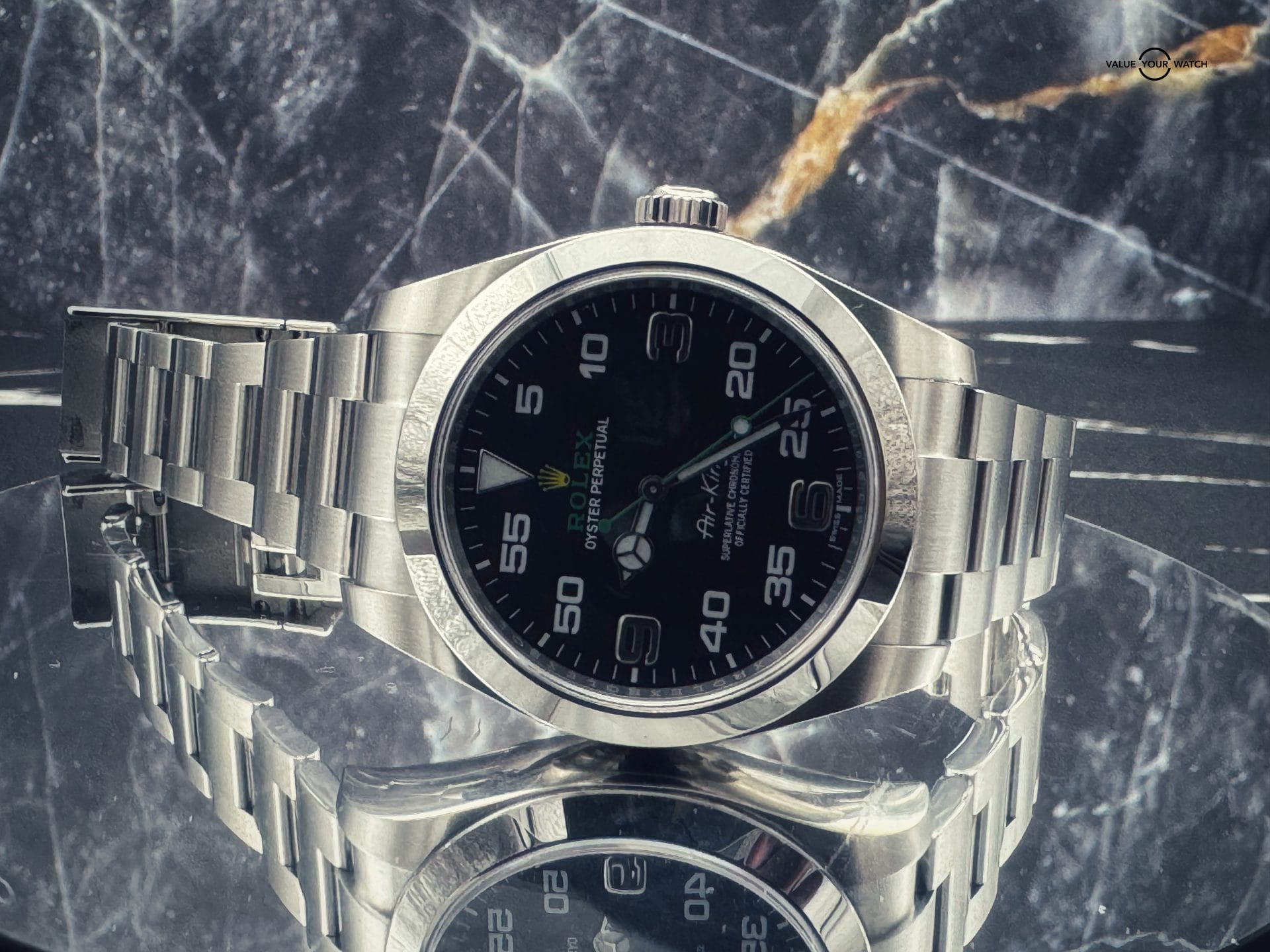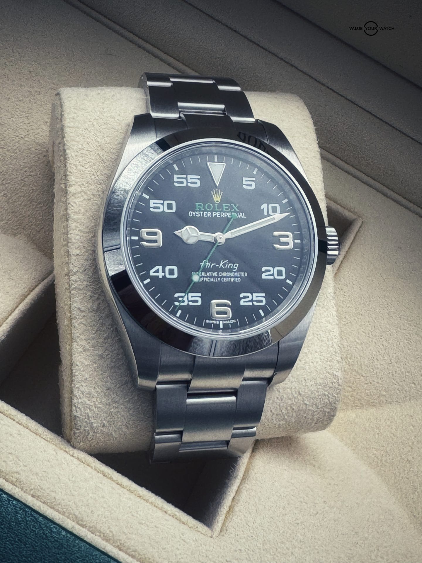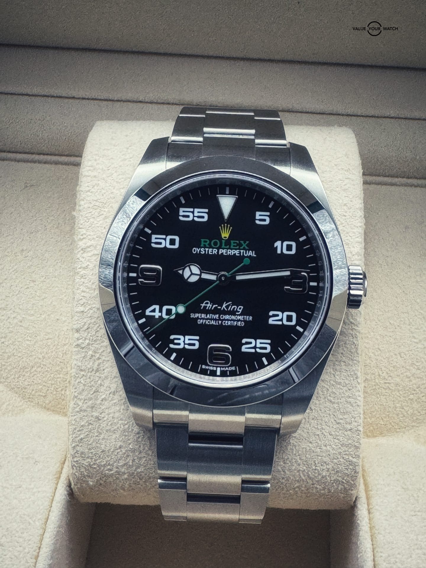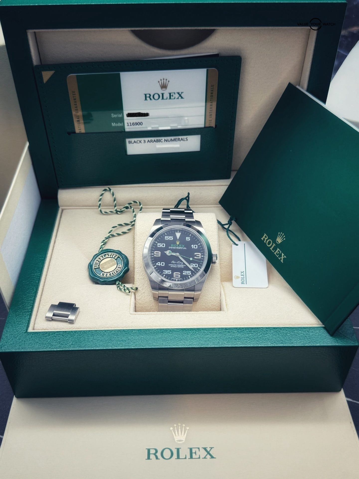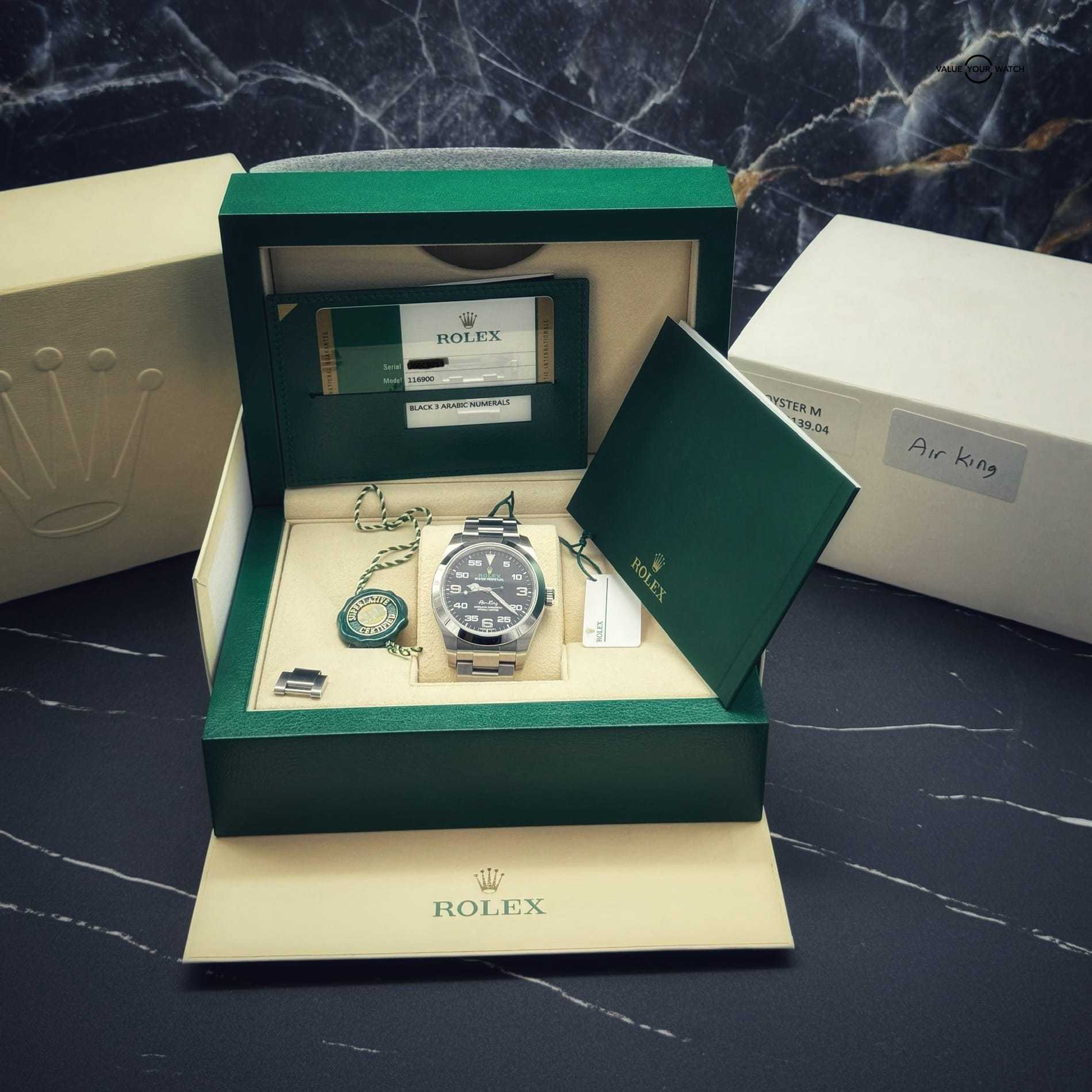 The Rolex Air-King (116900) features a 40mm Oystersteel case with a smooth bezel. The black dial showcases bold silver-toned Arabic numerals at 3, 6, and 9 o’clock, enhanced by luminous hour markers and hands for legibility in low light. It includes a 60-minute scale with white Arabic numerals for added detail. Finished with an Oyster bracelet, this Air-King is a standout piece.