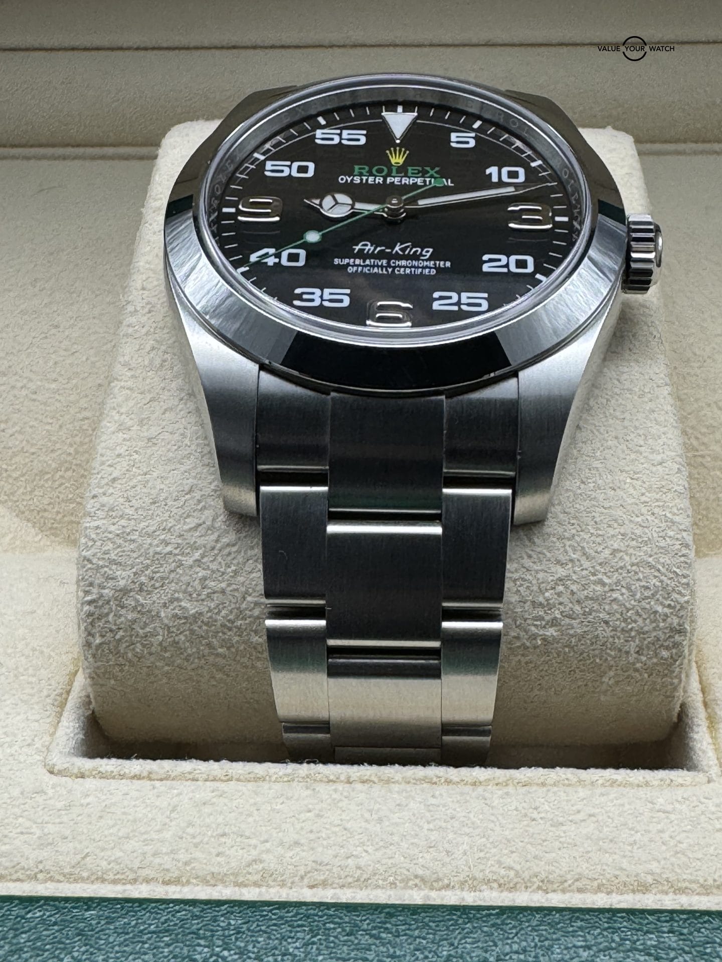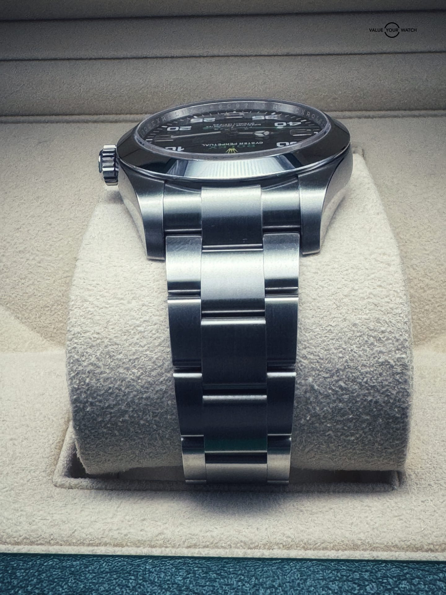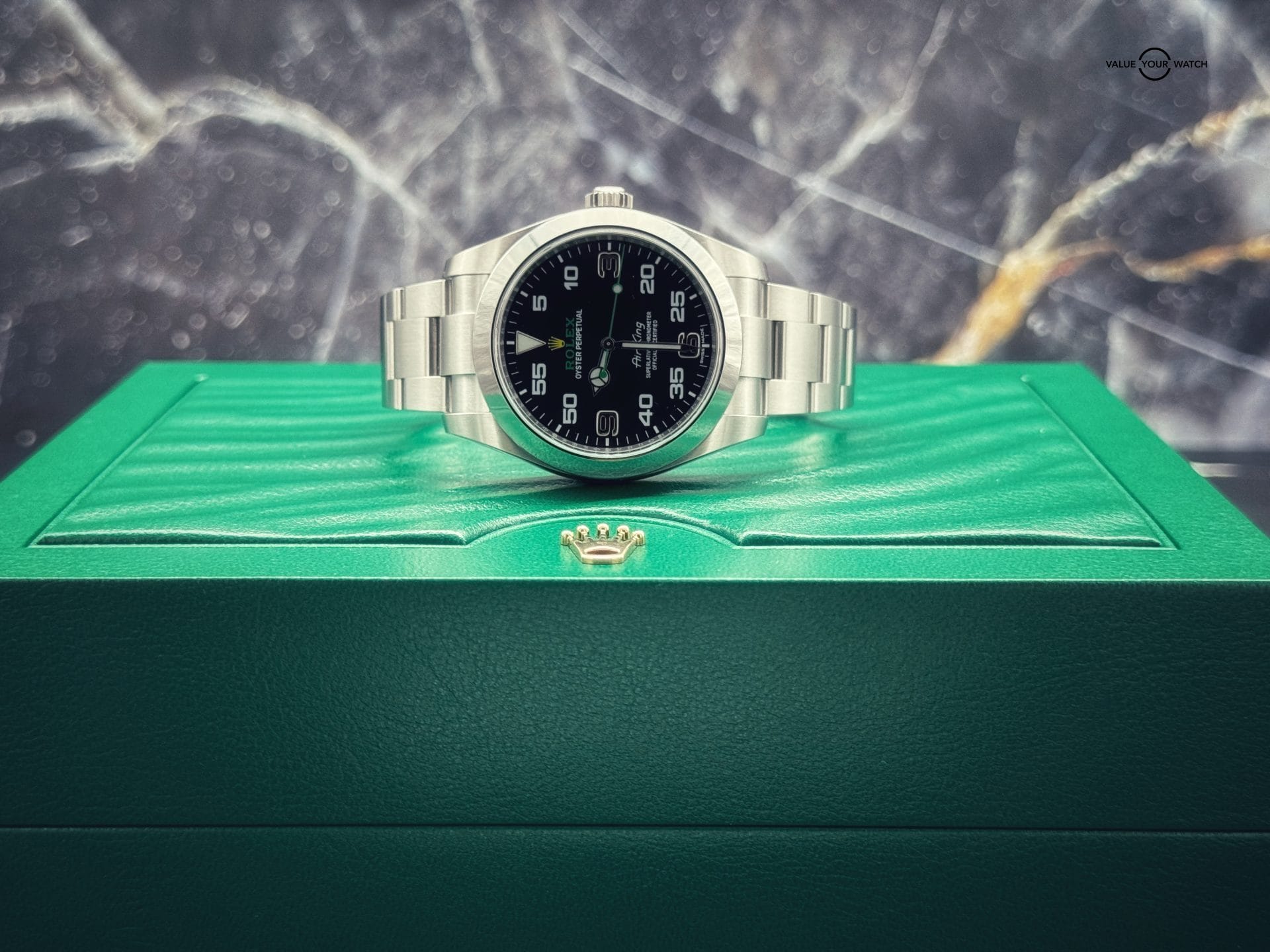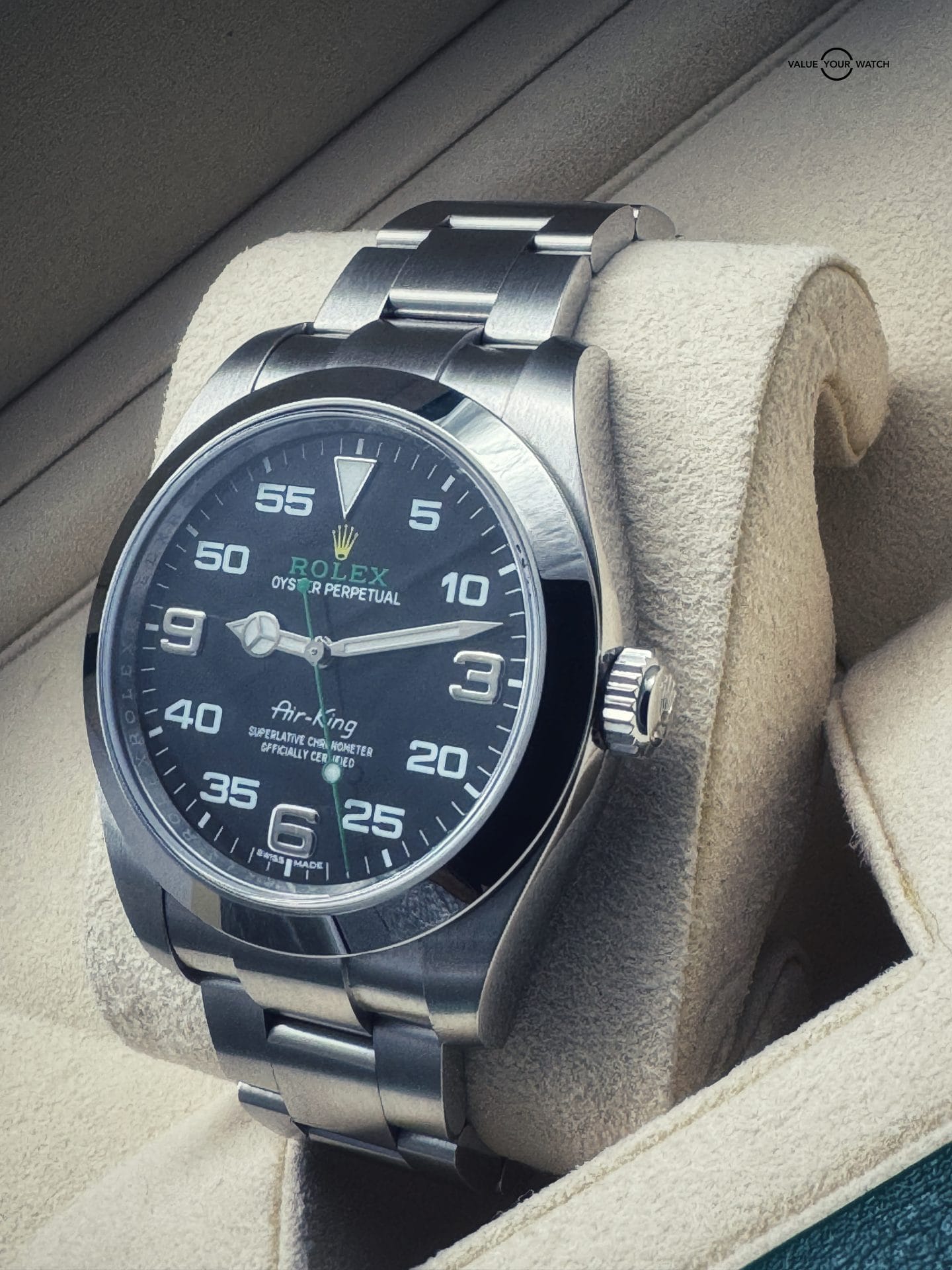 The Rolex Air-King (116900) features a 40mm Oystersteel case with a smooth bezel. The black dial showcases bold silver-toned Arabic numerals at 3, 6, and 9 o’clock, enhanced by luminous hour markers and hands for legibility in low light. It includes a 60-minute scale with white Arabic numerals for added detail. Finished with an Oyster bracelet, this Air-King is a standout piece.
