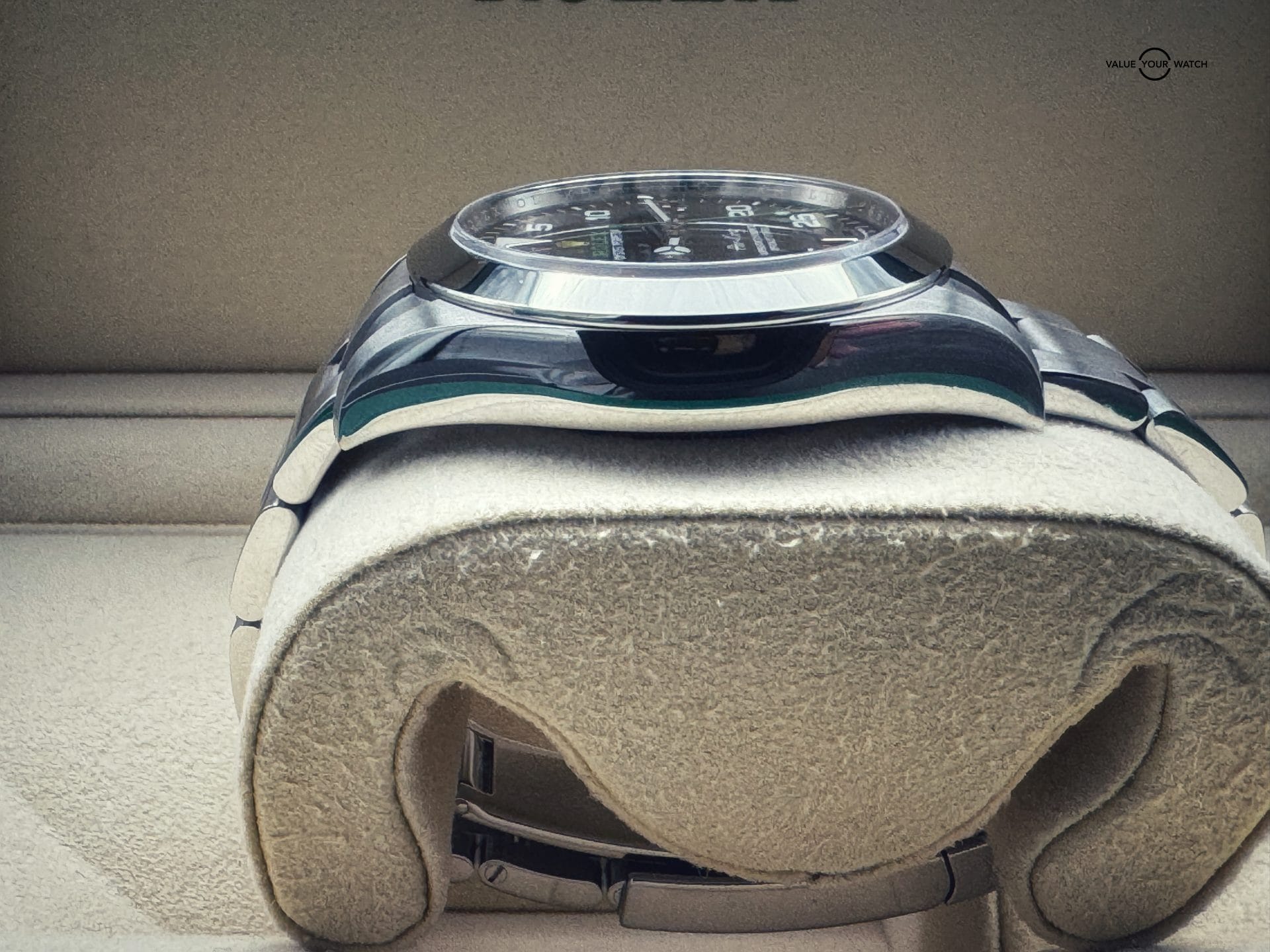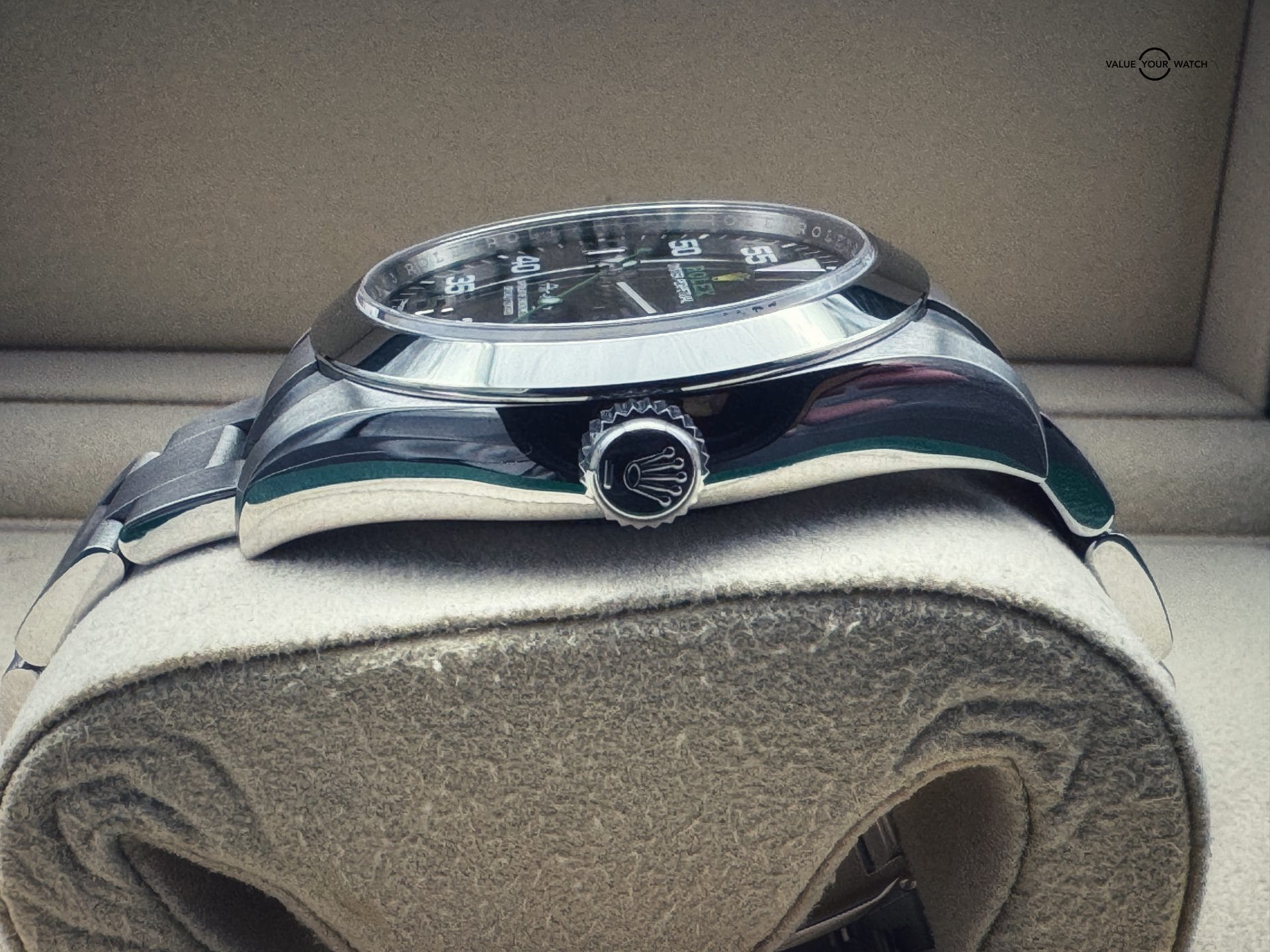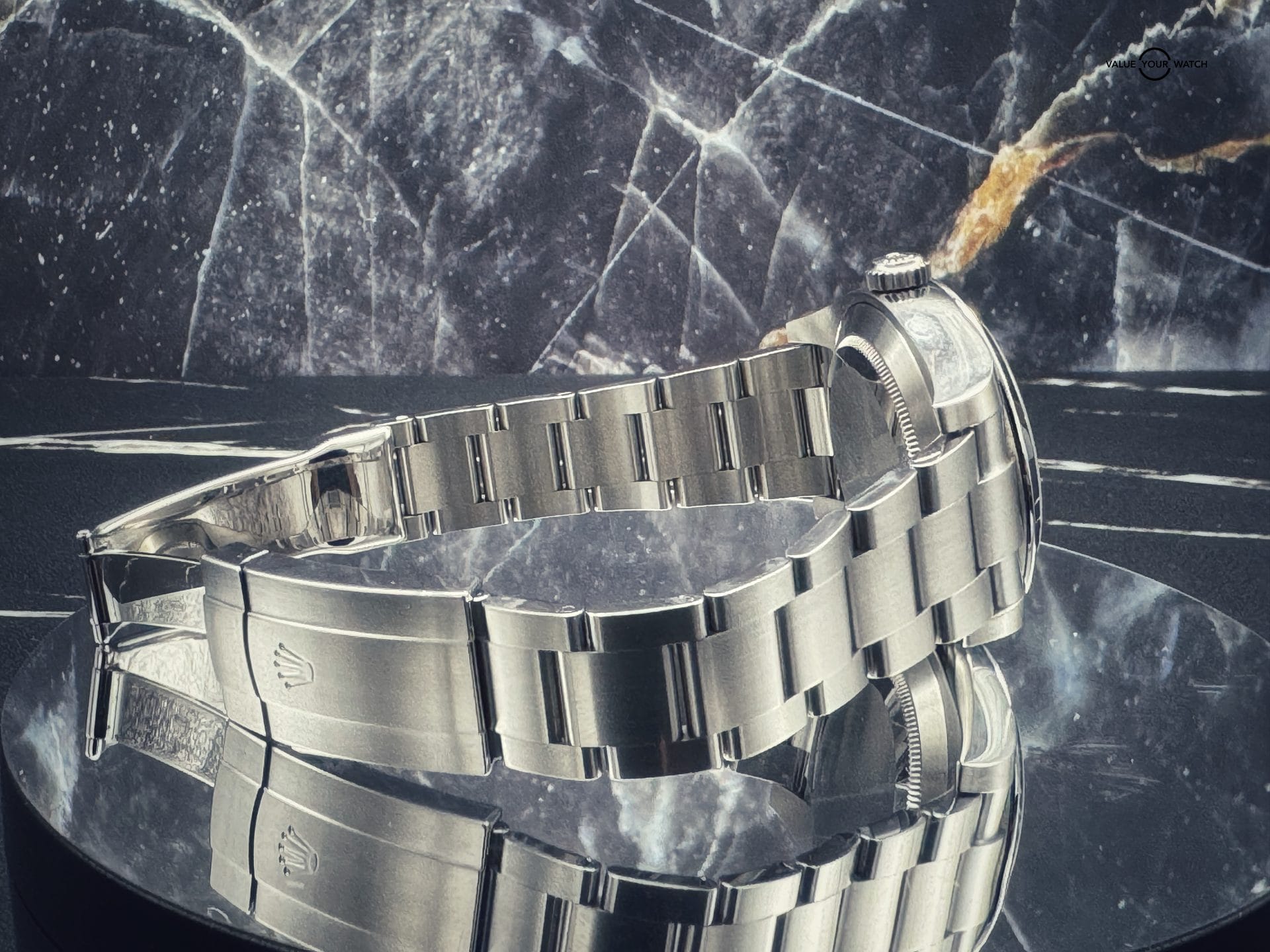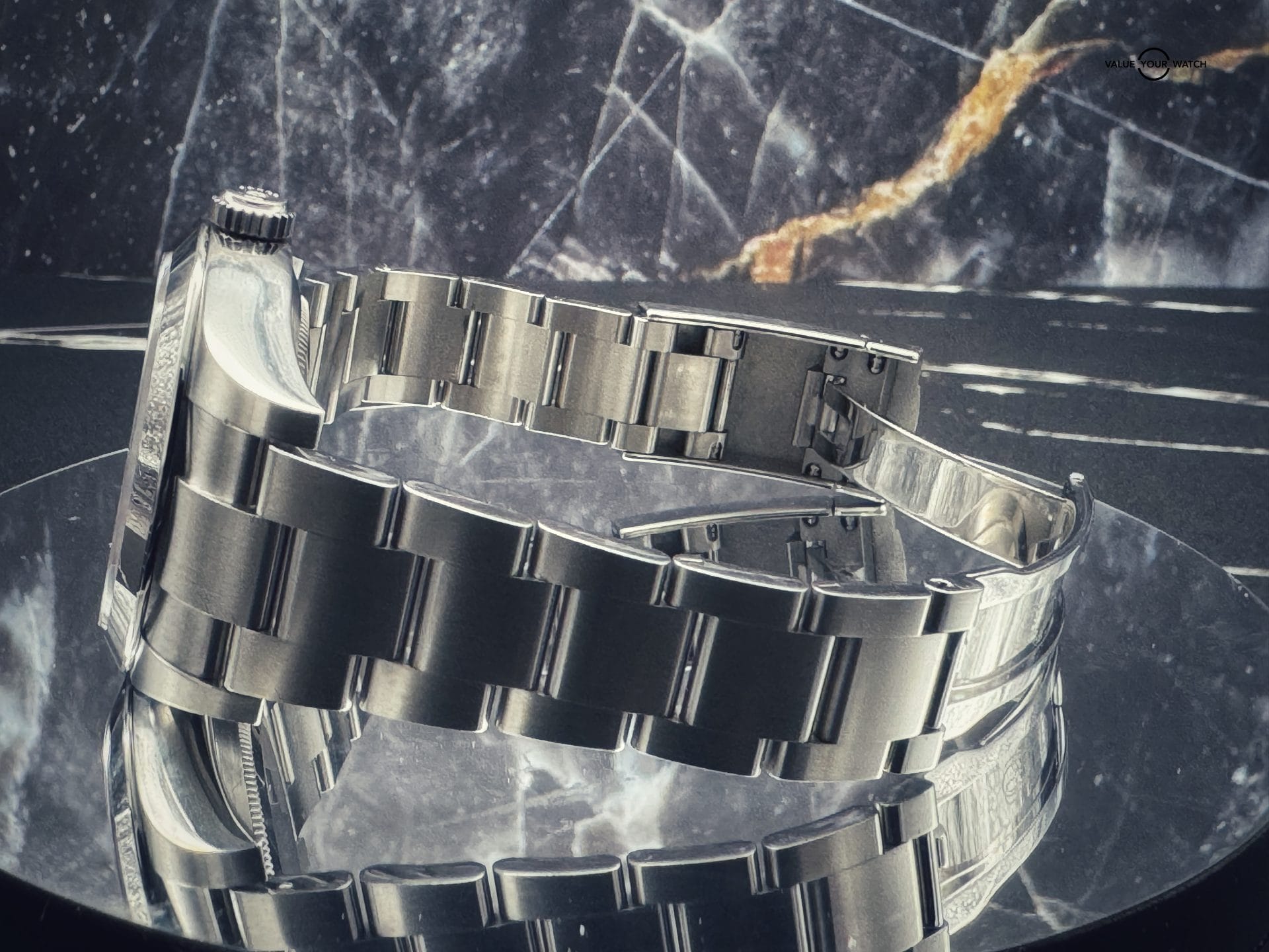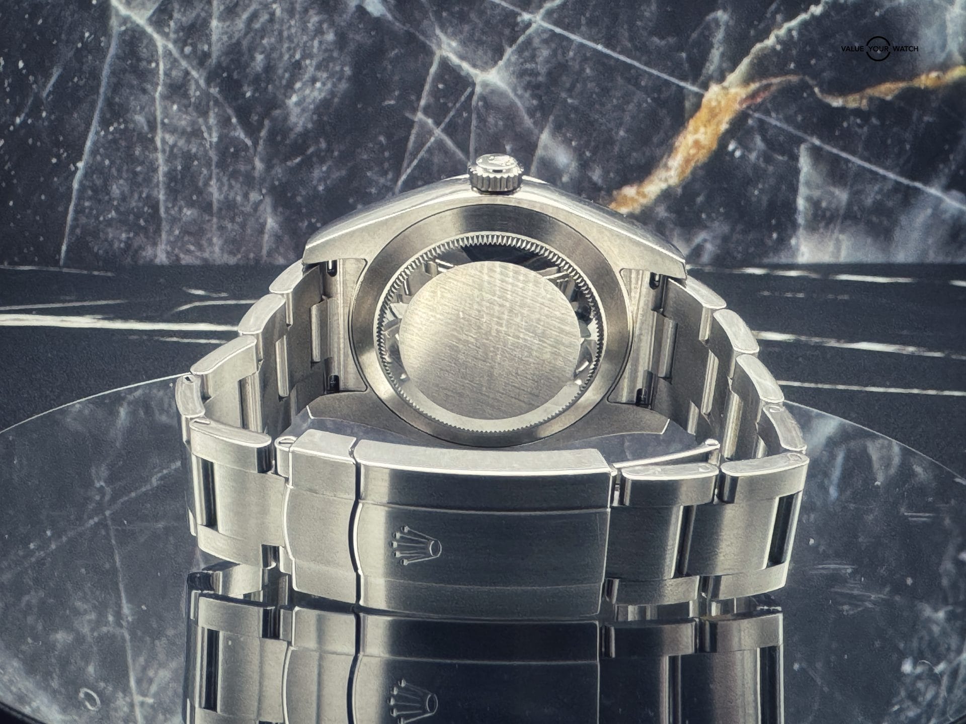 The Rolex Air-King (116900) features a 40mm Oystersteel case with a smooth bezel. The black dial showcases bold silver-toned Arabic numerals at 3, 6, and 9 o’clock, enhanced by luminous hour markers and hands for legibility in low light. It includes a 60-minute scale with white Arabic numerals for added detail. Finished with an Oyster bracelet, this Air-King is a standout piece.
