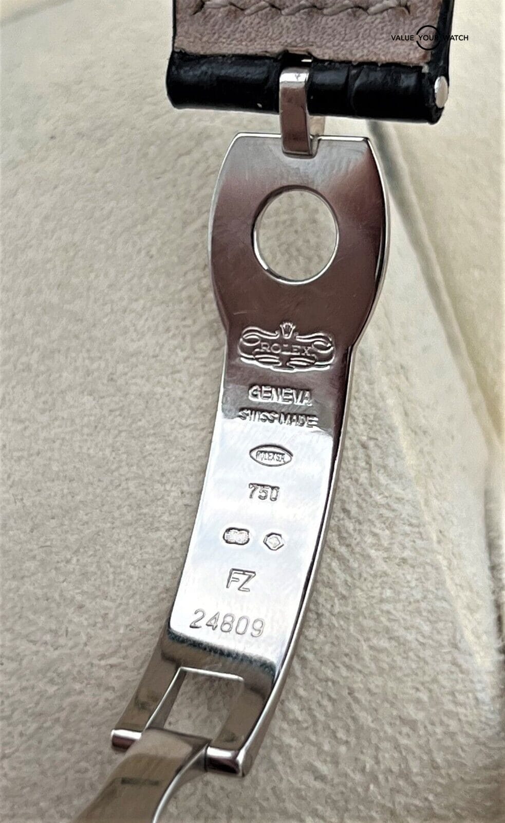This beautiful timepiece comes with an inner/outer box set, booklets, and original warranty card (Dated July 24, 2014). It features one of the rarer combinations offered in the Cellini lineup. It’s a mixed 18K White Gold case with 18K Rose Gold Bezel, Rose Dial with Arabic numerals. It comes with the 18K White Gold deployant clasp and black alligator leather band. Everything Is functioning as it should. Serial numbers and names are blurred in photos only for privacy reasons.