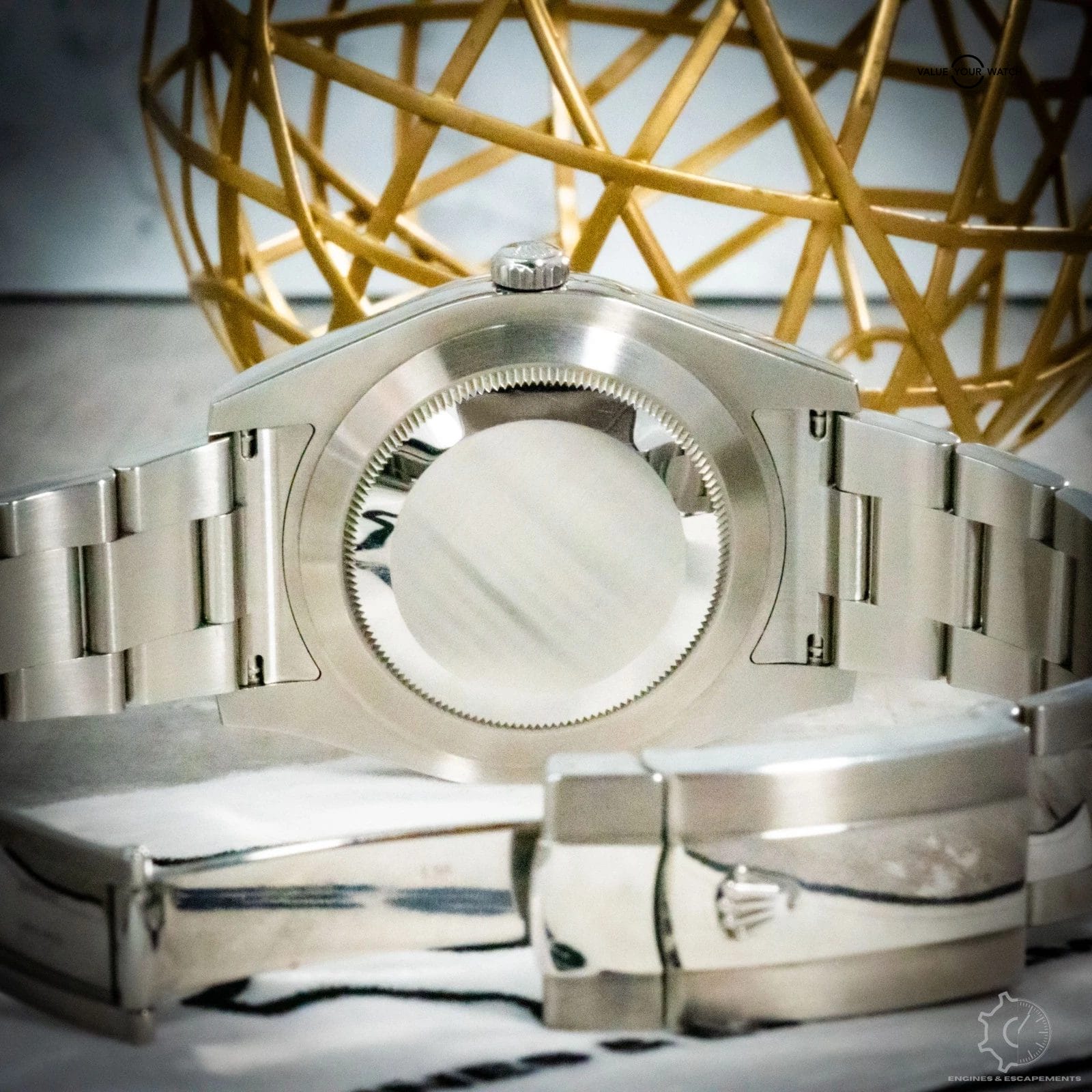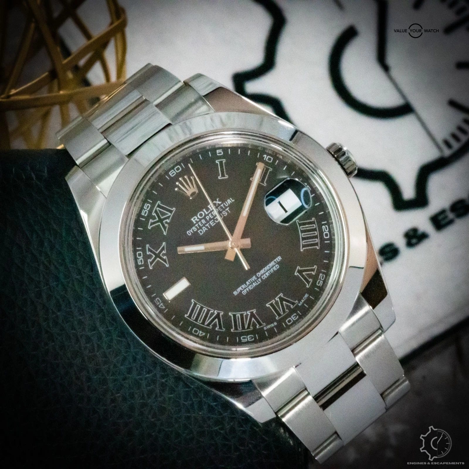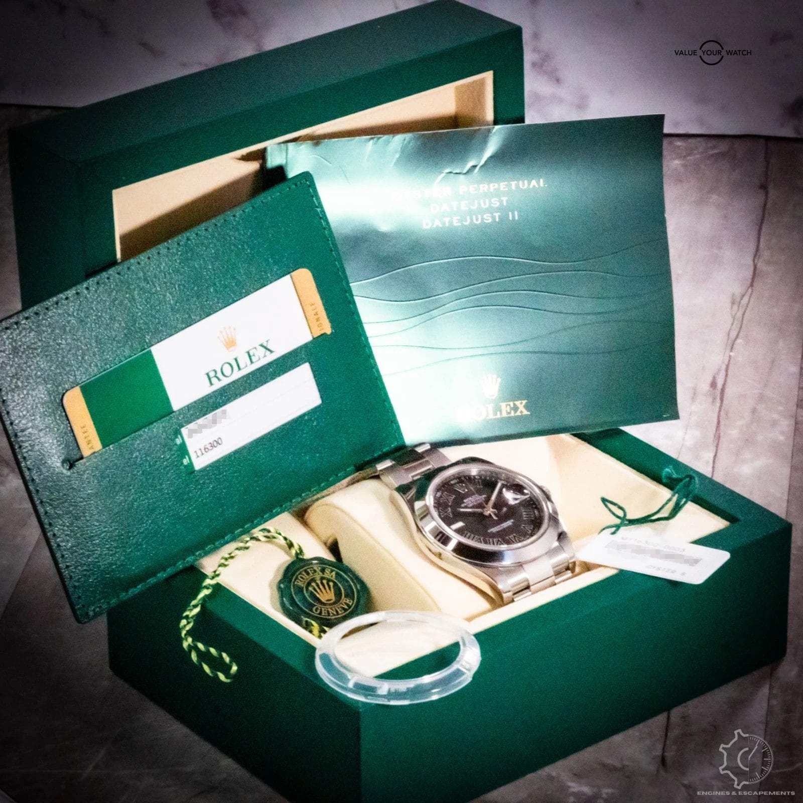 The 2016 RLX Datejust II 116300 with the discontinued grey Roman dial is a rare modern classic that captures the essence of understated elegance. Its 41mm stainless steel case, smooth bezel, and Oyster bracelet give it a clean, contemporary profile, robust enough for daily wear, yet refined enough for any occasion.