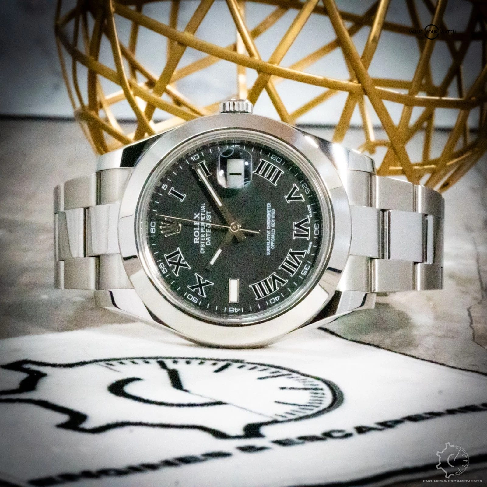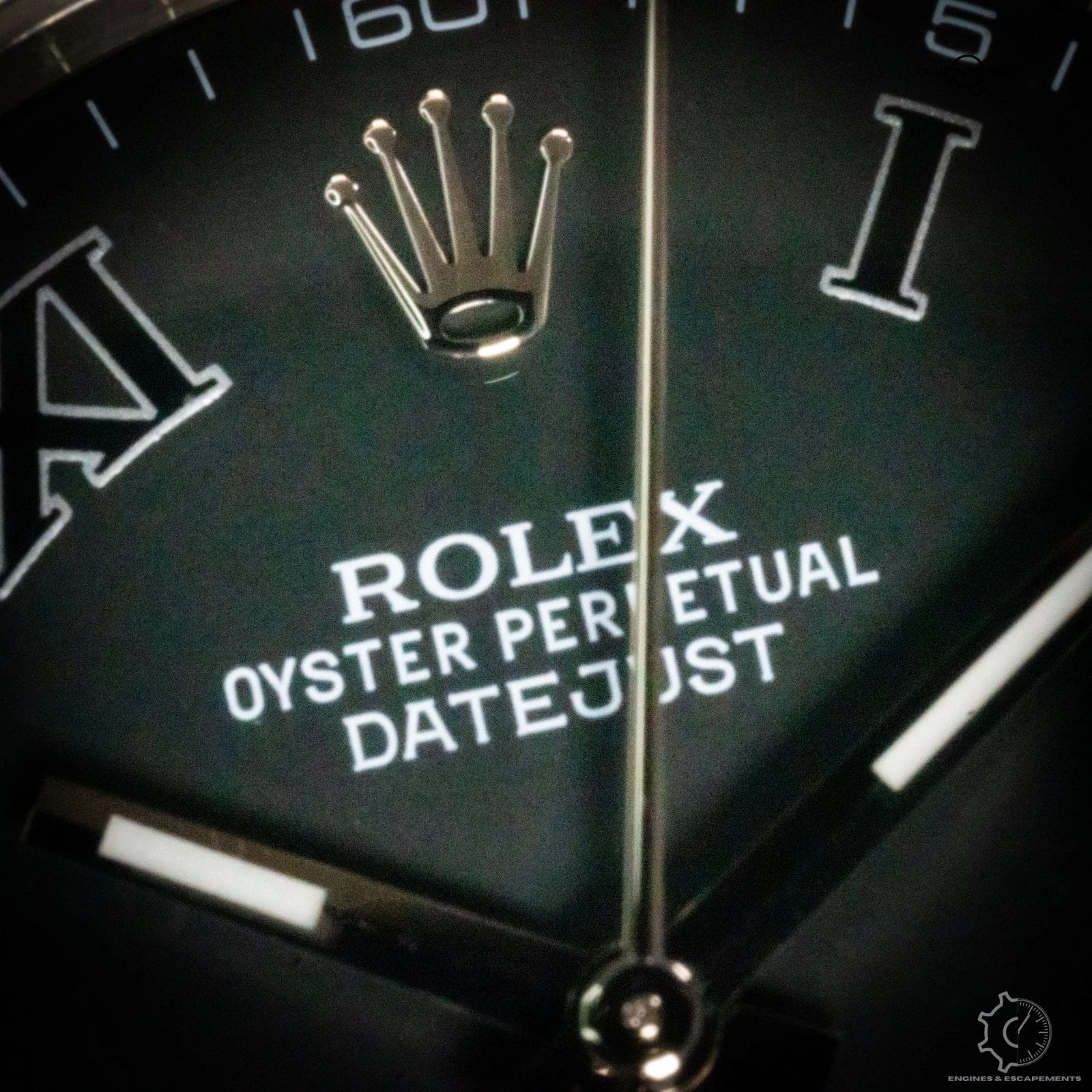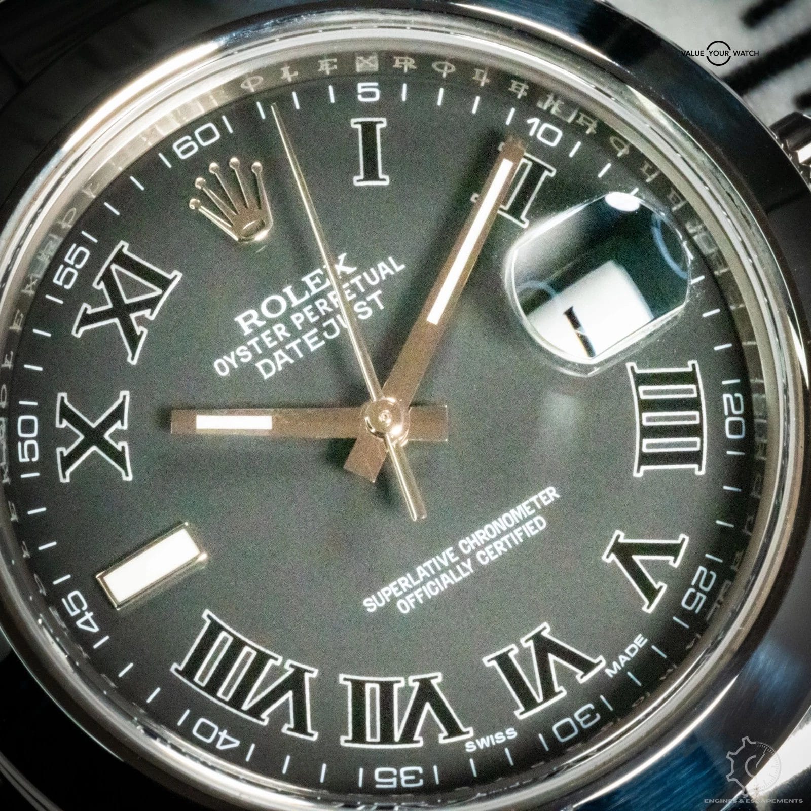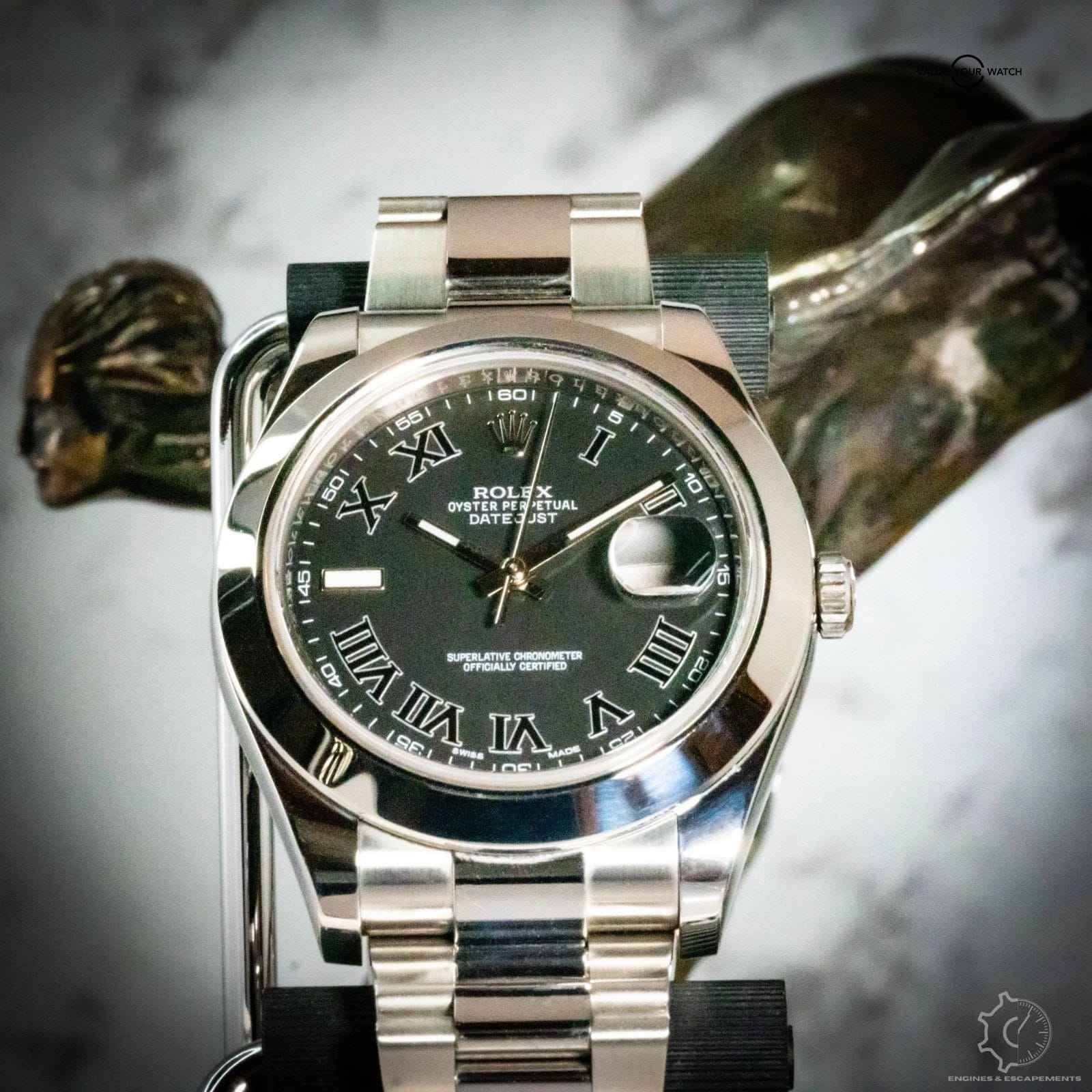 The sunray grey dial, adorned with bold Roman numerals, sets this model apart from the rest of the Datejust line. Discontinued and increasingly sought after, this dial configuration adds a layer of exclusivity, making it a standout for collectors who value subtle rarity over flash.
